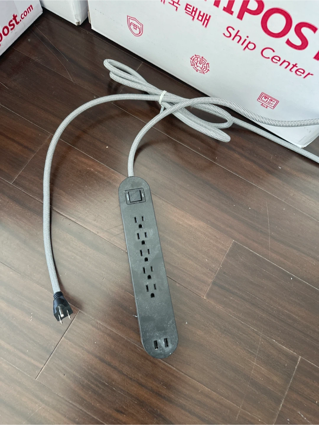 This black power strip has six standard outlets and two USB ports for charging devices. It features a reset switch on the top. The cord is grey and white braided with a black plug. It's a handy item for expanding your plug capacity!