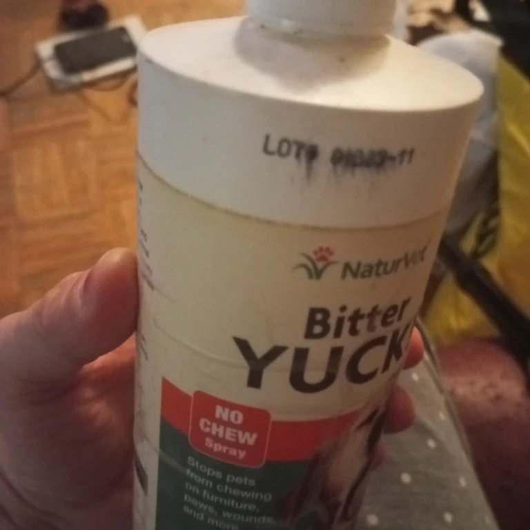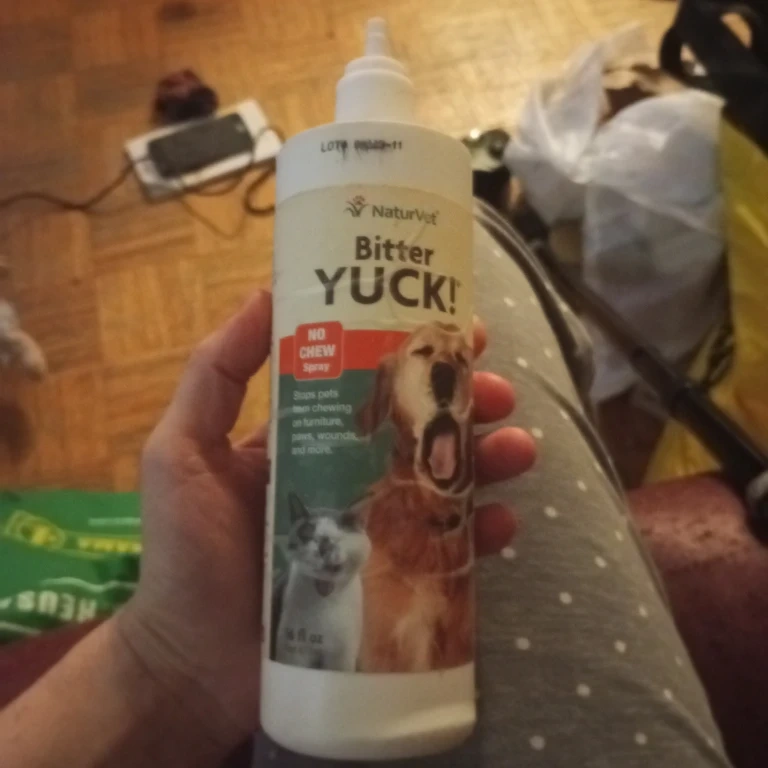 This NaturVet Bitter Yuck! No Chew spray comes in a 16 fl oz bottle. It stops pets from chewing on furniture, paws, wounds, and more. It's a safe way to deter chewing!