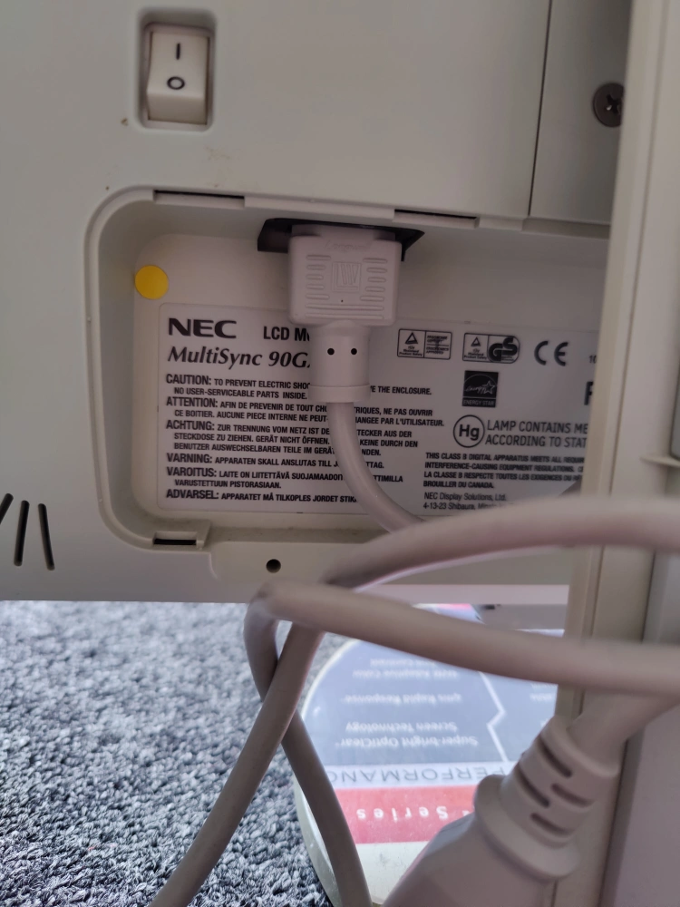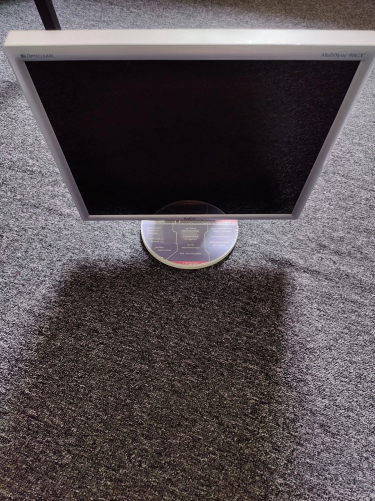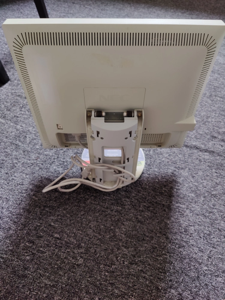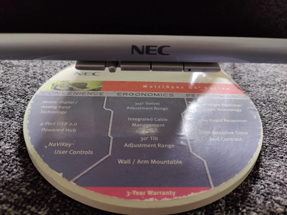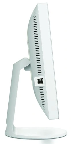 Monitor comes with the power cord. Has a swivel base and can be tilted. Also has an integrated cable management system anfd two usbs for mouse, keyboard, etc.