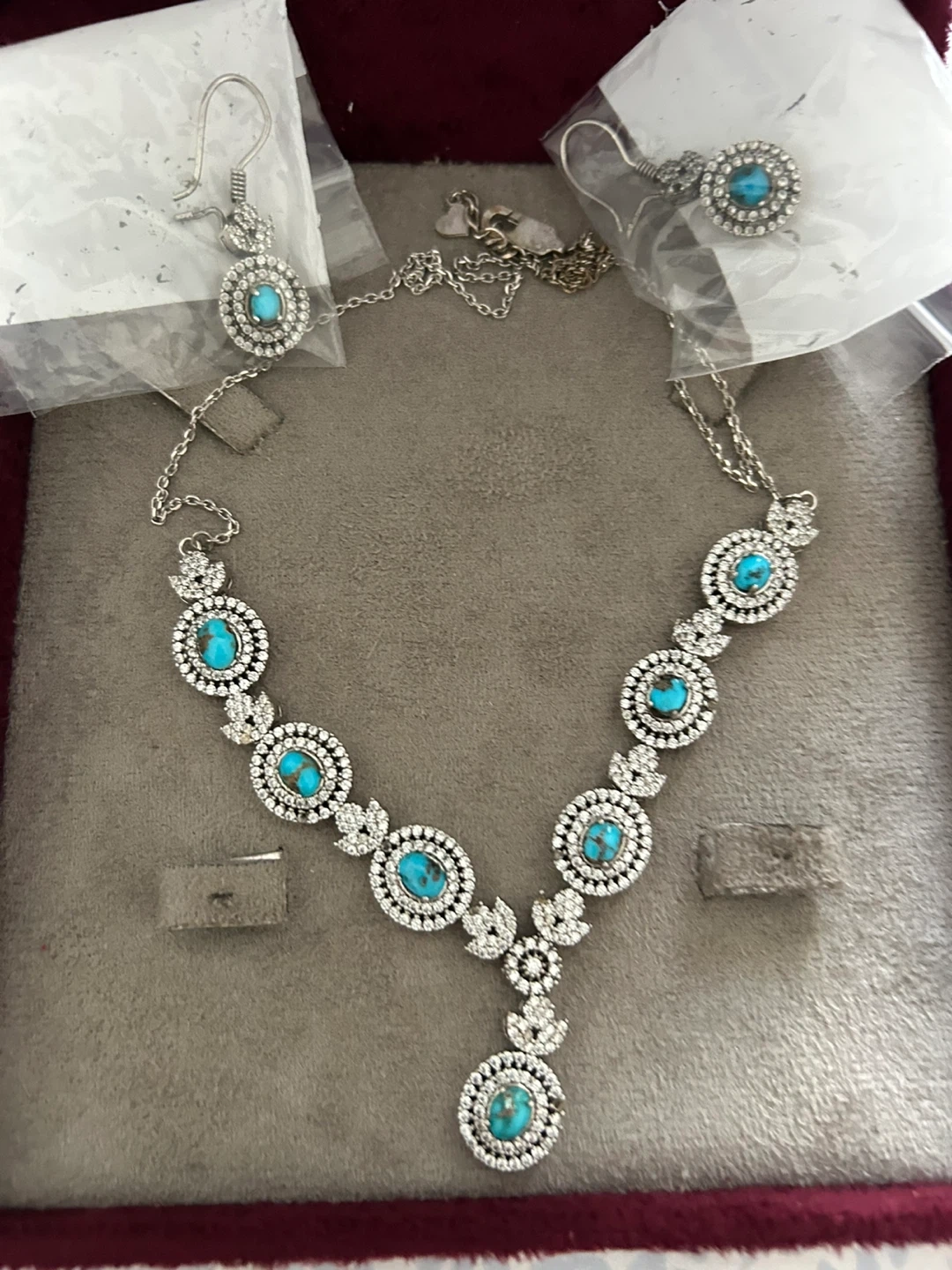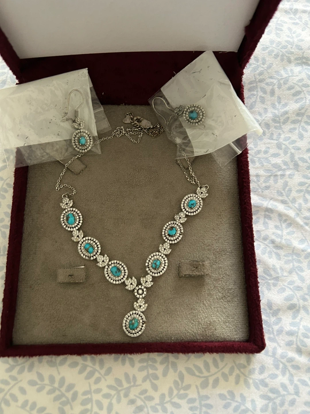 218Beautiful necklace and earrings set with turquoise-coloured stones. They come in a box, ready to be gifted or enjoyed! The set is in excellent condition and would make a lovely addition to any jewelry collection 925 selver