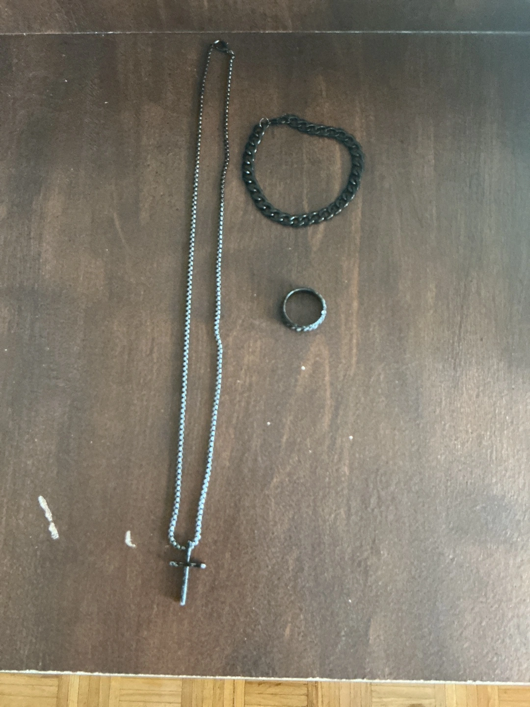 Selling a set of dark-toned accessories! This includes a necklace with a cross pendant, a chain bracelet, and a ring. They're in good condition and would make a great addition to your collection