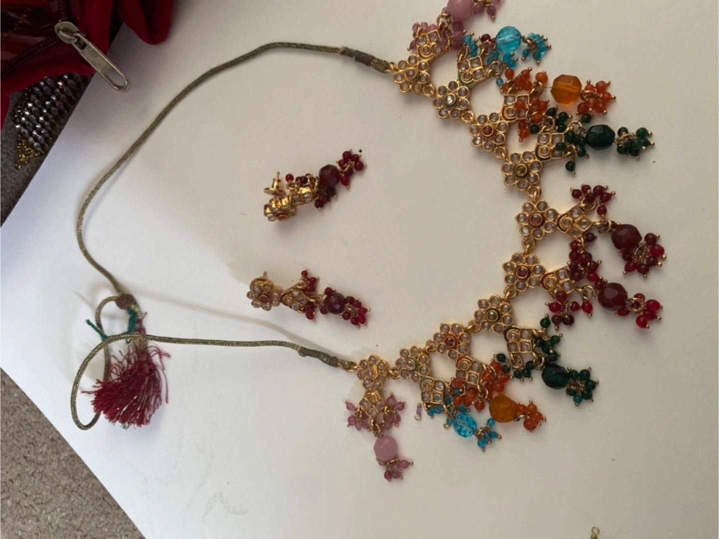 Here's a beautiful necklace and earring set! The necklace features a gold-tone chain with colourful beaded details. The matching earrings have a similar design, making it a perfect set for any occasion