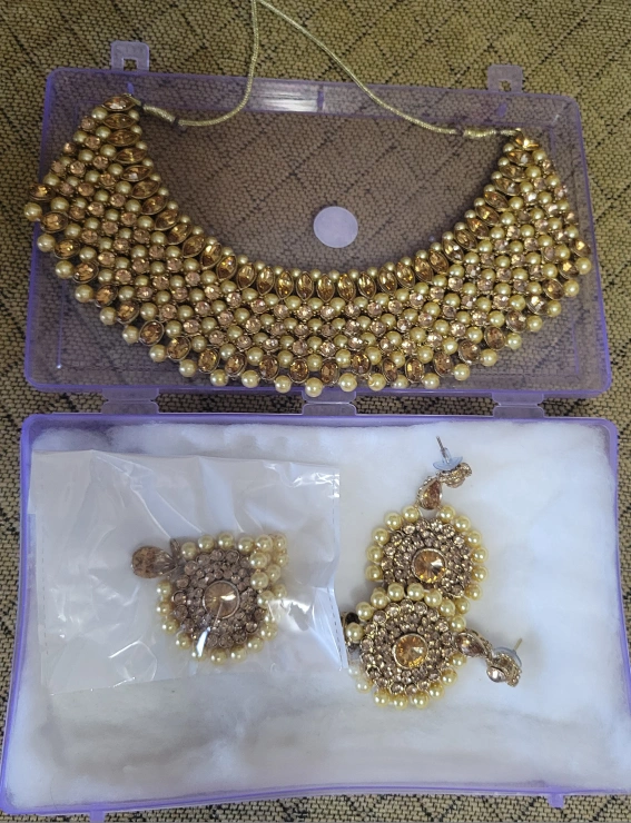 10Beautiful necklace and earrings set in a gold tone with pearl accents. Comes in the original box, perfect for gifting or keeping it safe when not in use! The set includes a necklace and a pair of matching earrings.
