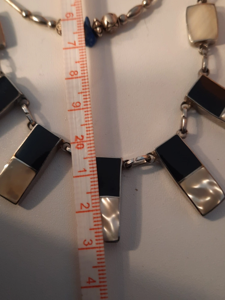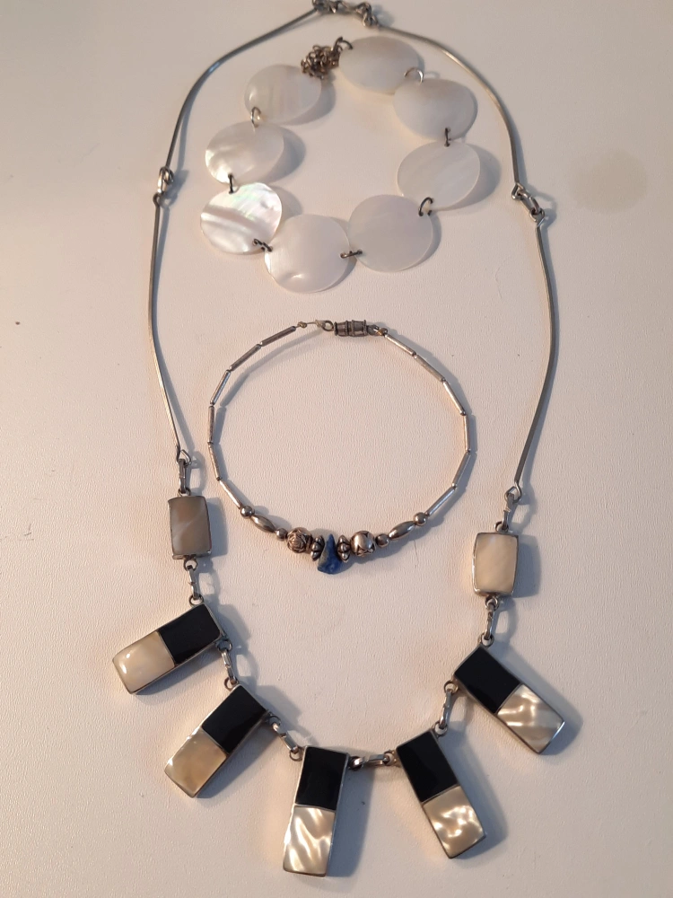 Selling a lot of three necklaces! One features black and white rectangular pendants, another has mother-of-pearl circles,with 925 clasp and the last is a beaded liquid silver bracelet
