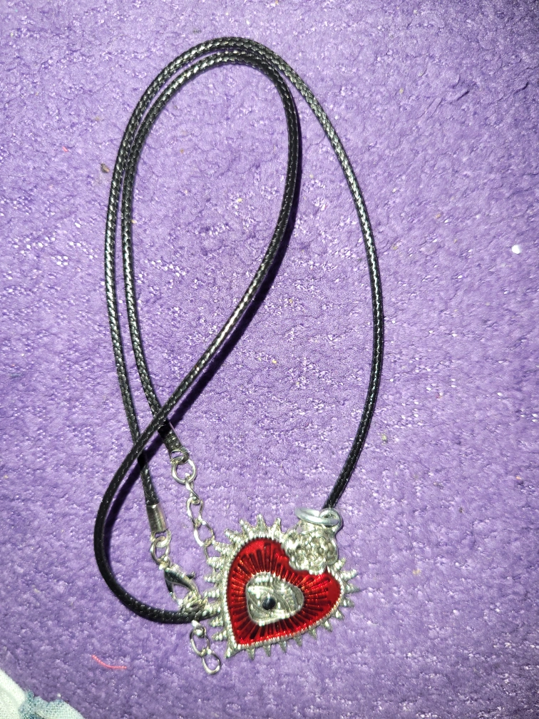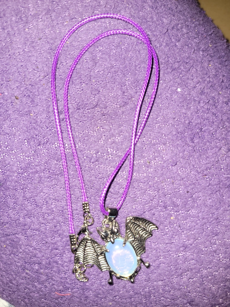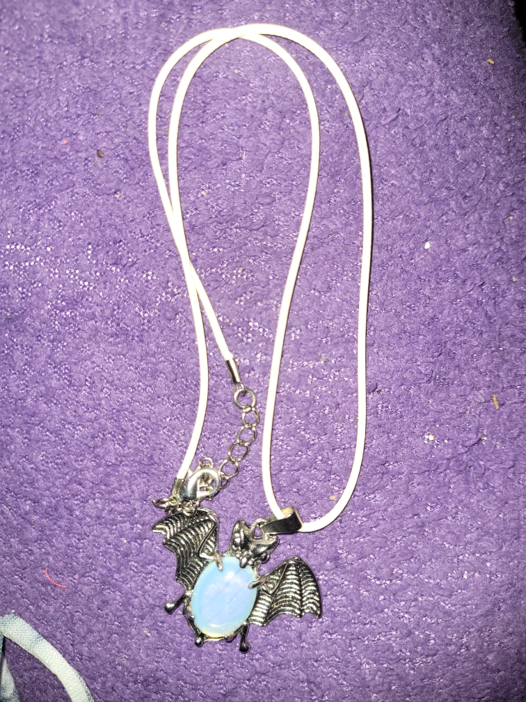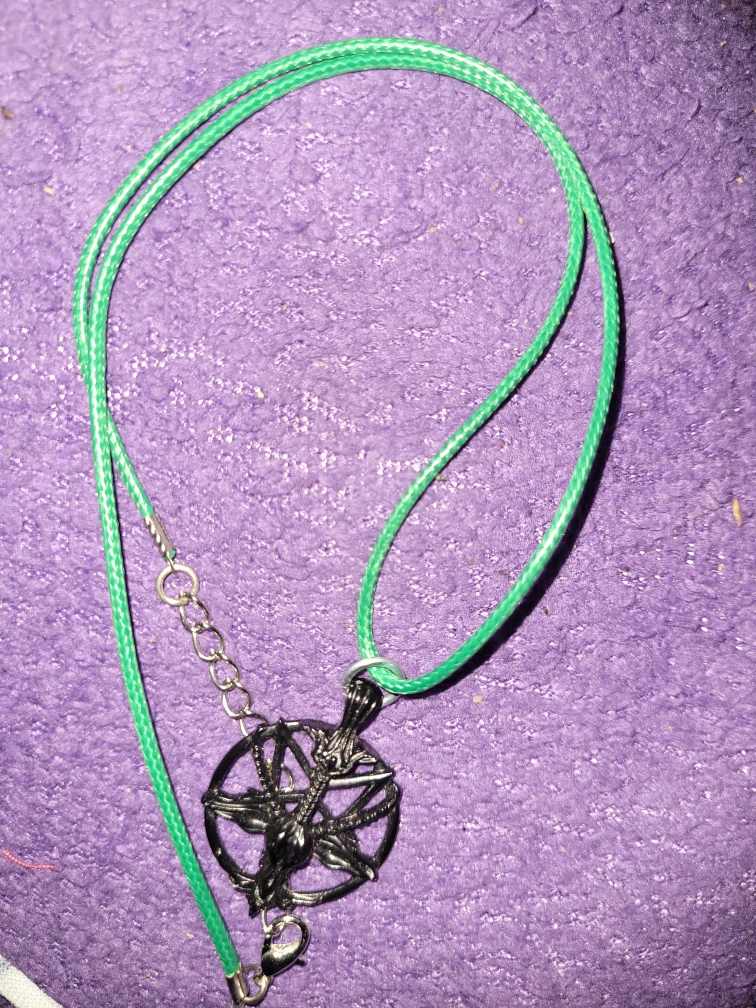 33A collection of necklaces with various pendants. There's a heart, a pentagram, a spider, and a bat. Perfect for adding a bit of flair to your outfit each necklace is $3 each the small charm bracelet is $6