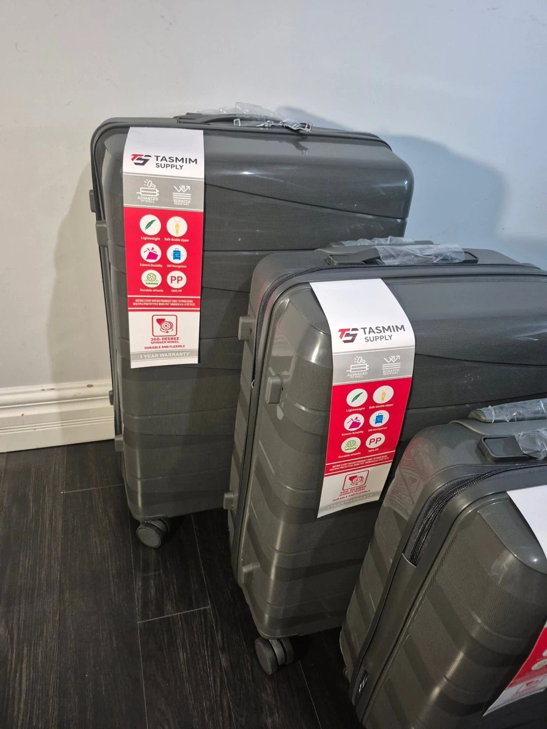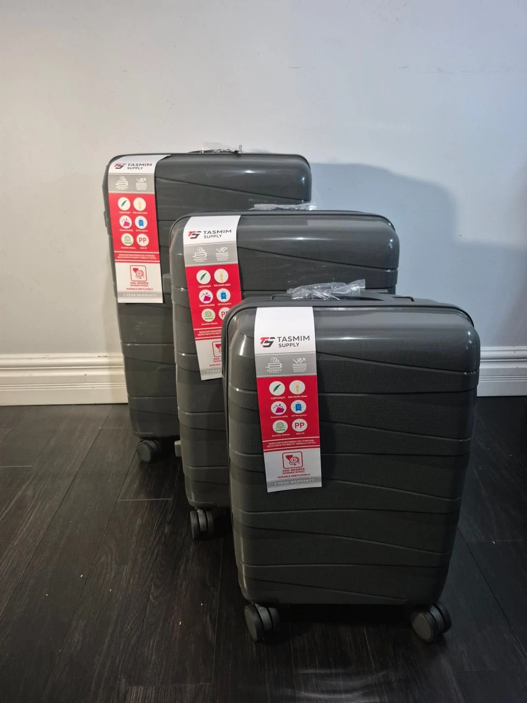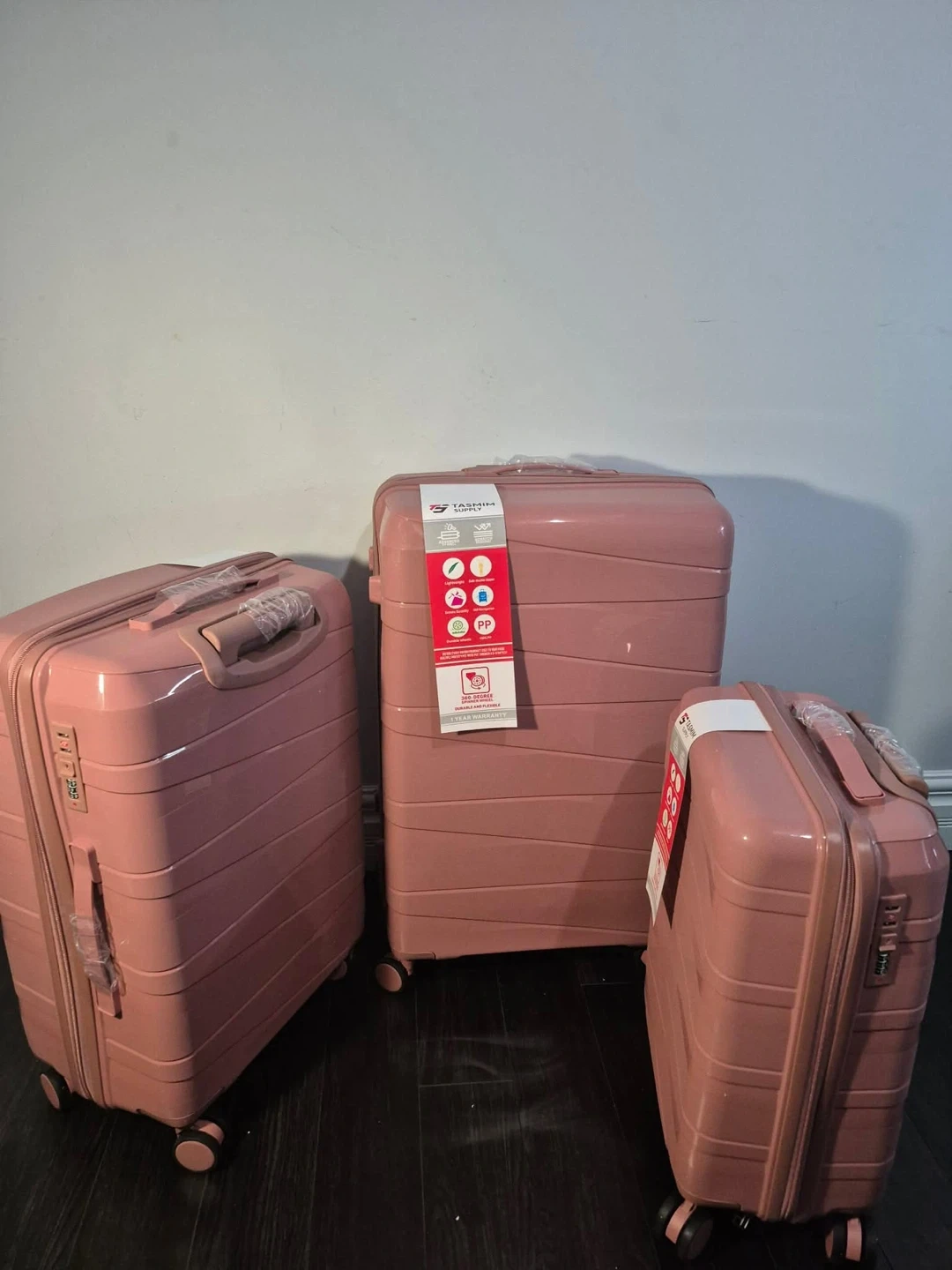 This is a 3-piece luggage set from Tasmim Supply. It's made of durable PP material. The suitcases are lightweight and water-resistant. They're perfect for any travel needs!