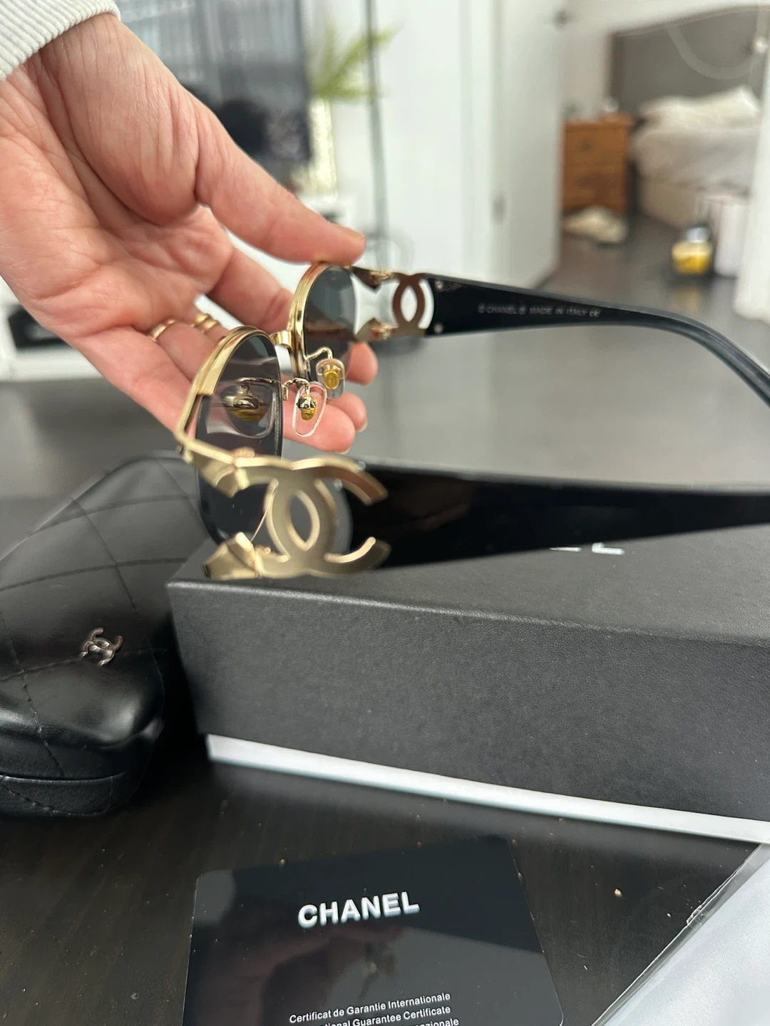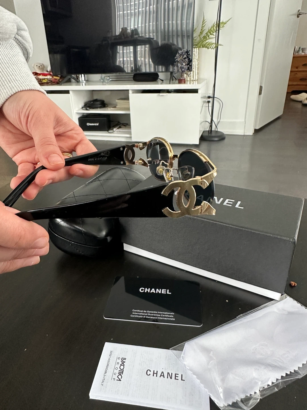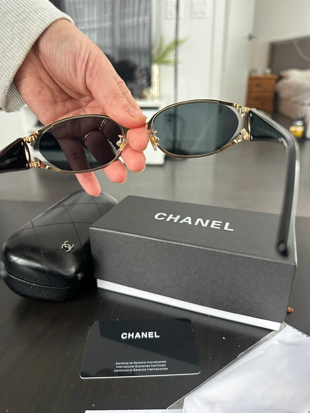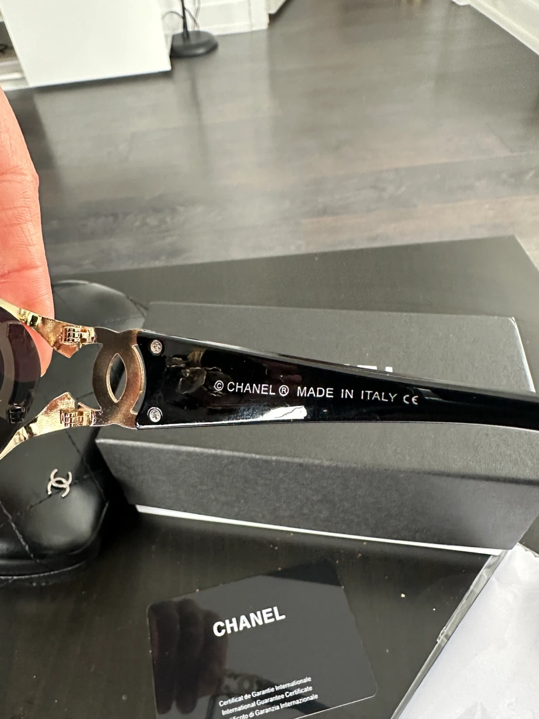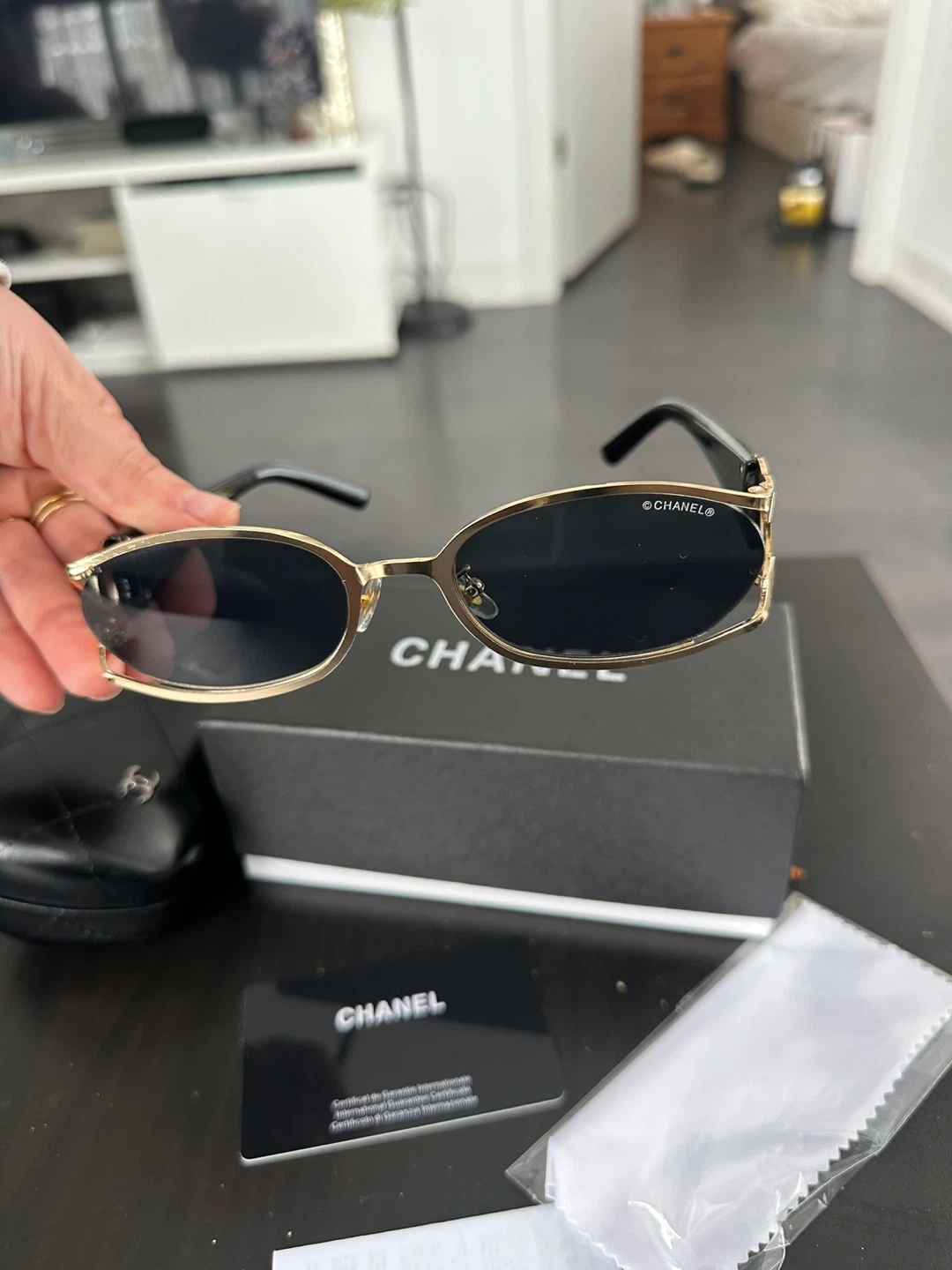 Authentic CHANEL sunglasses in a chic gold and black oval design. They're made in Italy and come with the original box, case, and authenticity card. Protect your eyes in style!