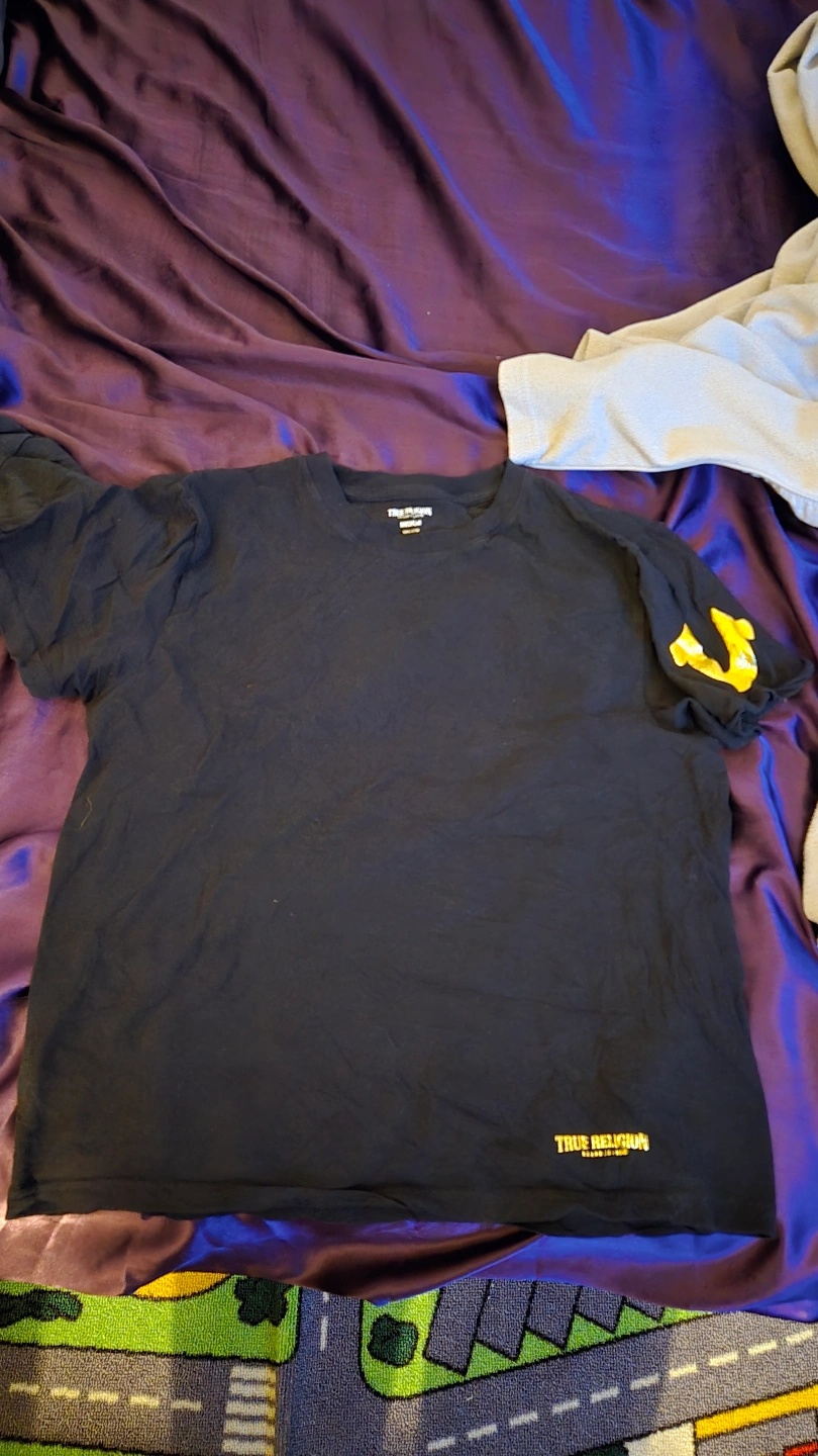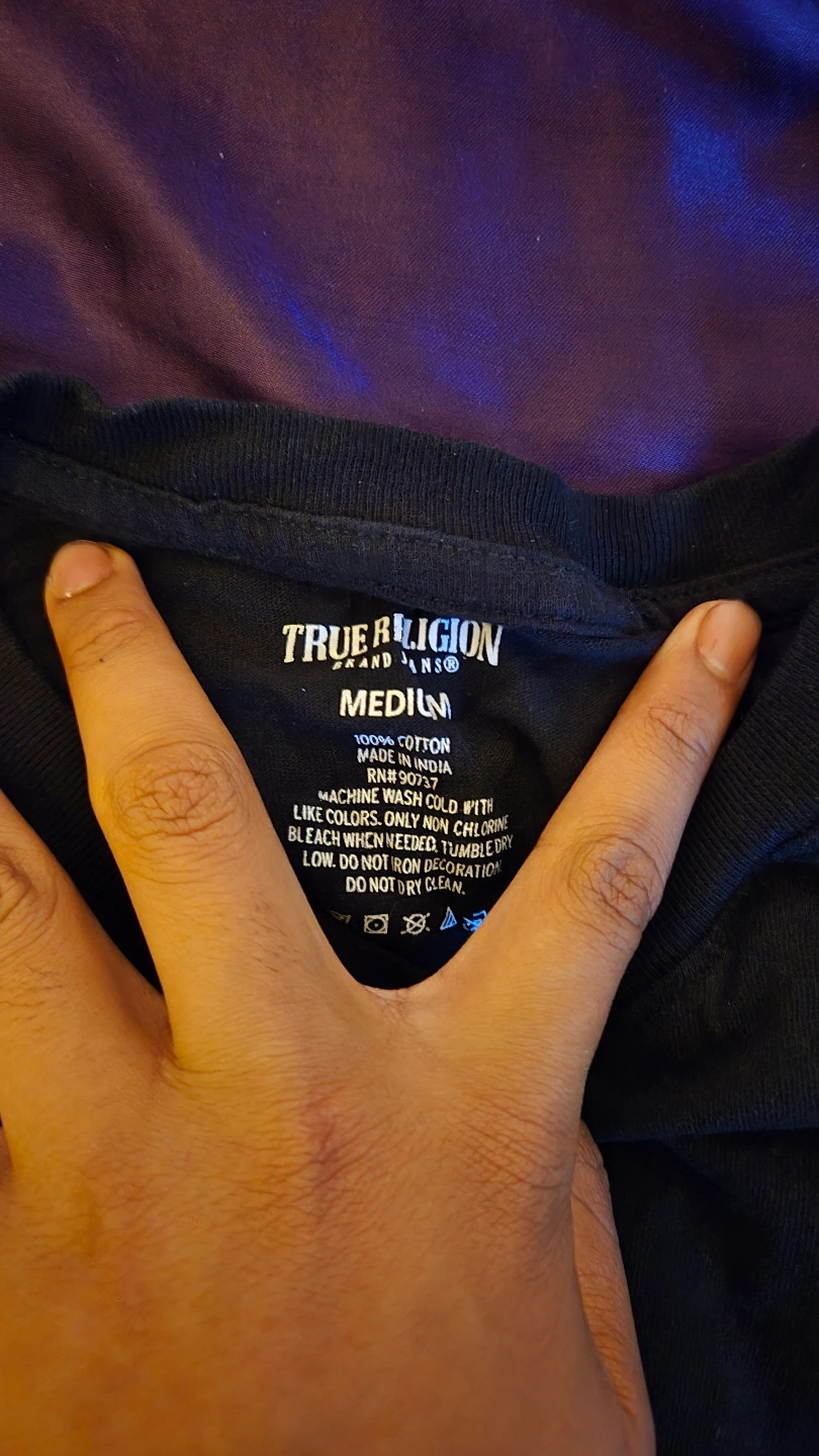 Black True Religion t-shirt. Small embroidered logo on sleeve. Size medium. 100% cotton. Machine wash cold. fits small even if it says medium