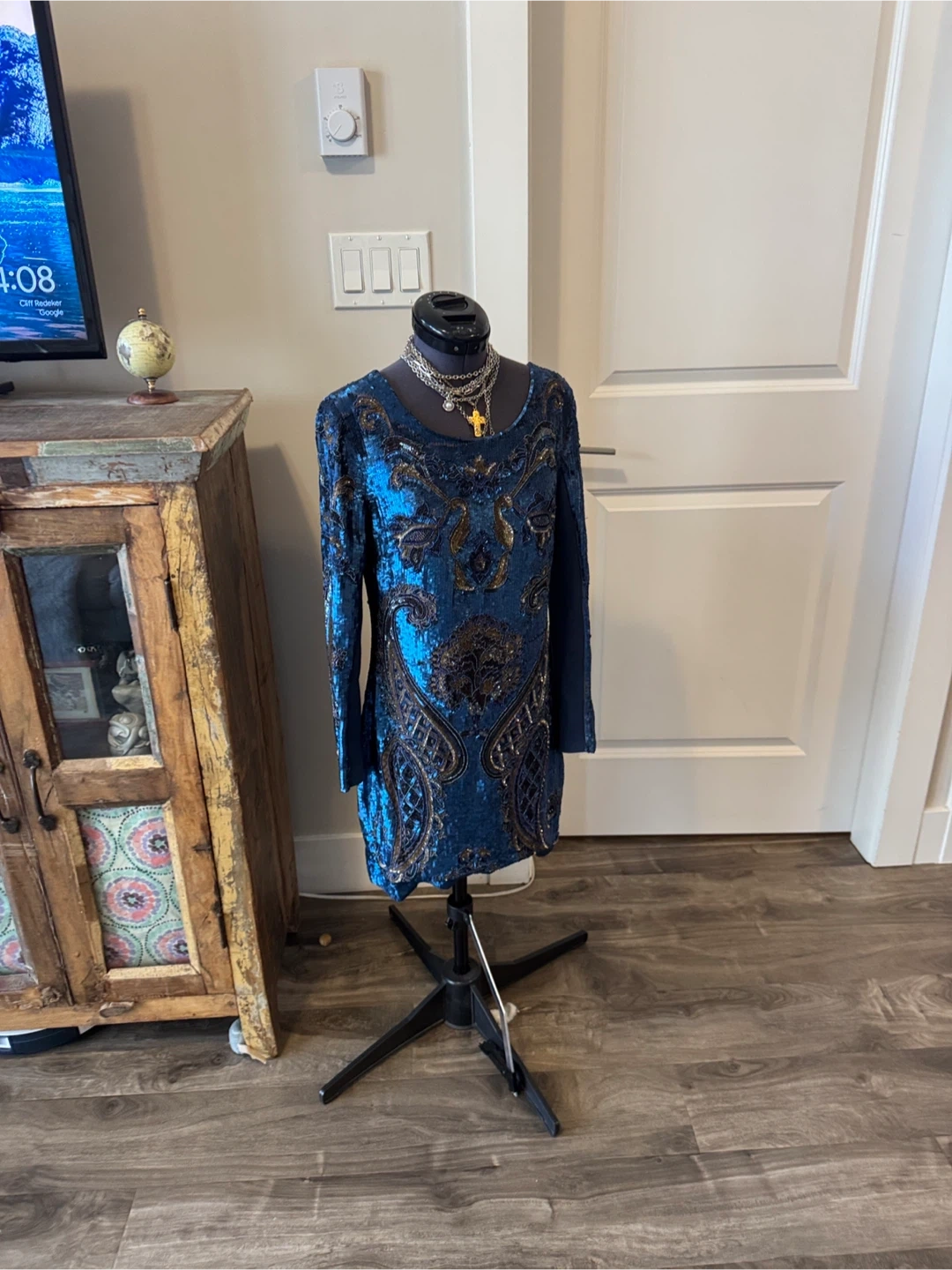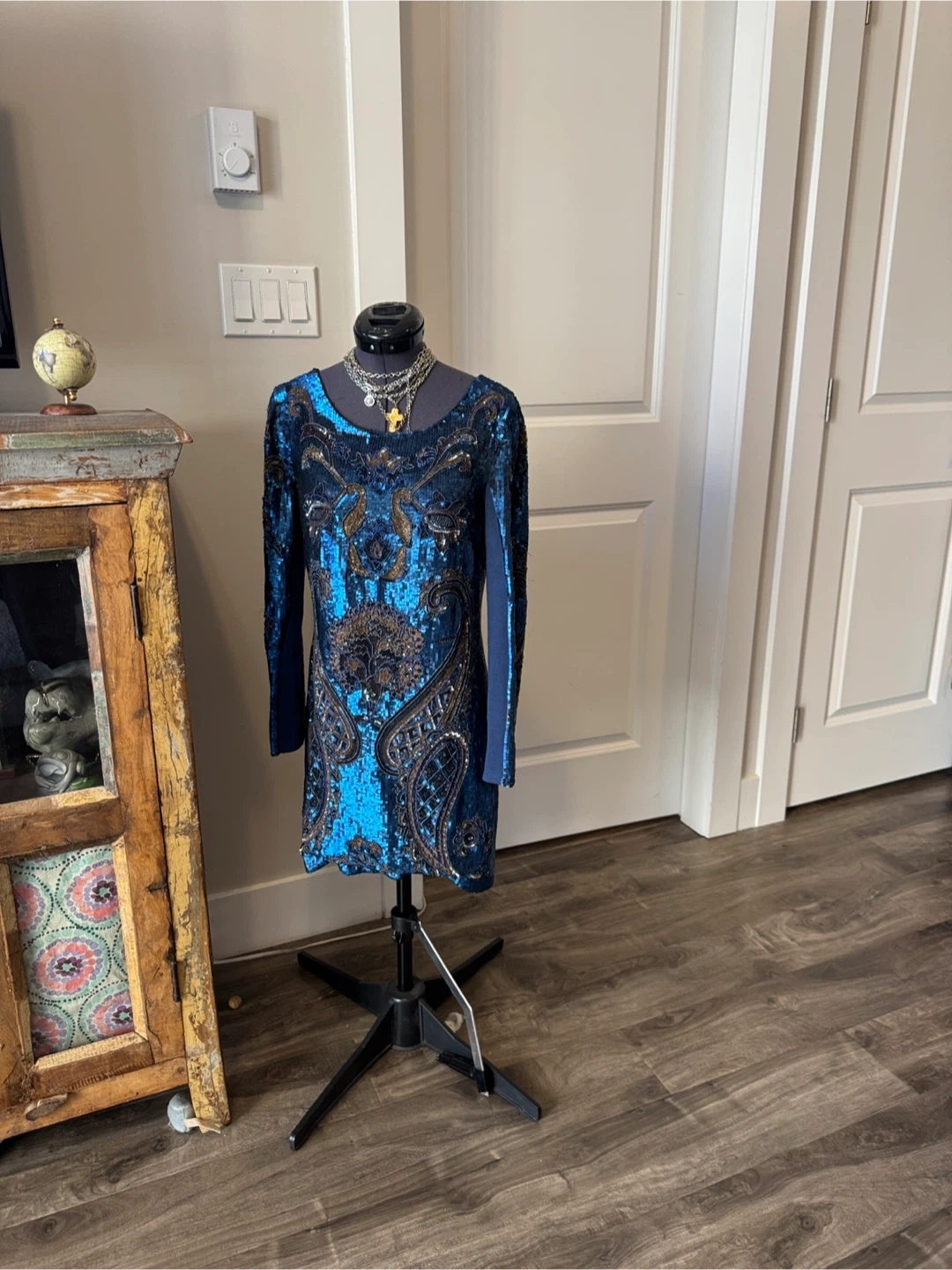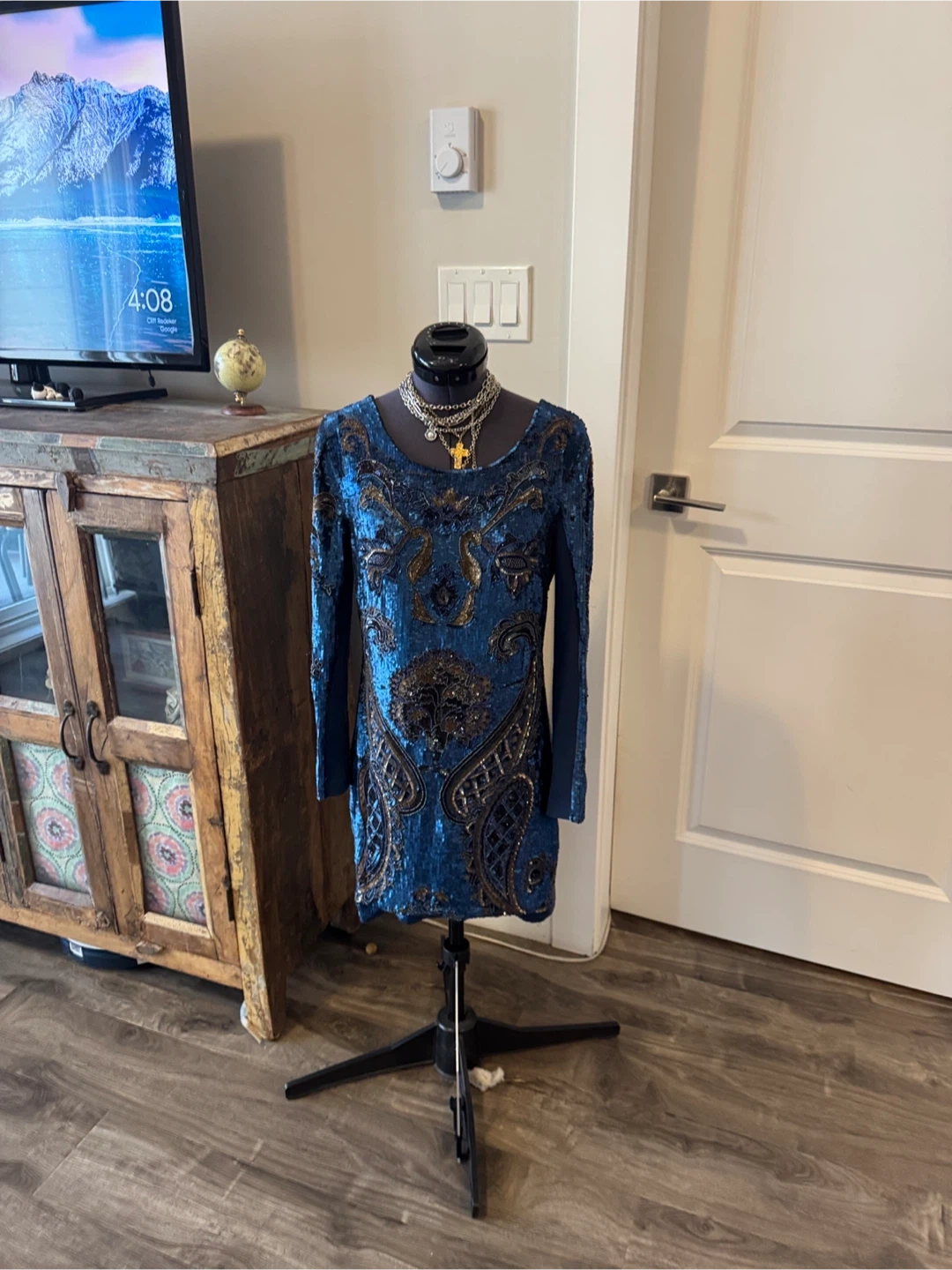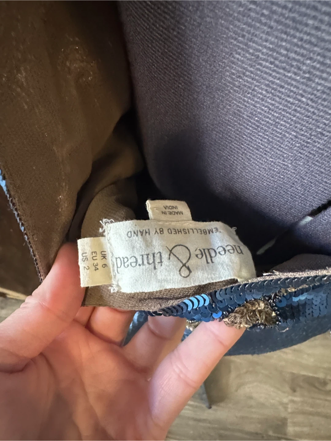 Needle & thread beeded dress - xs-small A few missing beads & loose threads. But not noticeable wearing & reflective in low price. Great holiday or special occasion dress. Beaded through put except under arms. Lined. Retail $400+. Color avail blue & gold Pit to pit 15” Length 29.5” Sleeves 19”