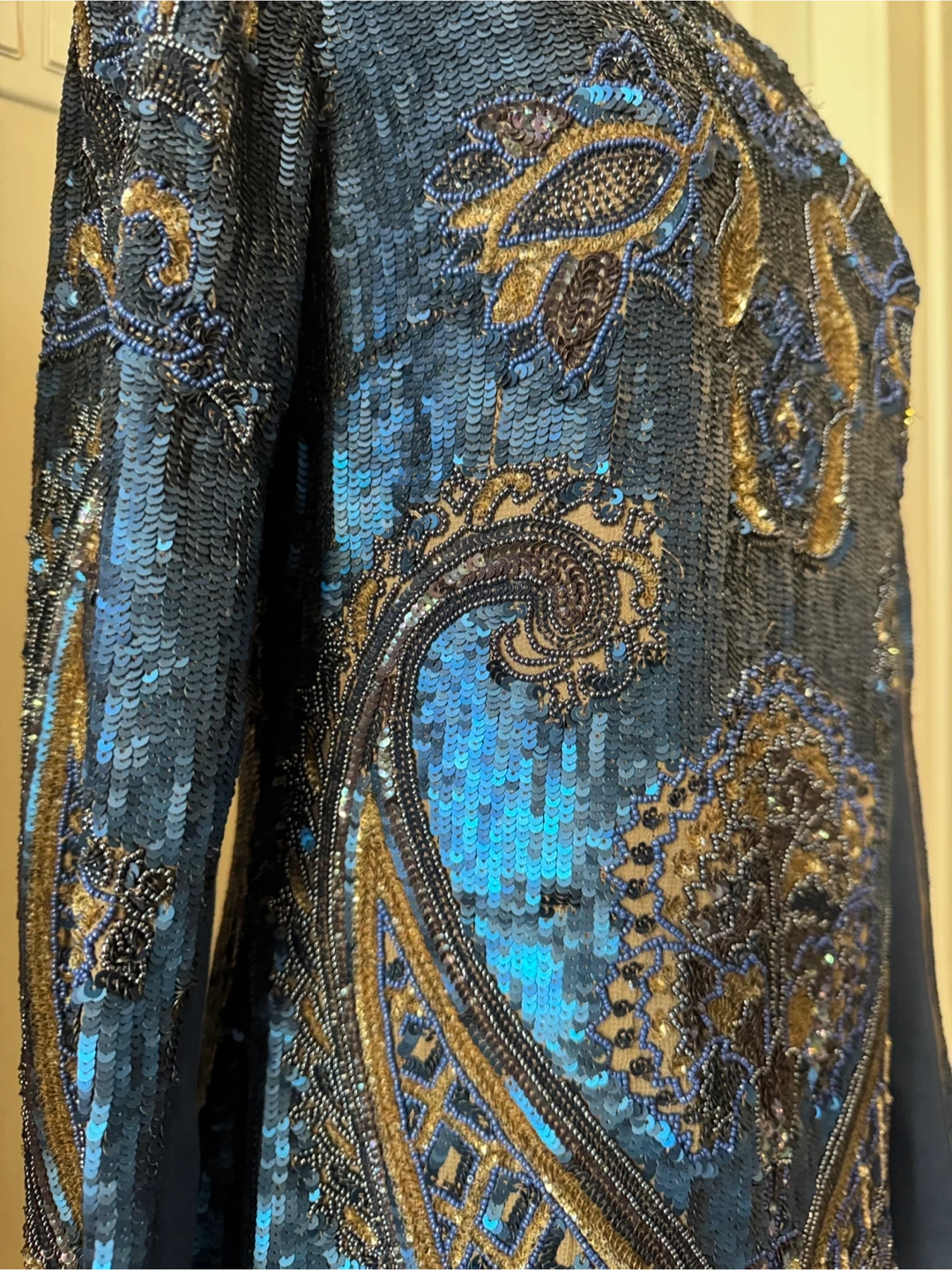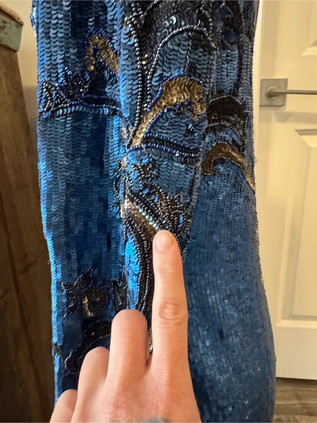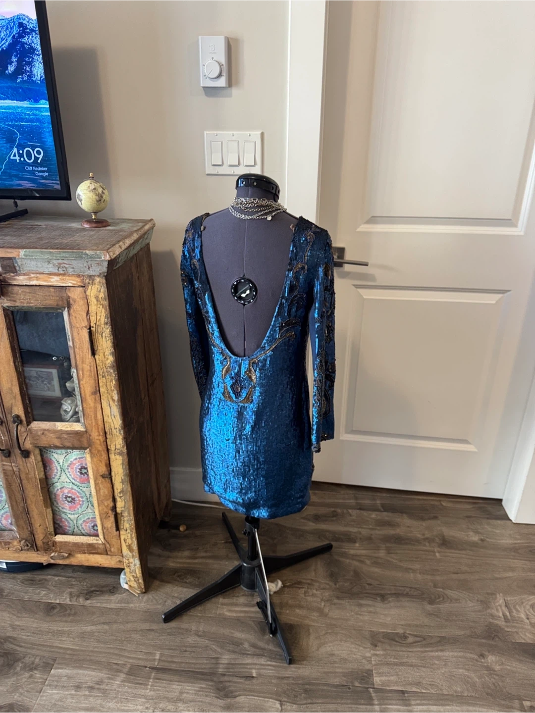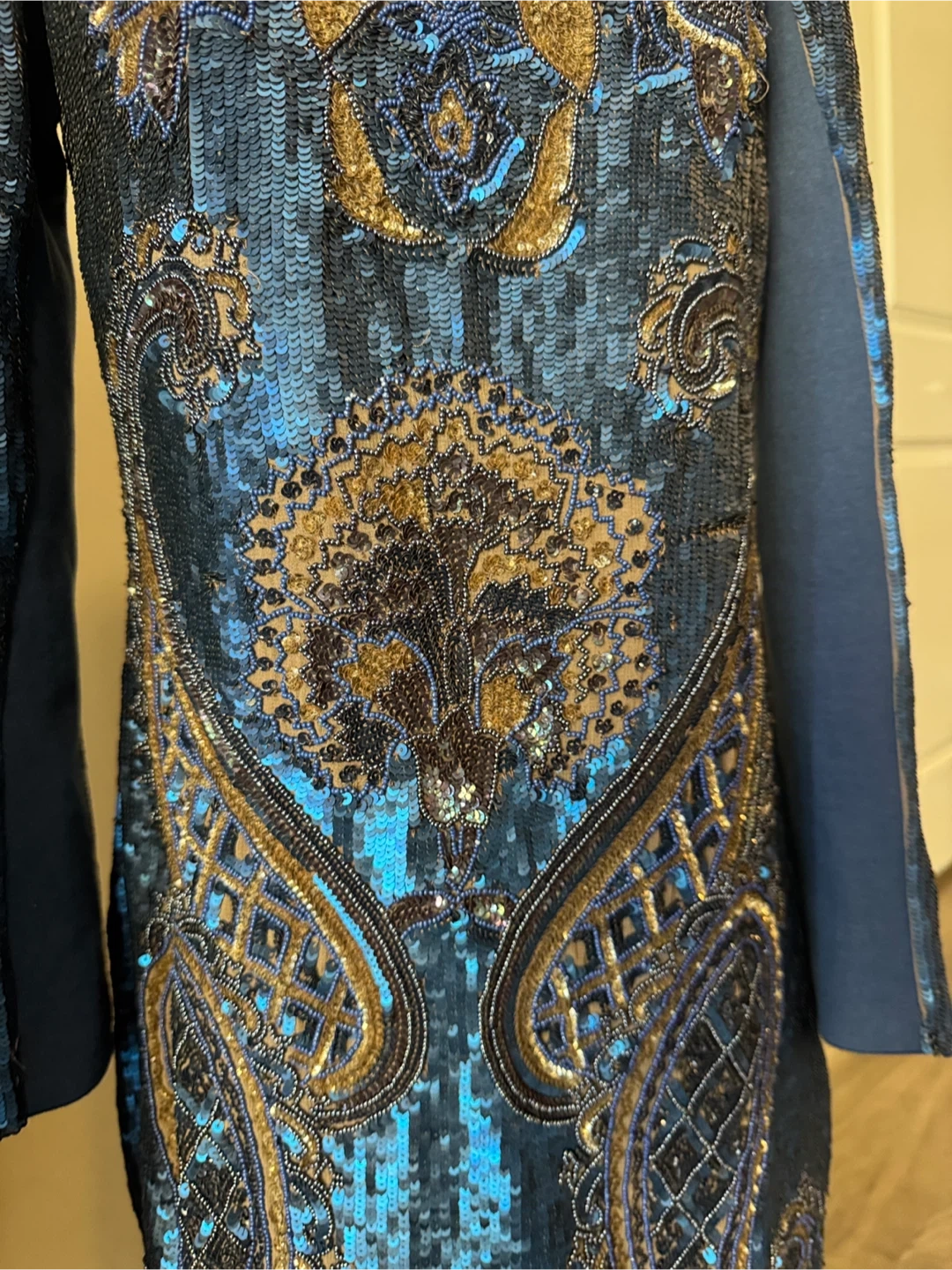 Needle & thread beeded dress - xs-small A few missing beads & loose threads. But not noticeable wearing & reflective in low price. Great holiday or special occasion dress. Beaded through put except under arms. Lined. Retail $400+. Color avail blue & gold Pit to pit 15” Length 29.5” Sleeves 19”