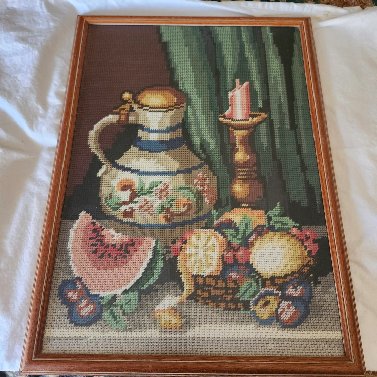 A lovely framed needlepoint still life piece! The artwork features a pitcher, candle, and fruit arrangement. The frame is in good condition and ready to hang