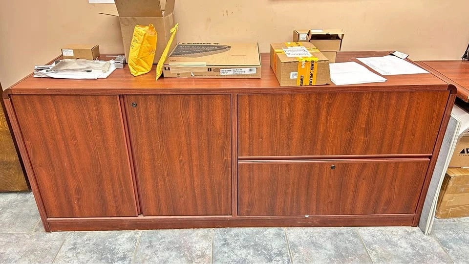 This is an office cabinet with a beautiful wood grain finish and ample storage. The cabinet is in used condition, showing some signs of wear, but is fully functional and ready to organize your office space. It has a spacious interior with adjustable shelves, durable wood construction, two doors with sleek handles, and one lateral drawer with a key. If the ad is up, it's available!