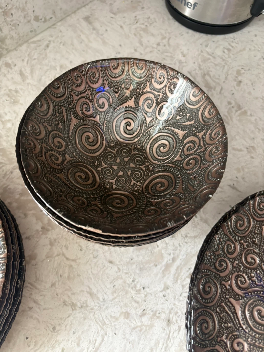 A 5 piece each set of decorative bowls and plates featuring an intricate embossed swirl pattern. This set includes multiple bowls and plates with a coppery bronze finish. They're great for serving snacks or as decorative pieces.