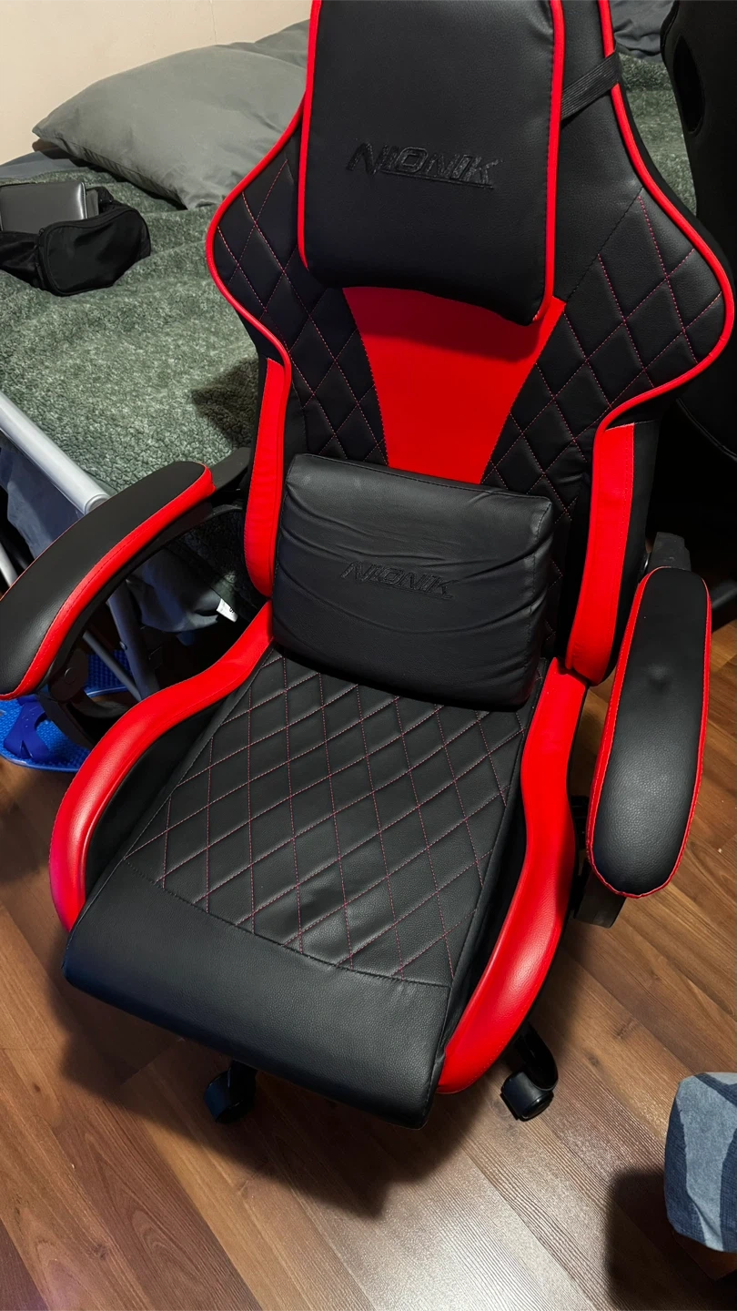 Selling a Neonik gaming chair in great condition! It features a sleek black and red design with comfortable padding. Perfect for long gaming sessions or working from home. It also comes with a headrest and lumbar support pillow for extra comfort