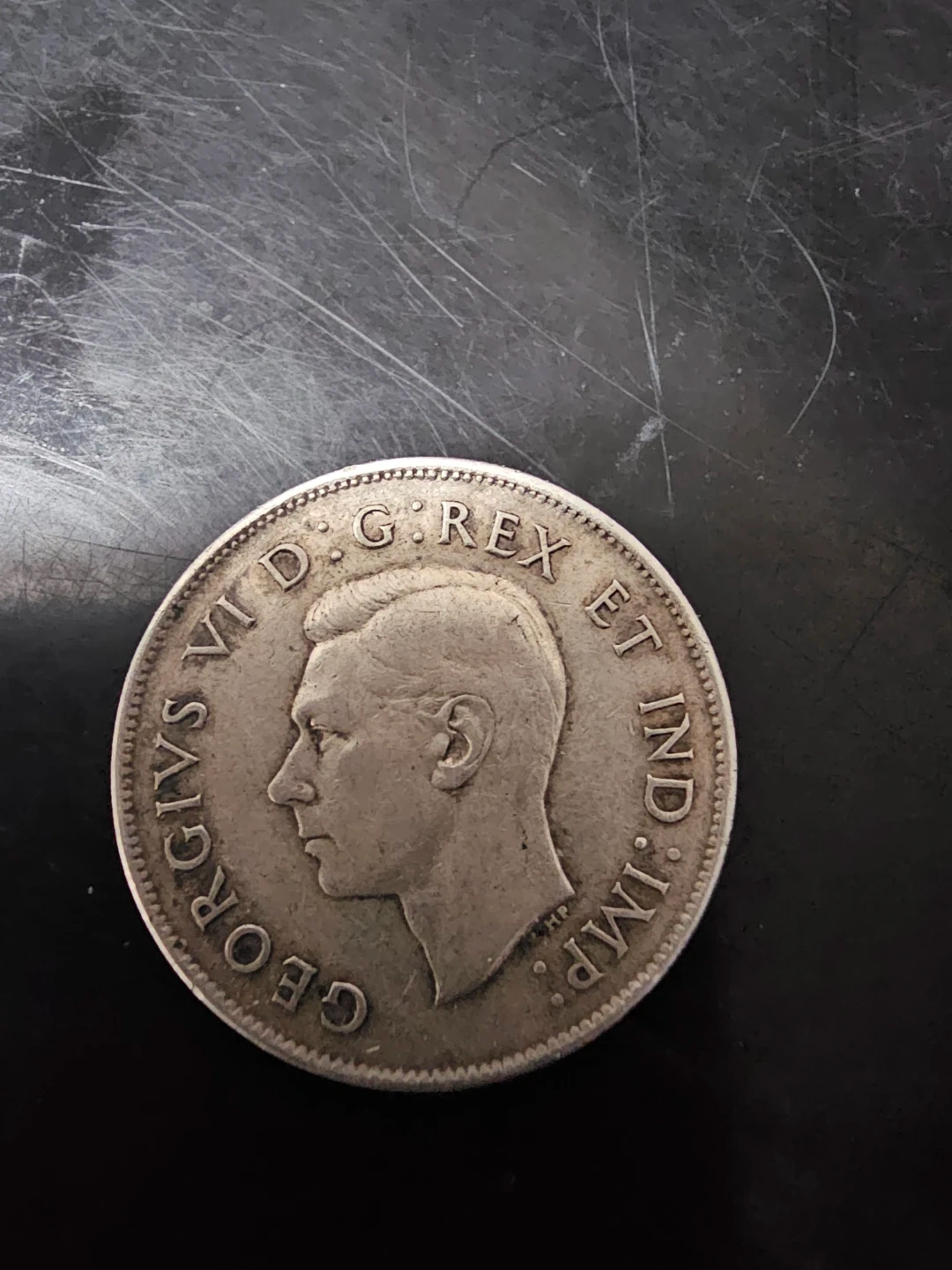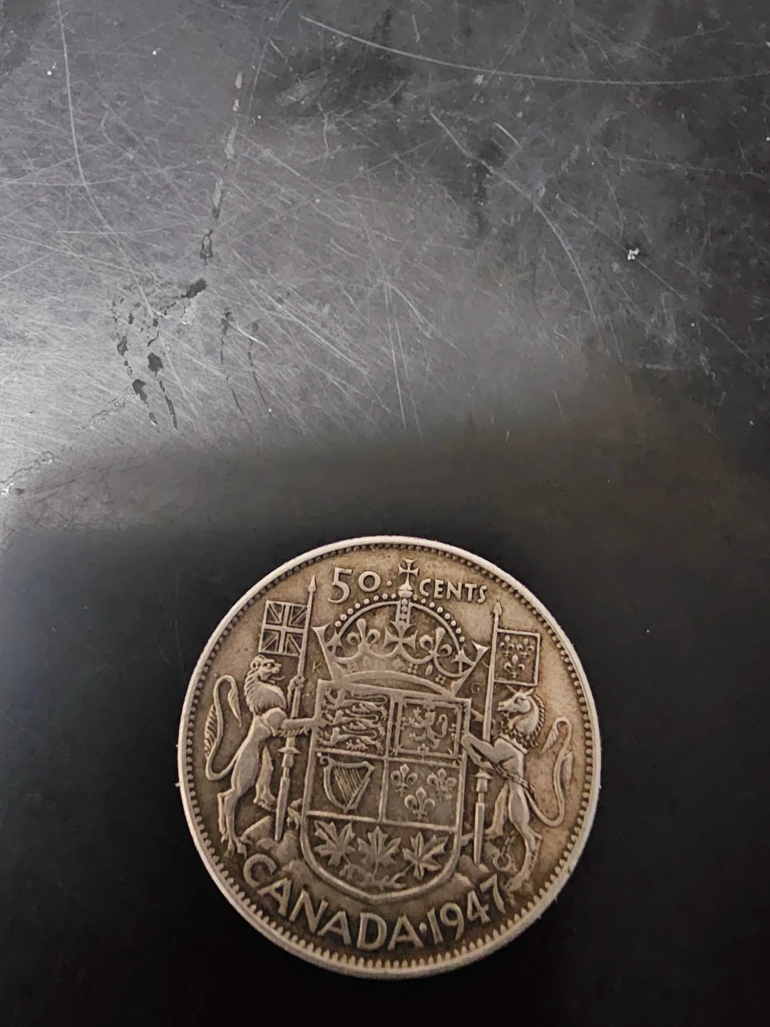 This is a 1947 Canadian 50 cents coin. It features King George VI on the obverse. The reverse displays the Canadian Coat of Arms. A neat piece of history!