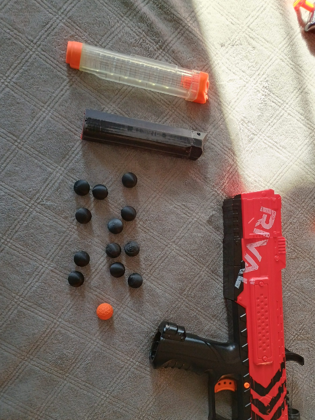 Selling a Nerf Rival blaster in red and black. It comes with ammo and magazines. Ready for some action!