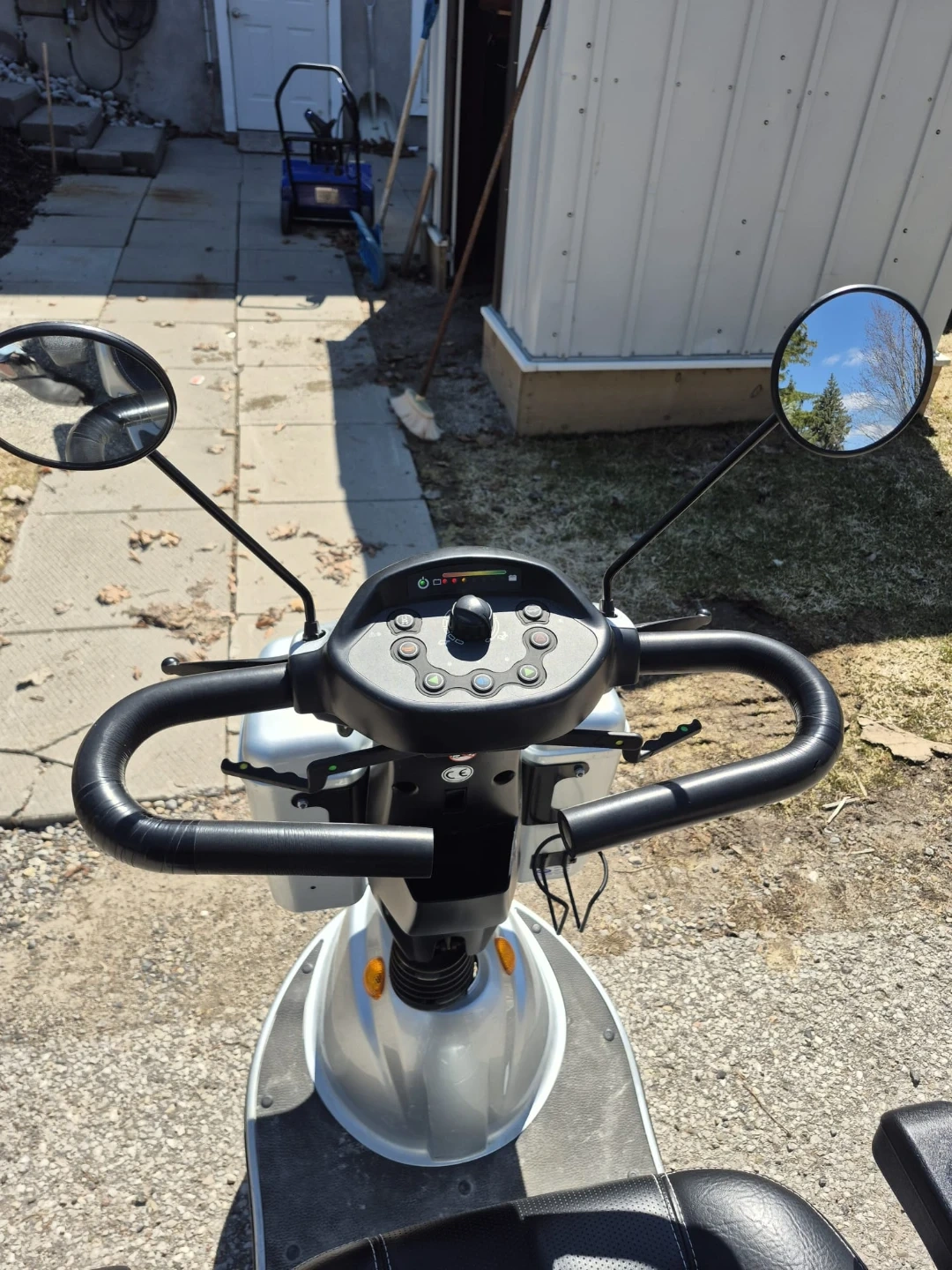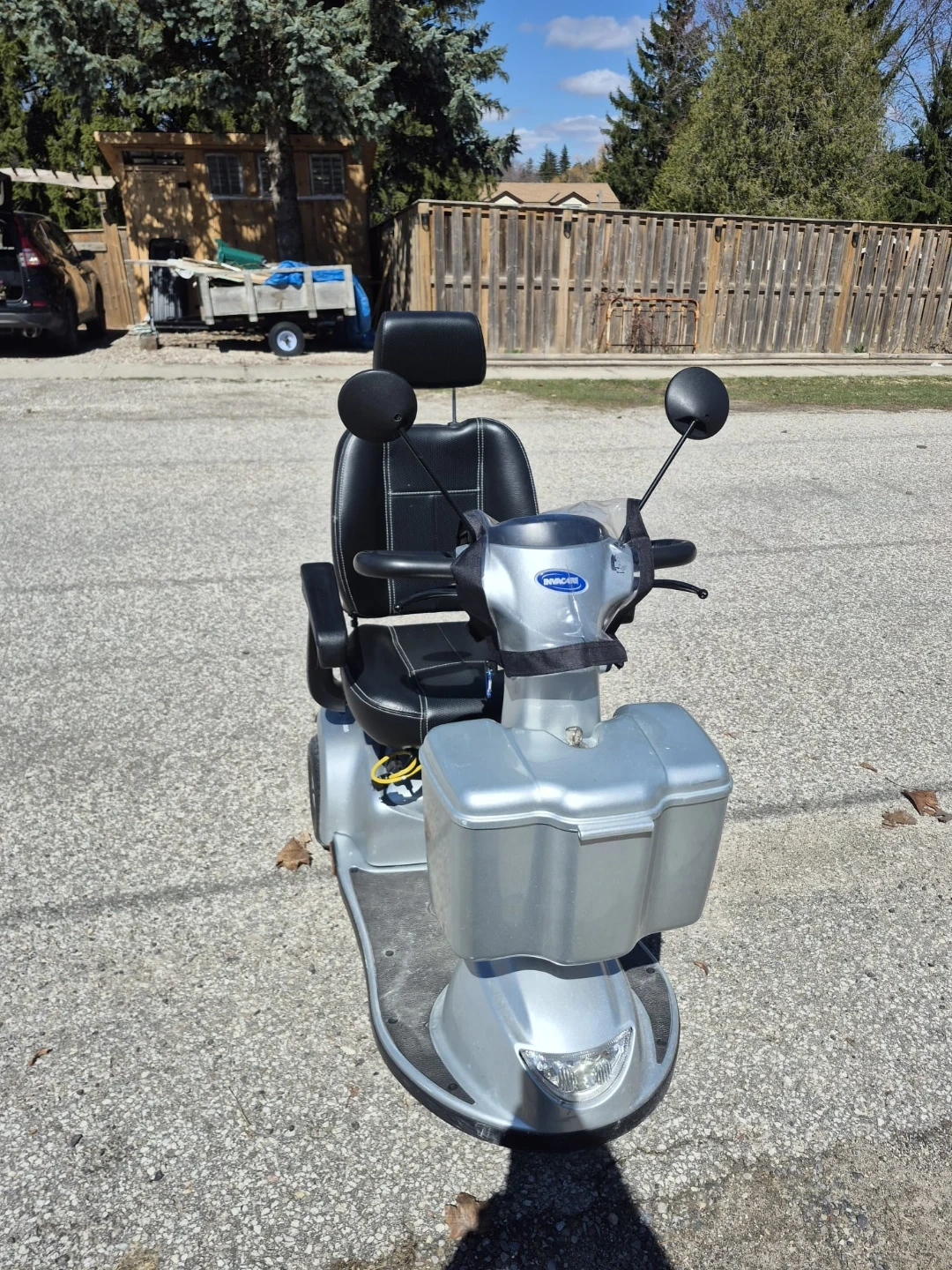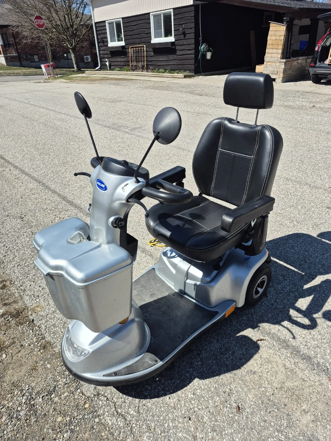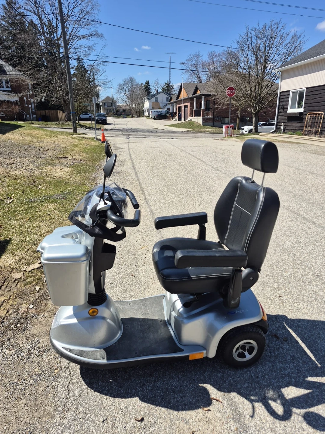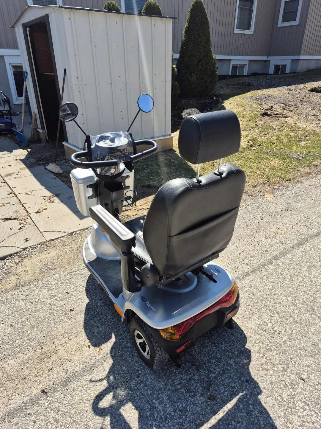 Invacare Pegasus mobility scooter in silver. Features a comfortable black seat and adjustable tiller. This scooter offers reliable mobility assistance. Great for getting around town or on pathways!