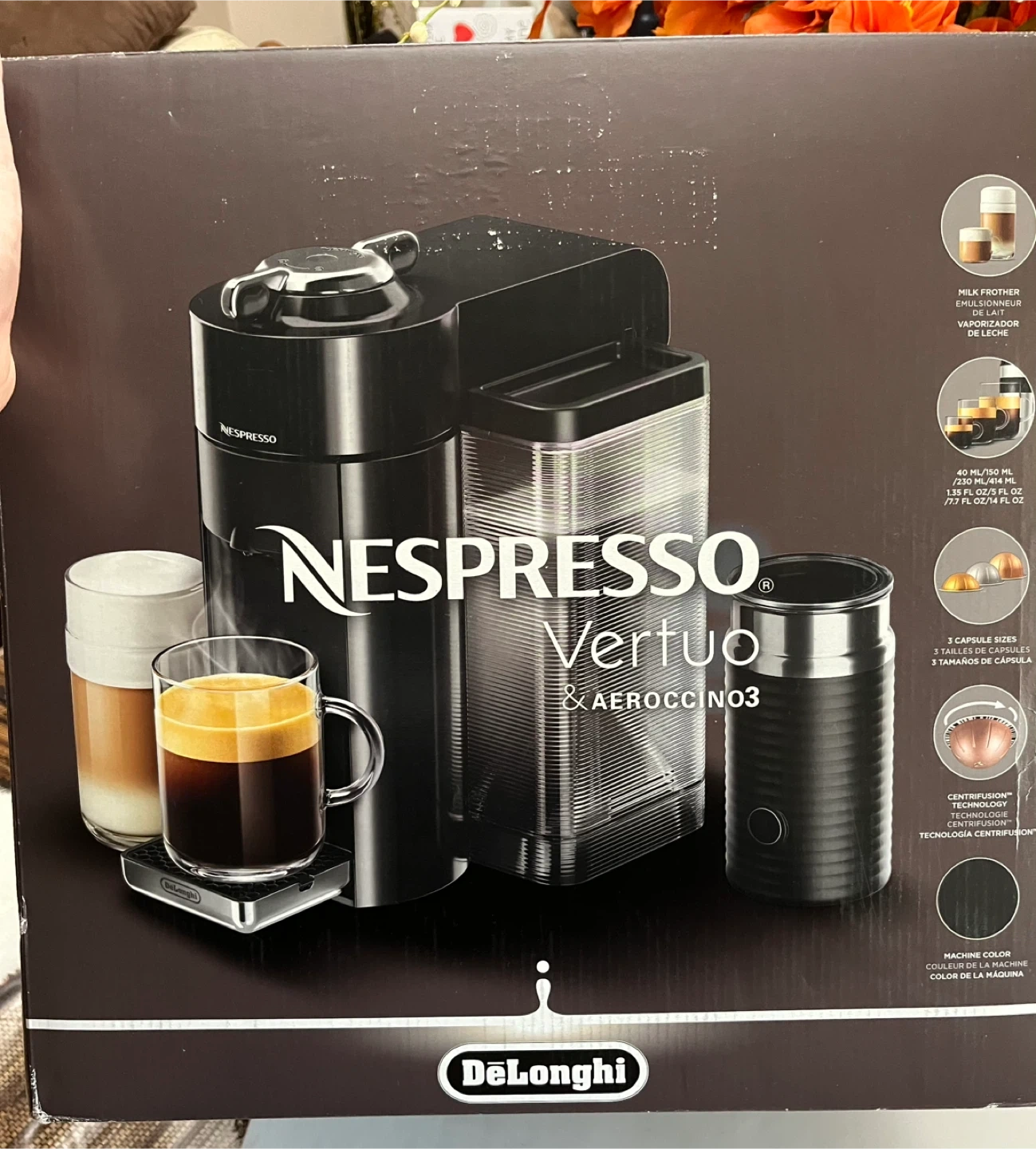 Selling a Nespresso Vertuo machine with the Aeroccino3 milk frother by DeLonghi! It's in great shape and ready to make delicious coffee and lattes. This machine uses Vertuo capsules and has three capsule sizes. It also features Centrifusion technology. Originally retails for $445
