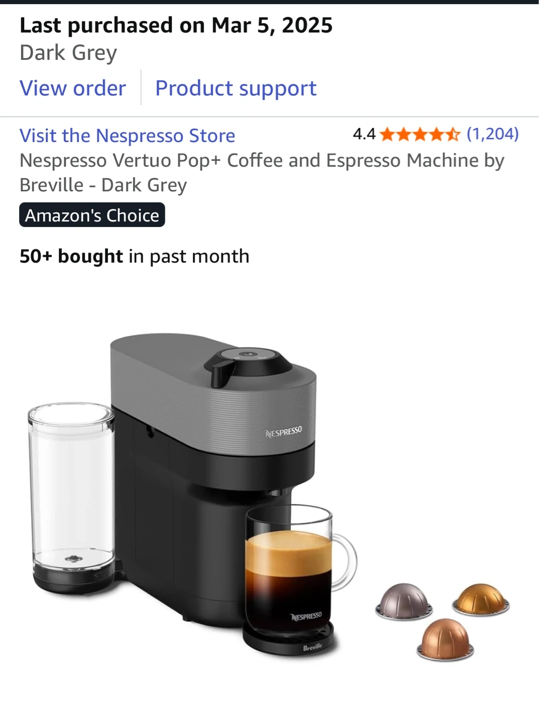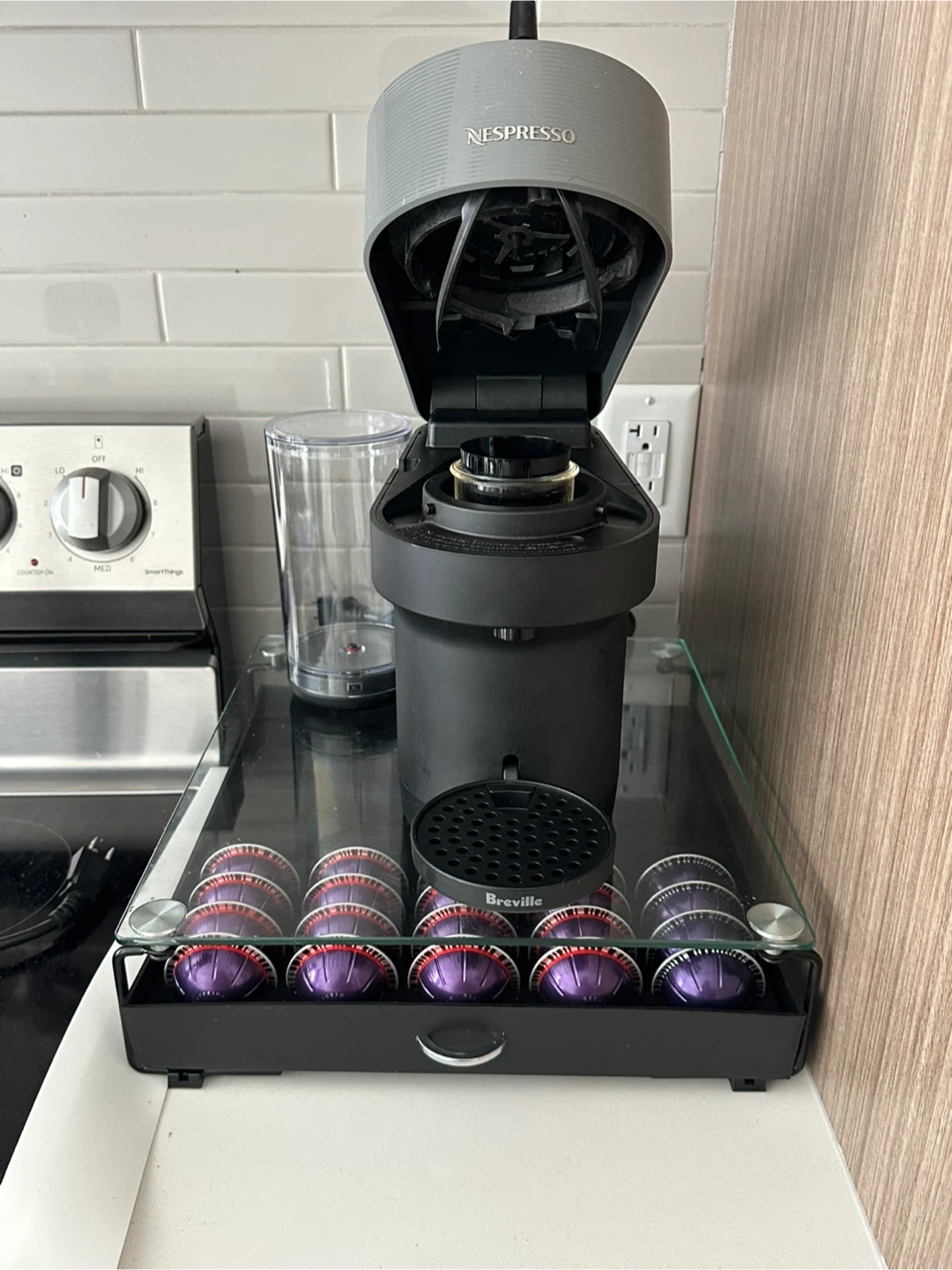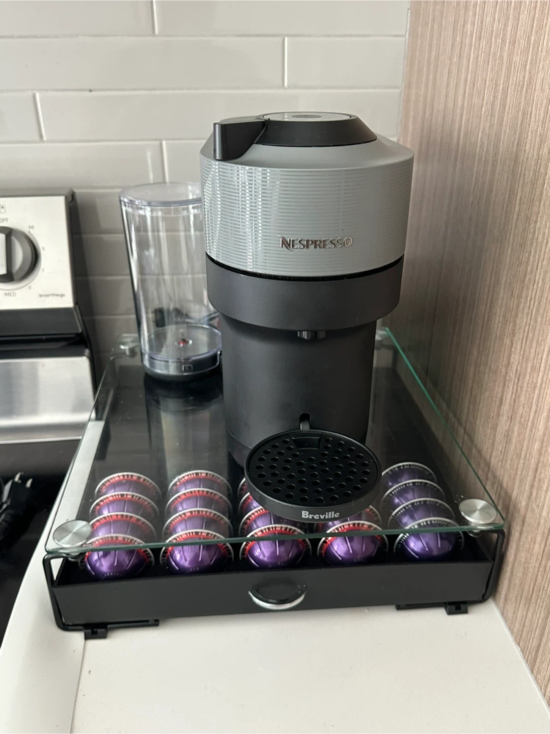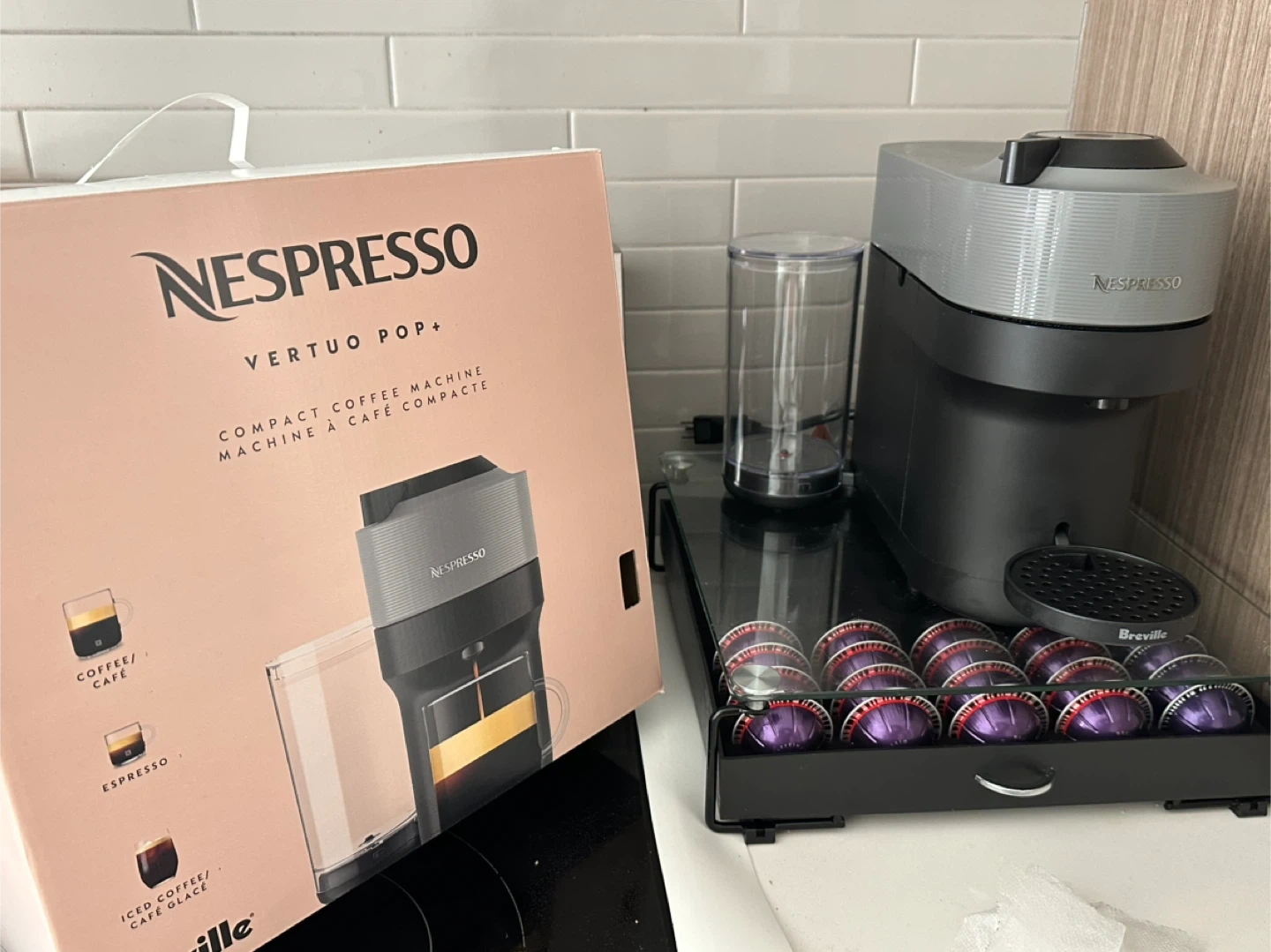 Selling a Nespresso Vertuo Pop+ coffee and espresso machine in dark grey! It's a compact coffee machine that makes coffee, cafe, espresso, and iced coffee. Comes with the original box, pod drawer (60 capsules capacity), 16 Altissio decaf capsules, 4 Altissio medium roast capsules. ALL TOGETHER!!! Pickup only. Feel free to contact me:)