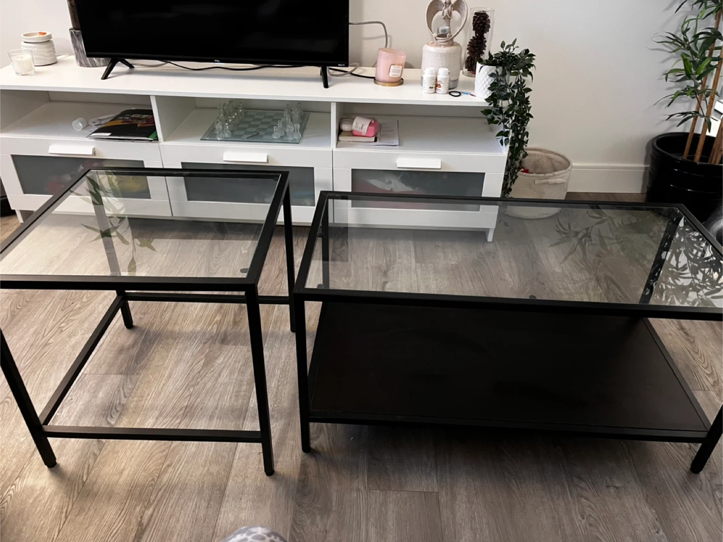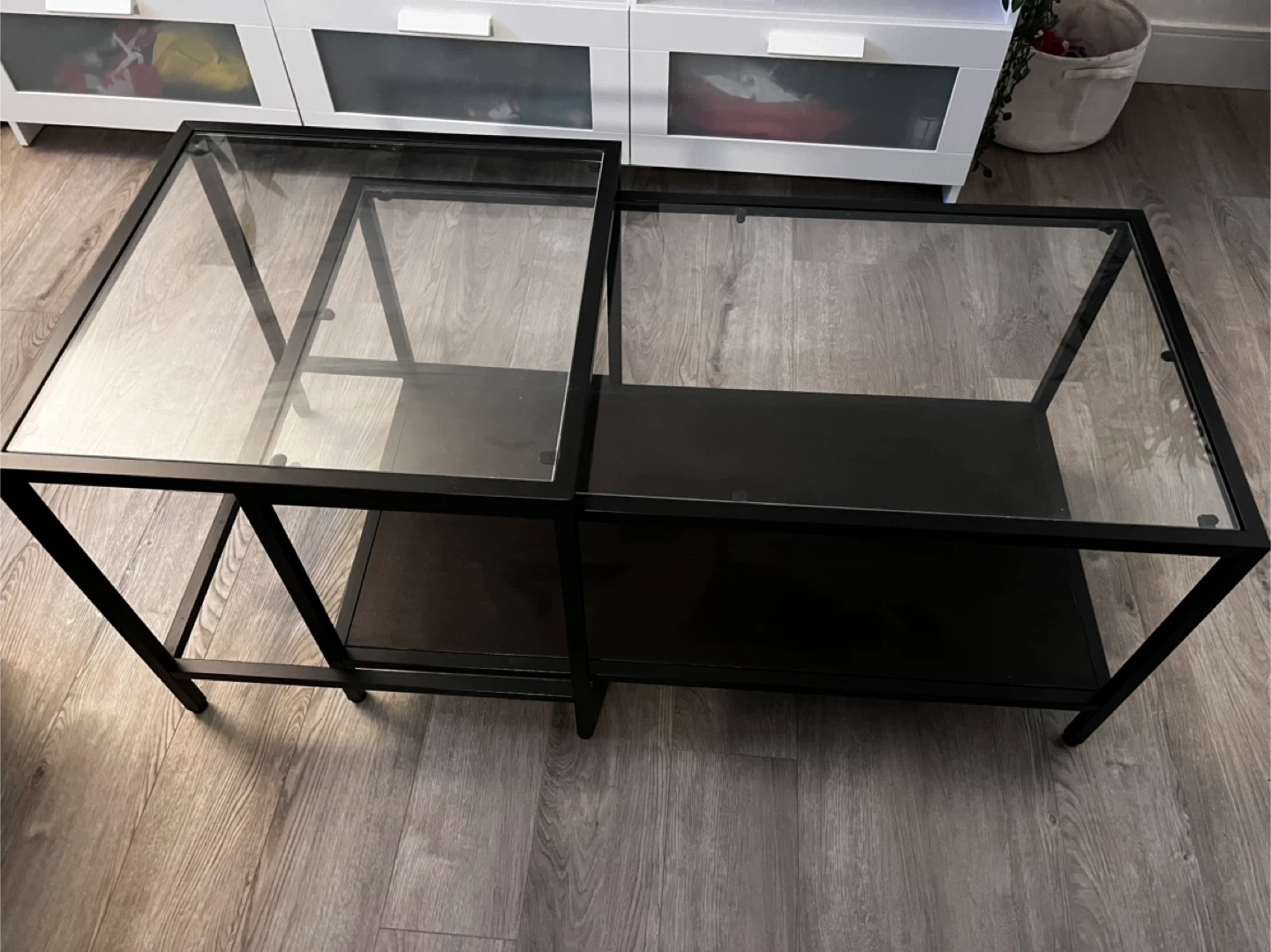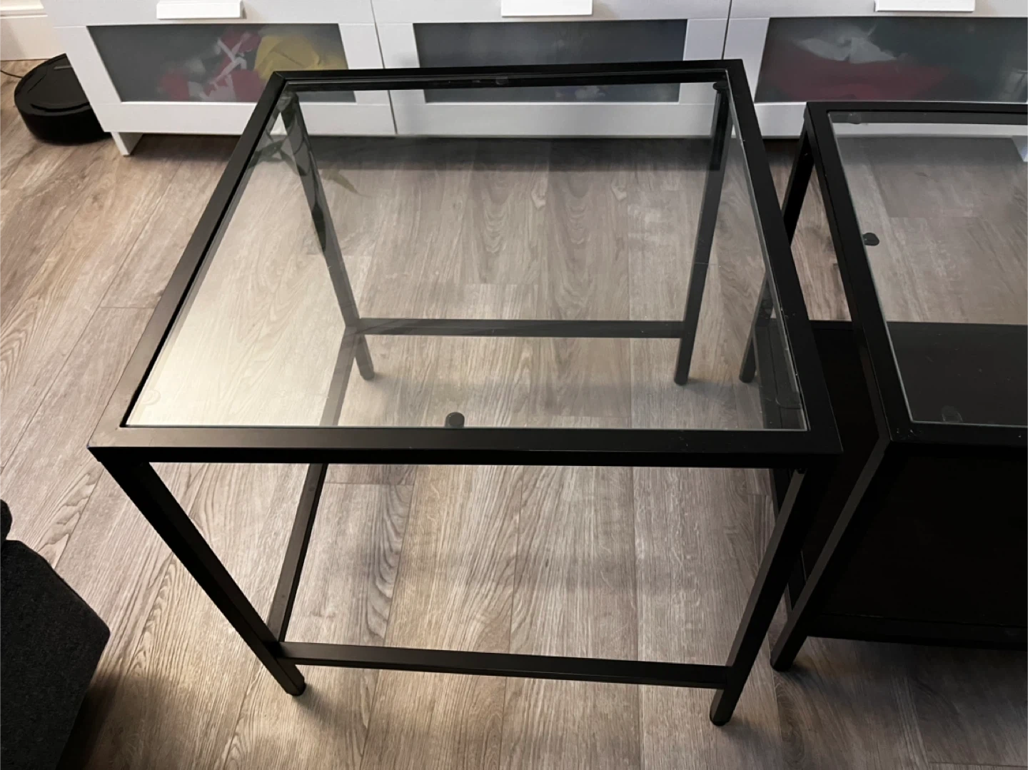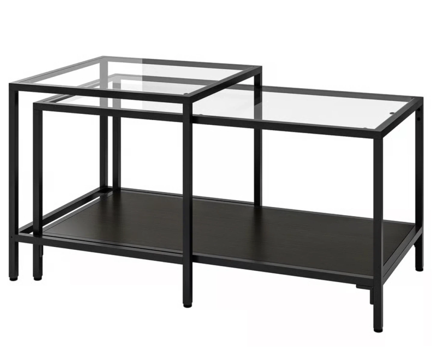65Selling a set of IKEA Vittsjö nesting coffee tables. They feature a sleek black metal frame with glass tops. The larger table is 90 cm x 45 cm and 44 cm tall, while the smaller table is 50 cm x 50 cm and 49 cm tall. Perfect for adding a modern touch to your living room!