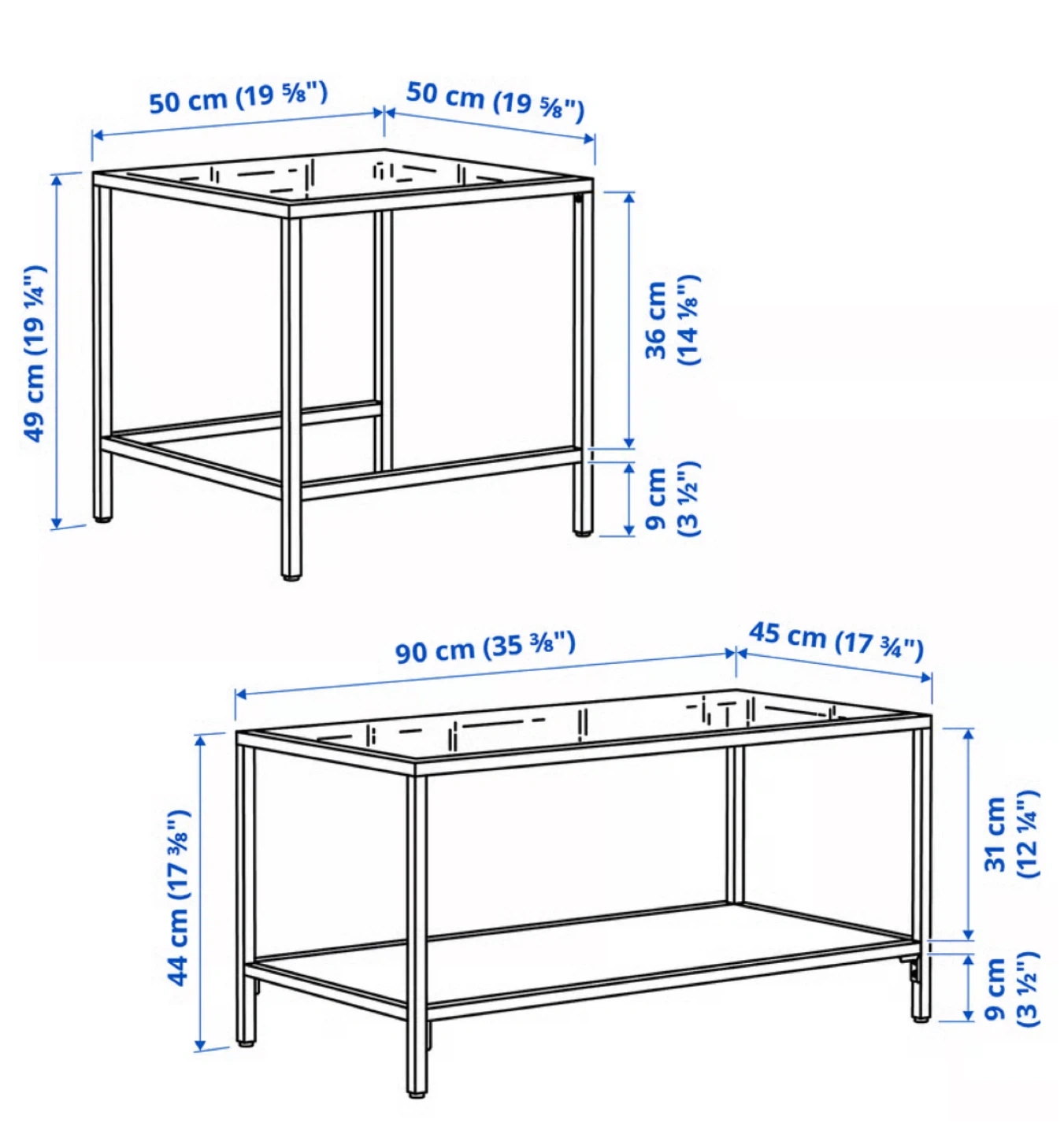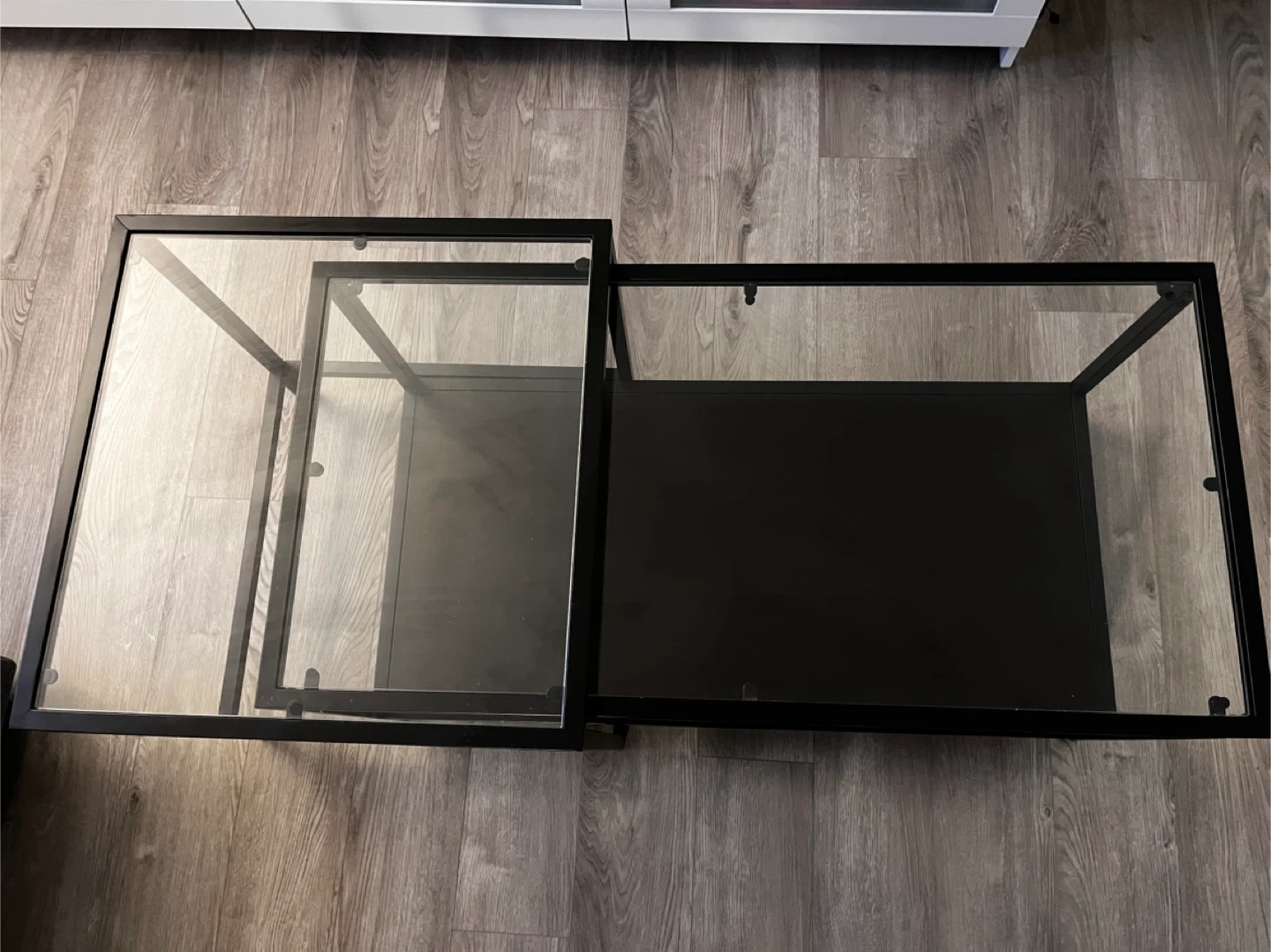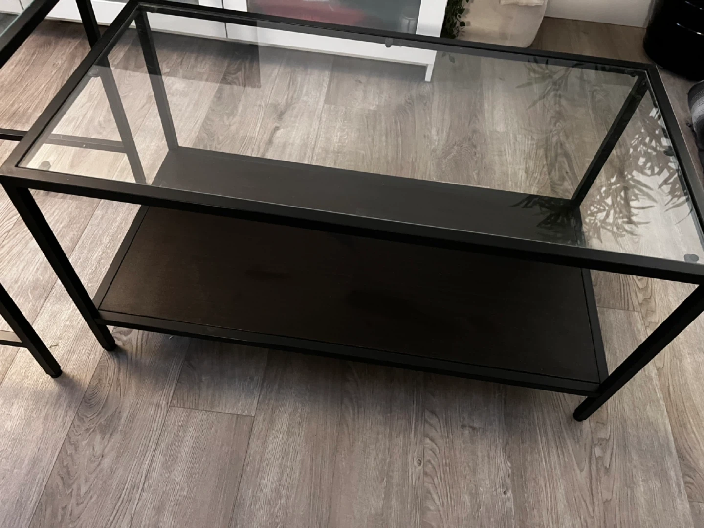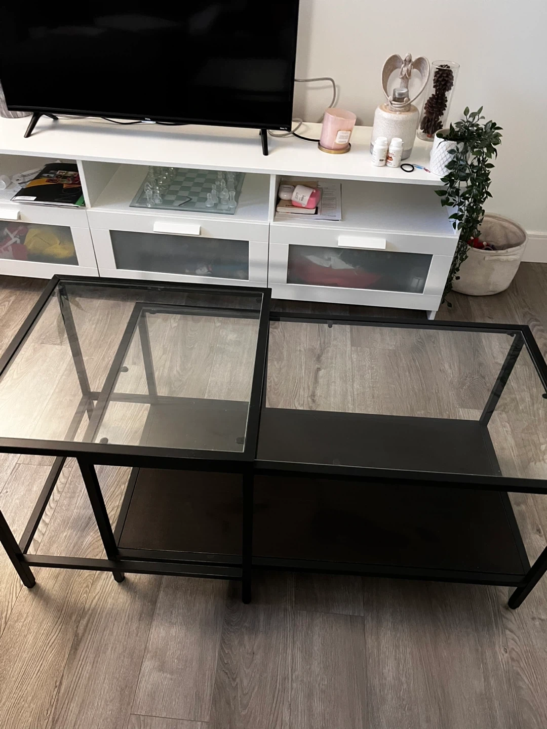65Selling a set of IKEA Vittsjö nesting coffee tables. They feature a sleek black metal frame with glass tops. The larger table is 90 cm x 45 cm and 44 cm tall, while the smaller table is 50 cm x 50 cm and 49 cm tall. Perfect for adding a modern touch to your living room!