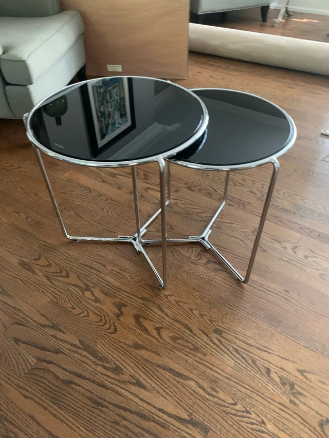 Elevate your space with this set of two elegant nesting tables, perfect for adding a touch of modern sophistication to any room. These used tables feature sleek chrome frames and black glass tops, offering a stylish and functional addition to your home decor. These tables are in great condition. They're ideal for small spaces, easily tucking away when not needed. Specifications: * Chrome frame * Black Tempured glass tops * Nesting design. If the ad's still up, then yes, it's still available!