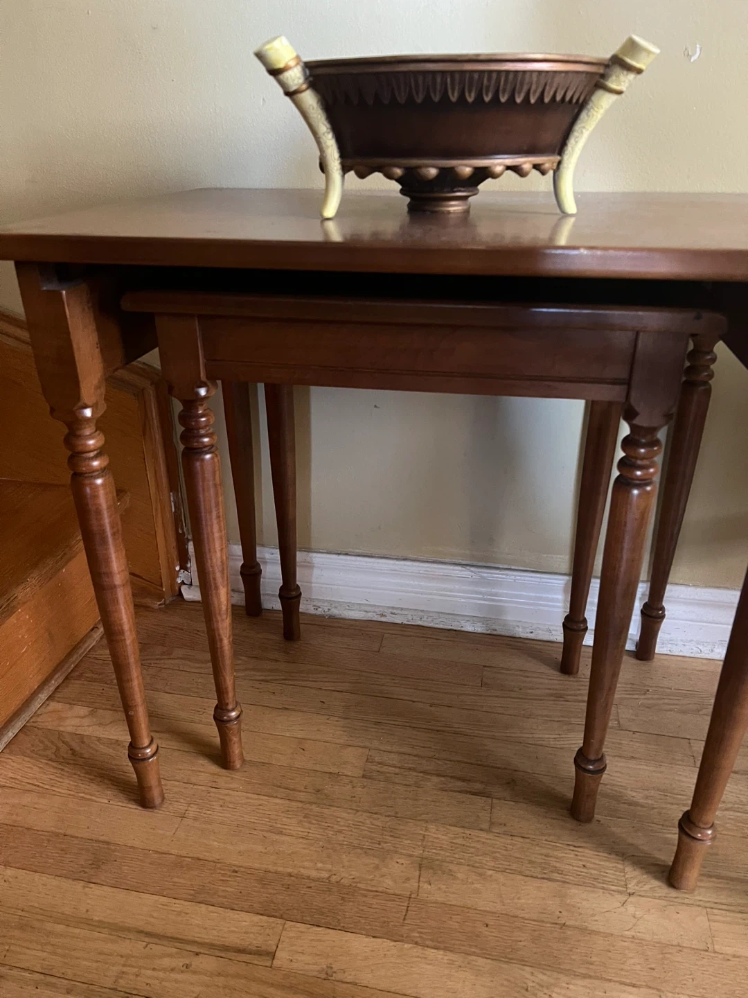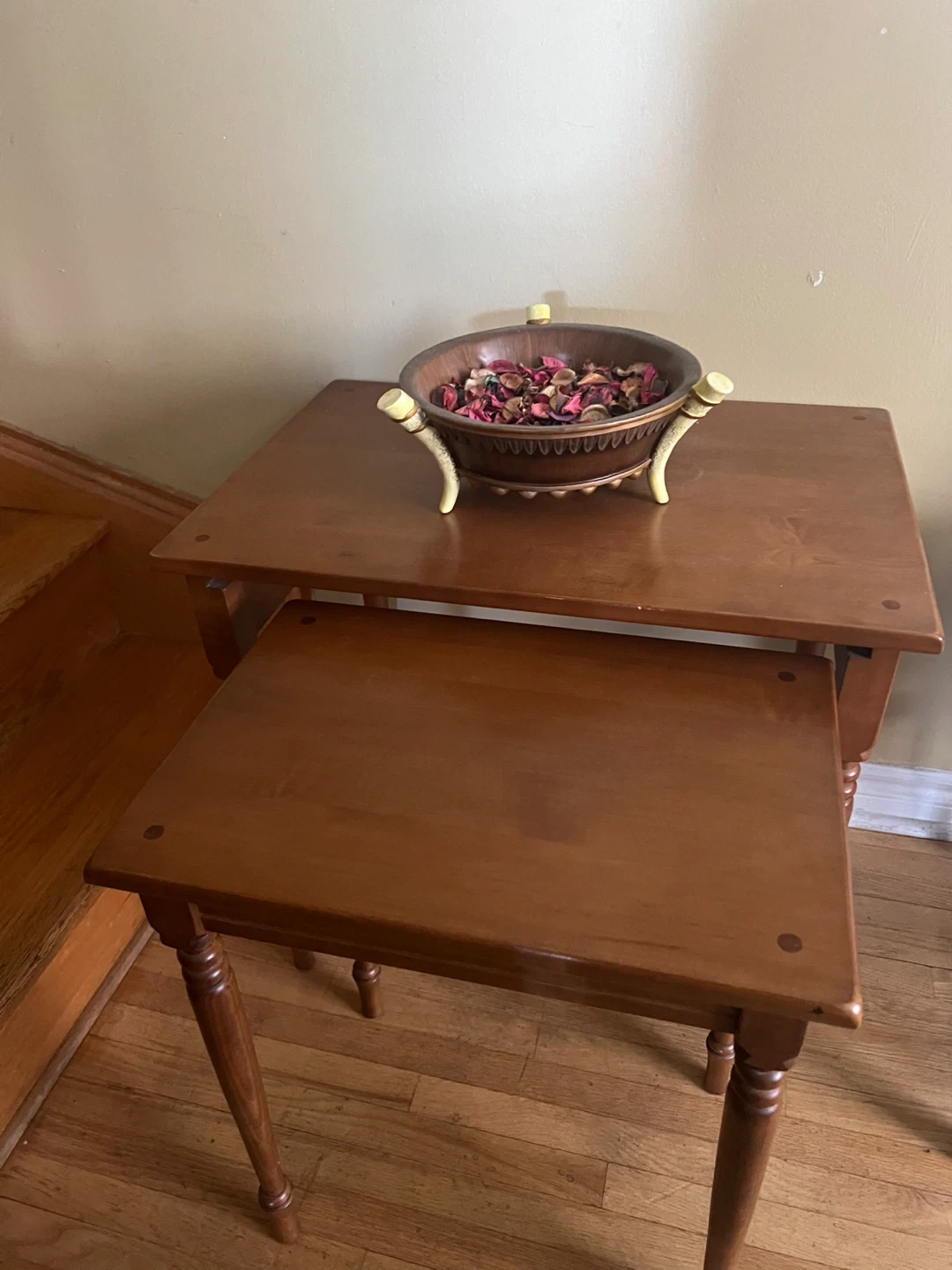 Selling a set of two nesting tables. The larger table is approximately 62 cm x 43 cm x 58 cm, and the smaller table is about 45 cm x 31 cm x 53 cm. Great for saving space and adding a touch of charm to your home!