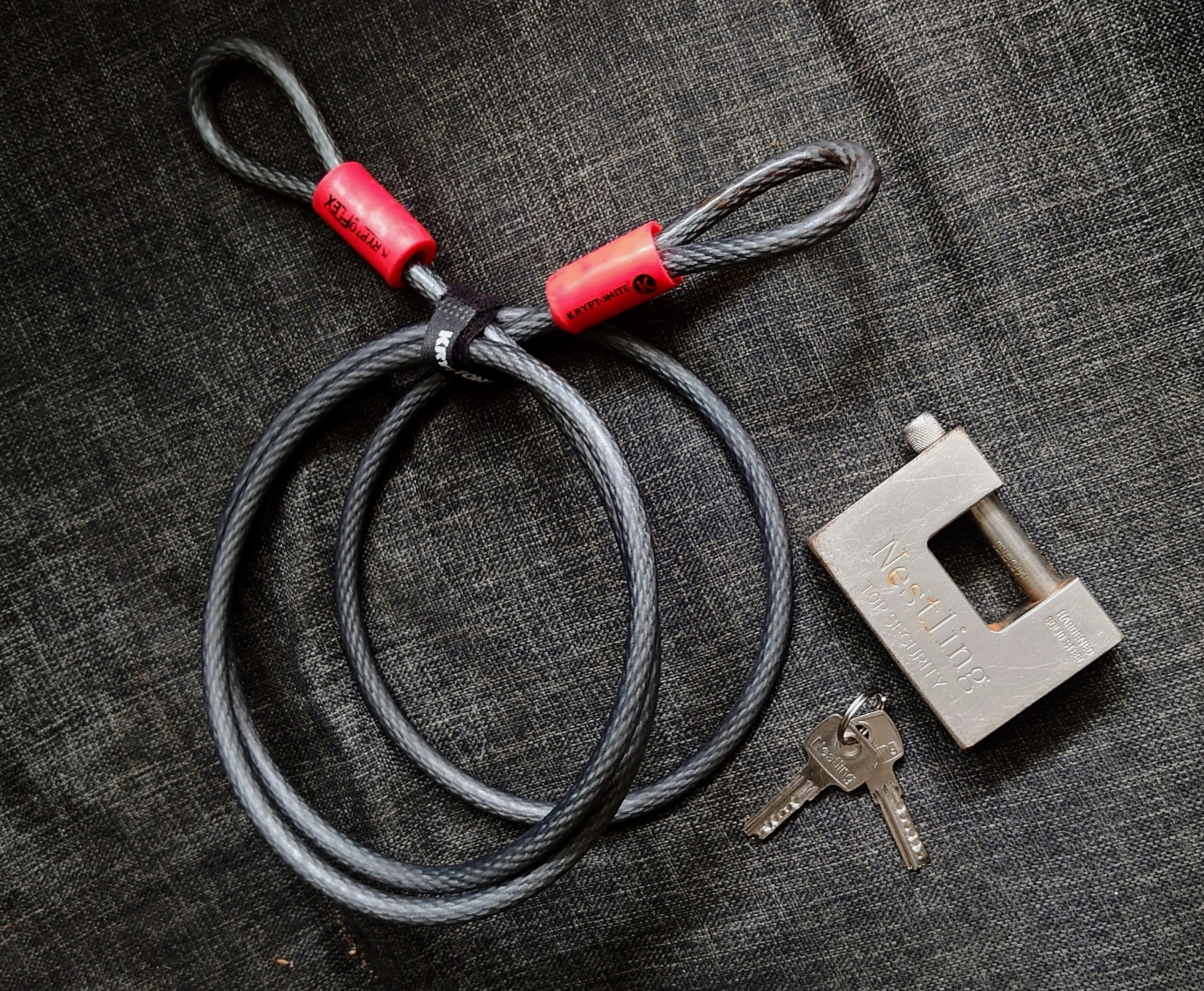 Lock: In perfect working condition. 94mm Padlock with Key, High Security Heavy Duty 1.1 KG D-Shaped Solid Brass Outdoor Keyed Padlock. Cable: In excellent condition, Kryptonite KryptoFlex Security Cable,7FT Long. Braided Steel Flex Bike Lock Anti-Theft Cable with Looped Ends.