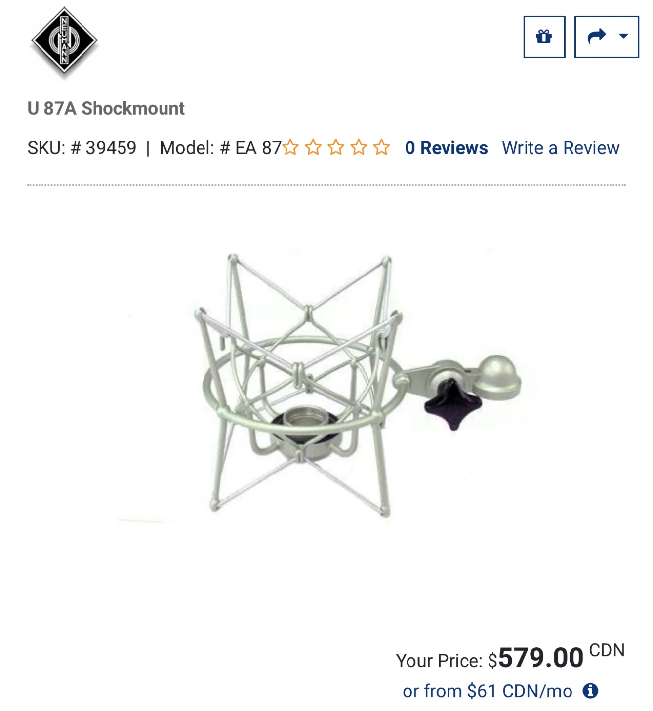 Selling a Neumann U 87A Shockmount, model number EA 87. Originally priced at $579.00 CDN. I bought a new mic but it came with a shock mount so I don’t need this. It’s basically brand new.