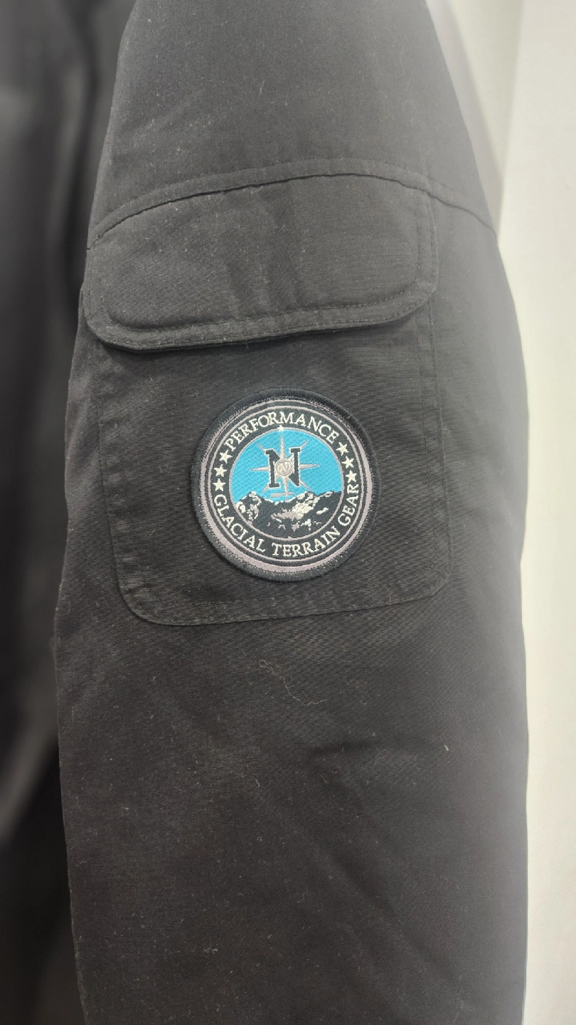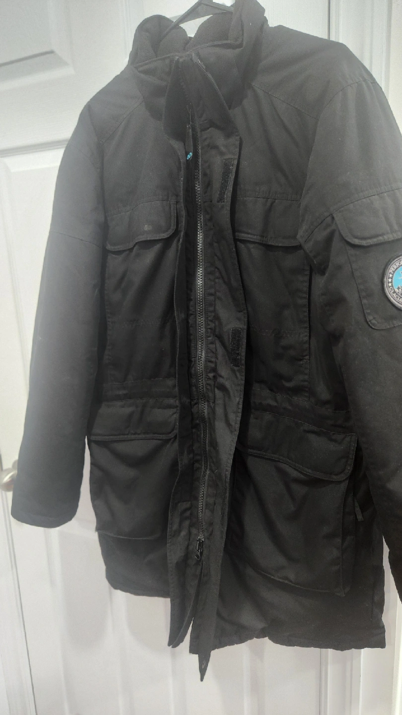 10Selling a gently used Nevada winter jacket in black. It's a size M (38-40). This jacket is perfect for the cold Canadian winters, offering warmth and comfort. It has a performance glacial terrain gear logo on the sleeve.