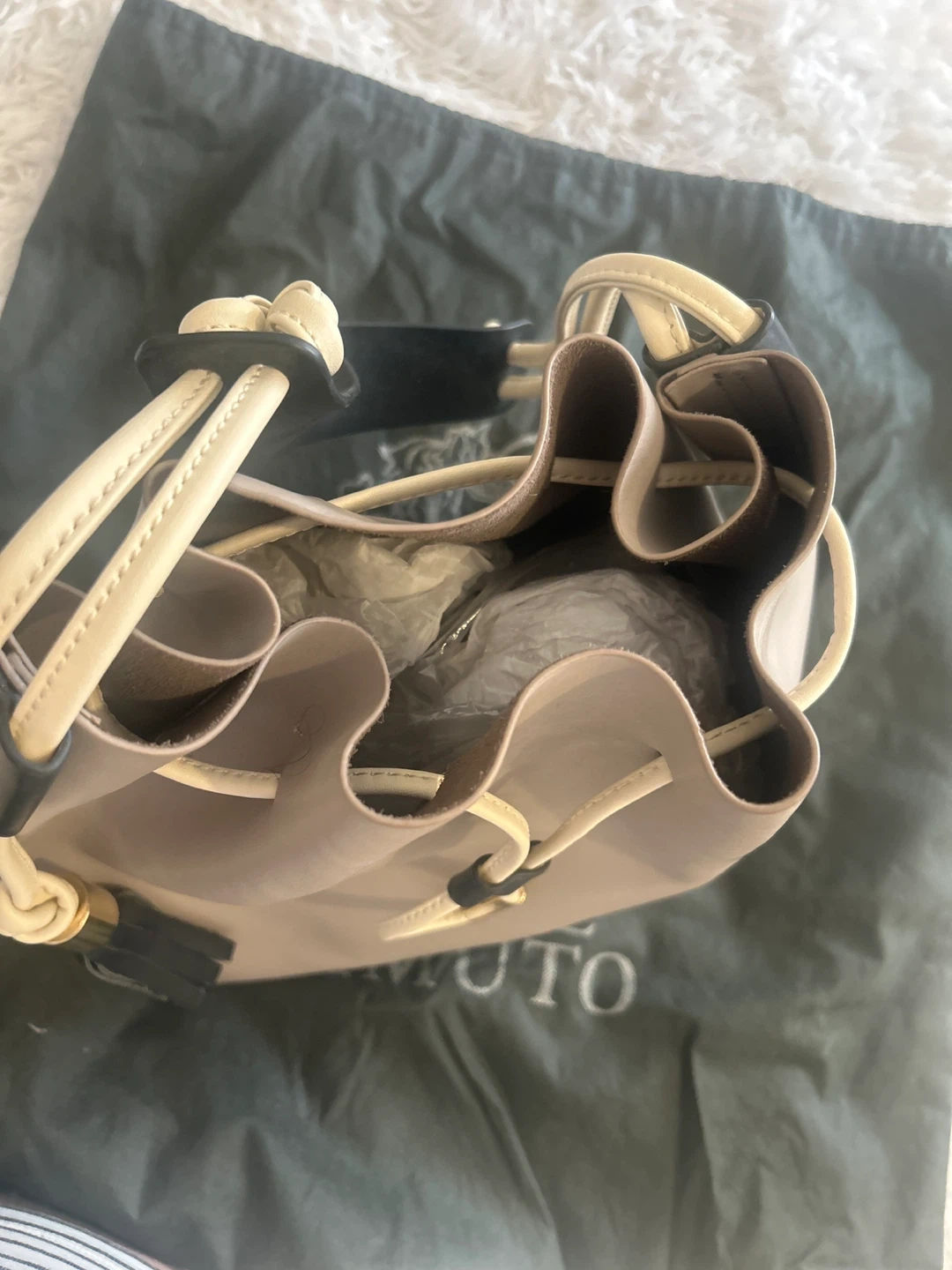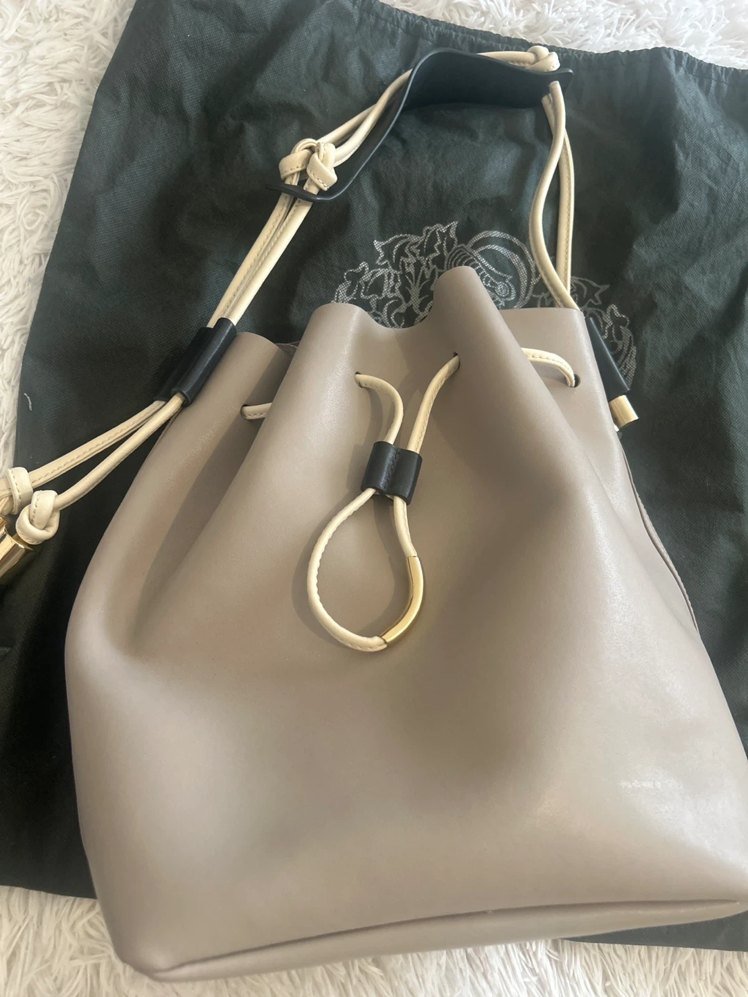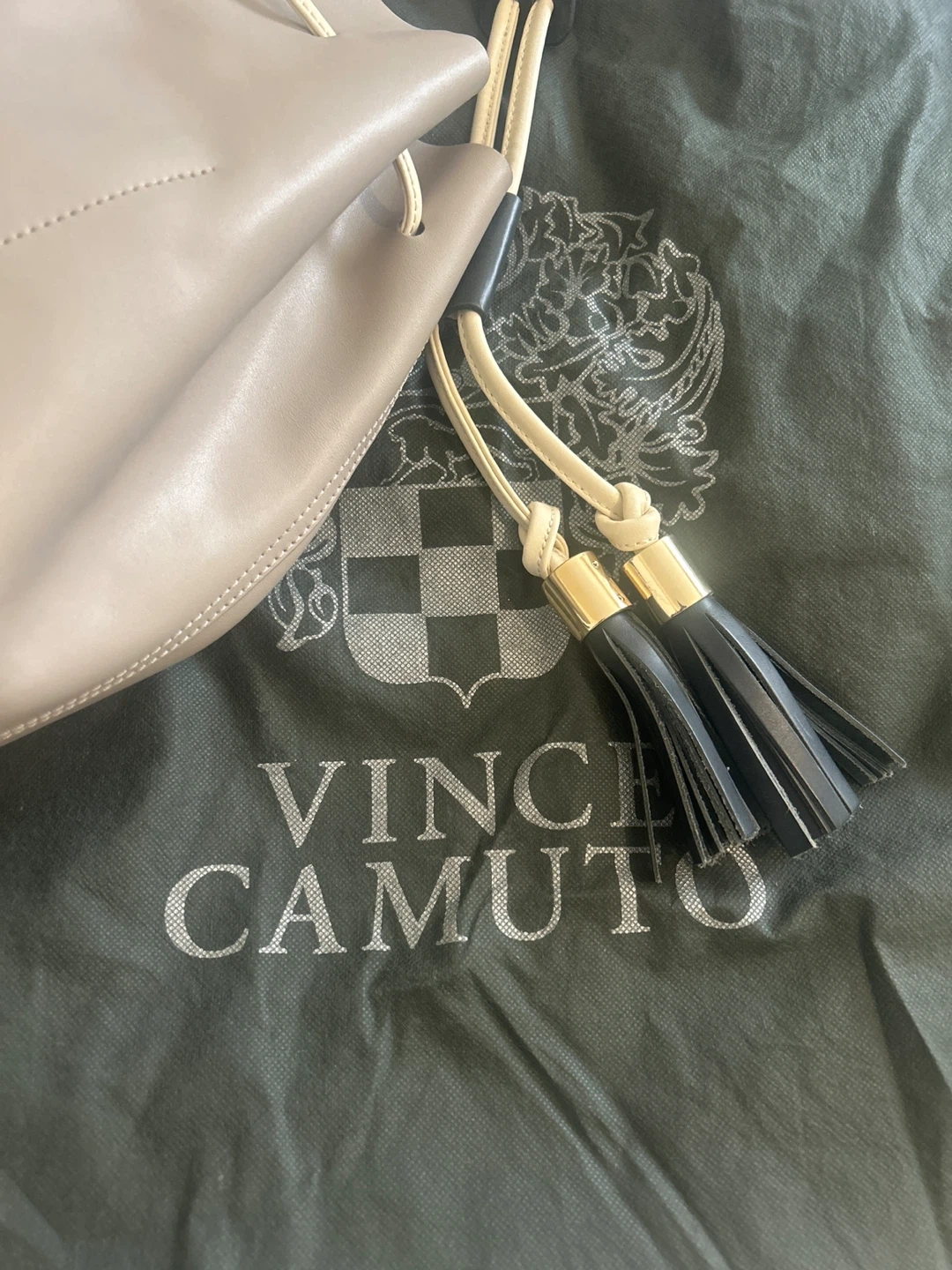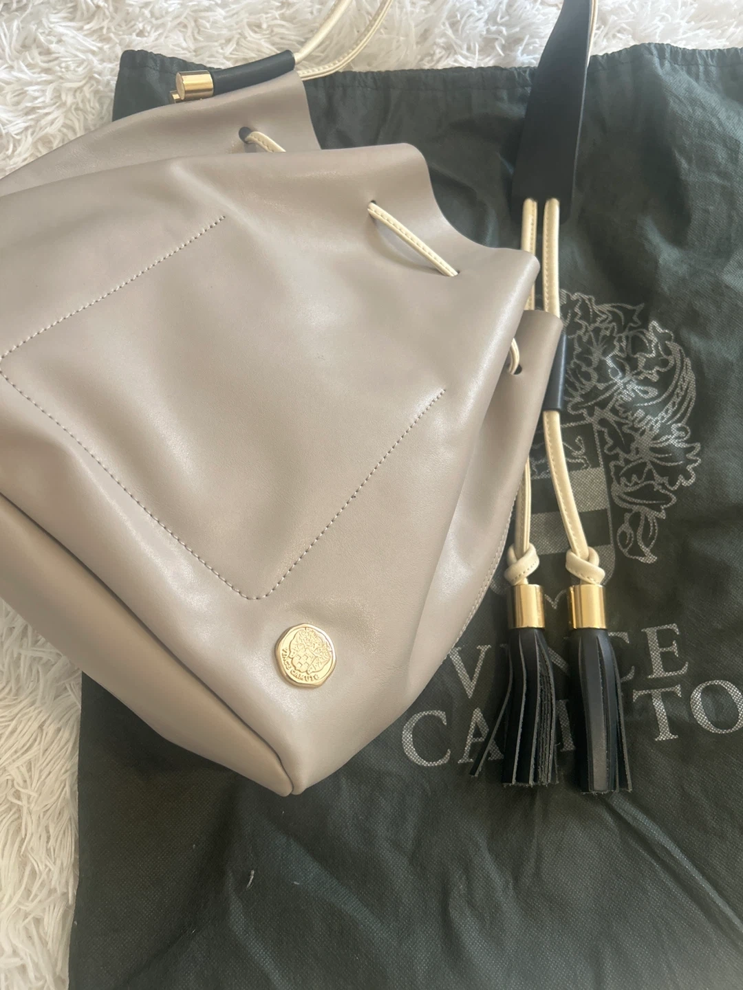 Here's a never been used Vince Camuto bucket bag in a lovely taupe colour and never been used! It's made of leather and has some stylish tassel details. Comes with the original dust bag!