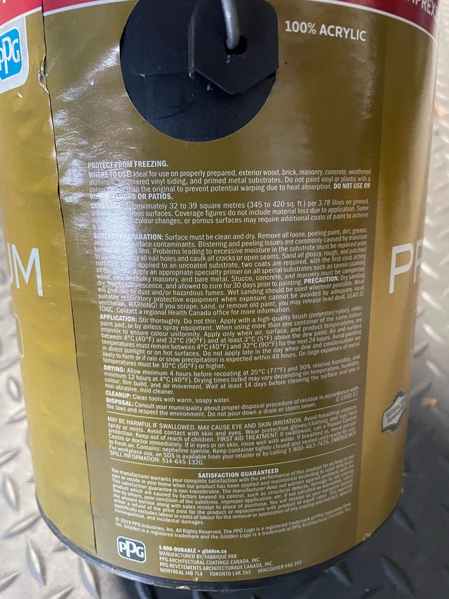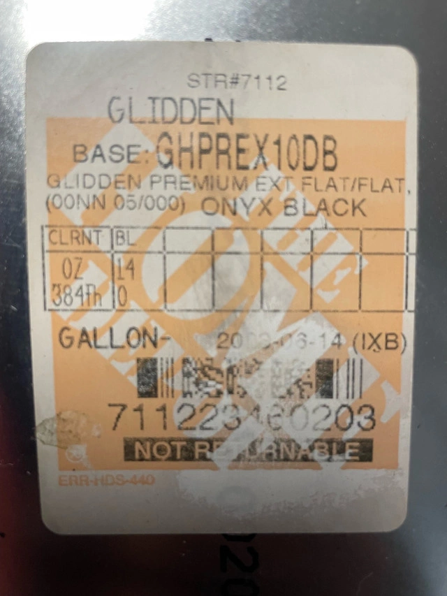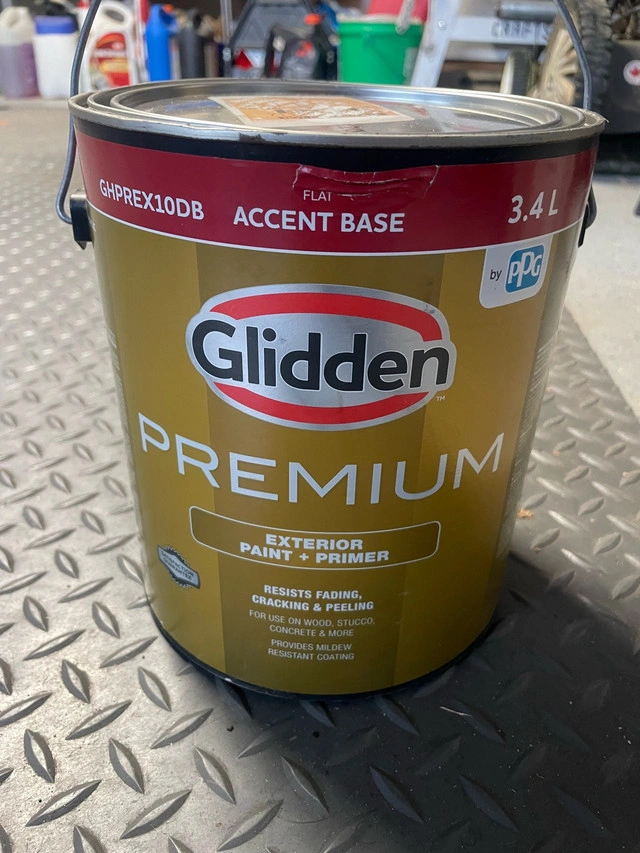 I'm offering a 3.4 L can of Glidden Premium exterior paint and primer in one, accent base with a flat finish. This can is brand new and ready to transform your outdoor spaces with its durable and mildew-resistant coating, perfect for various surfaces like wood, concrete, and more. The colour of the paint is onyx black.