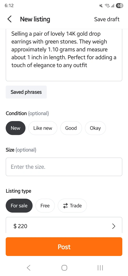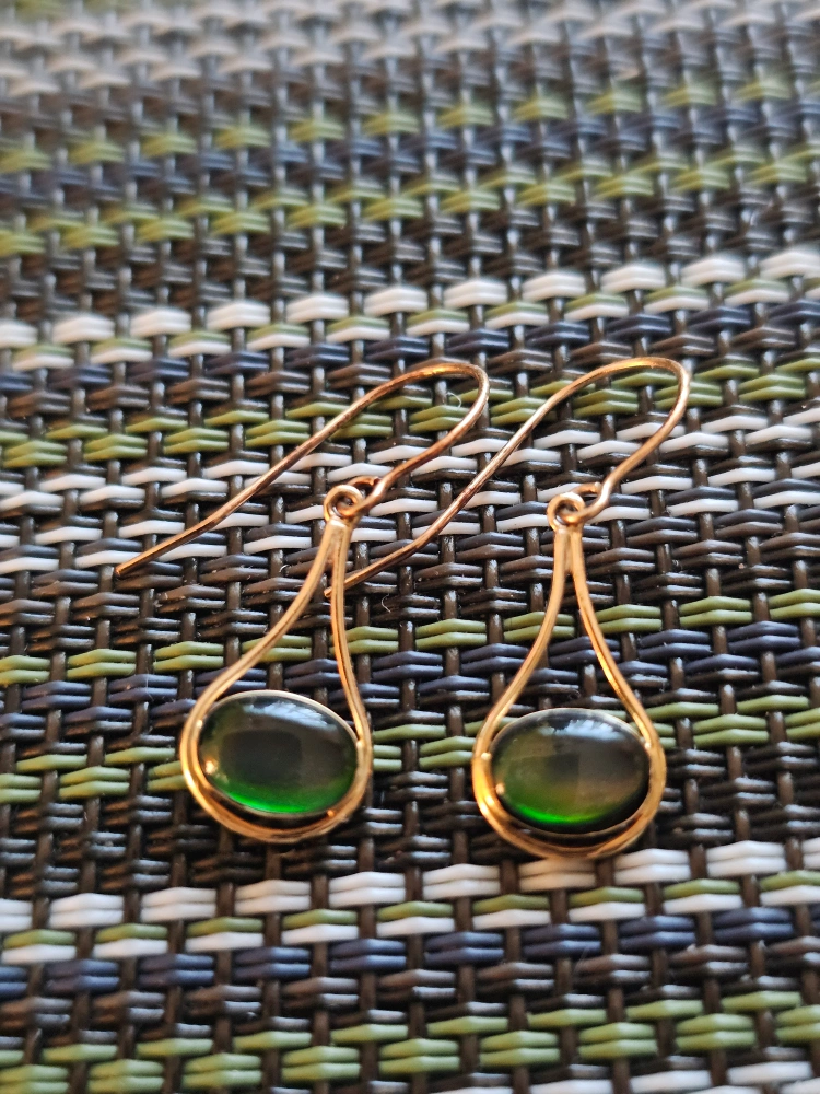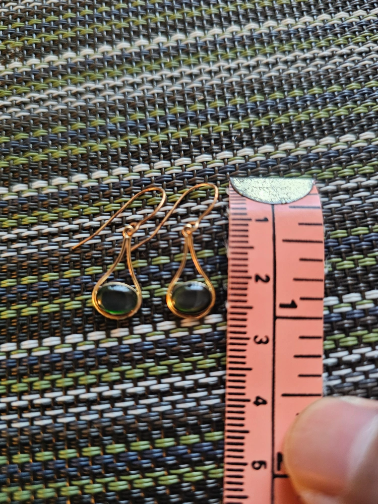 Selling a pair of lovely 14K gold drop earrings with green stones. They weigh approximately 1.10 grams and measure about 1 inch in length. Perfect for adding a touch of elegance to any outfit! They are new.
