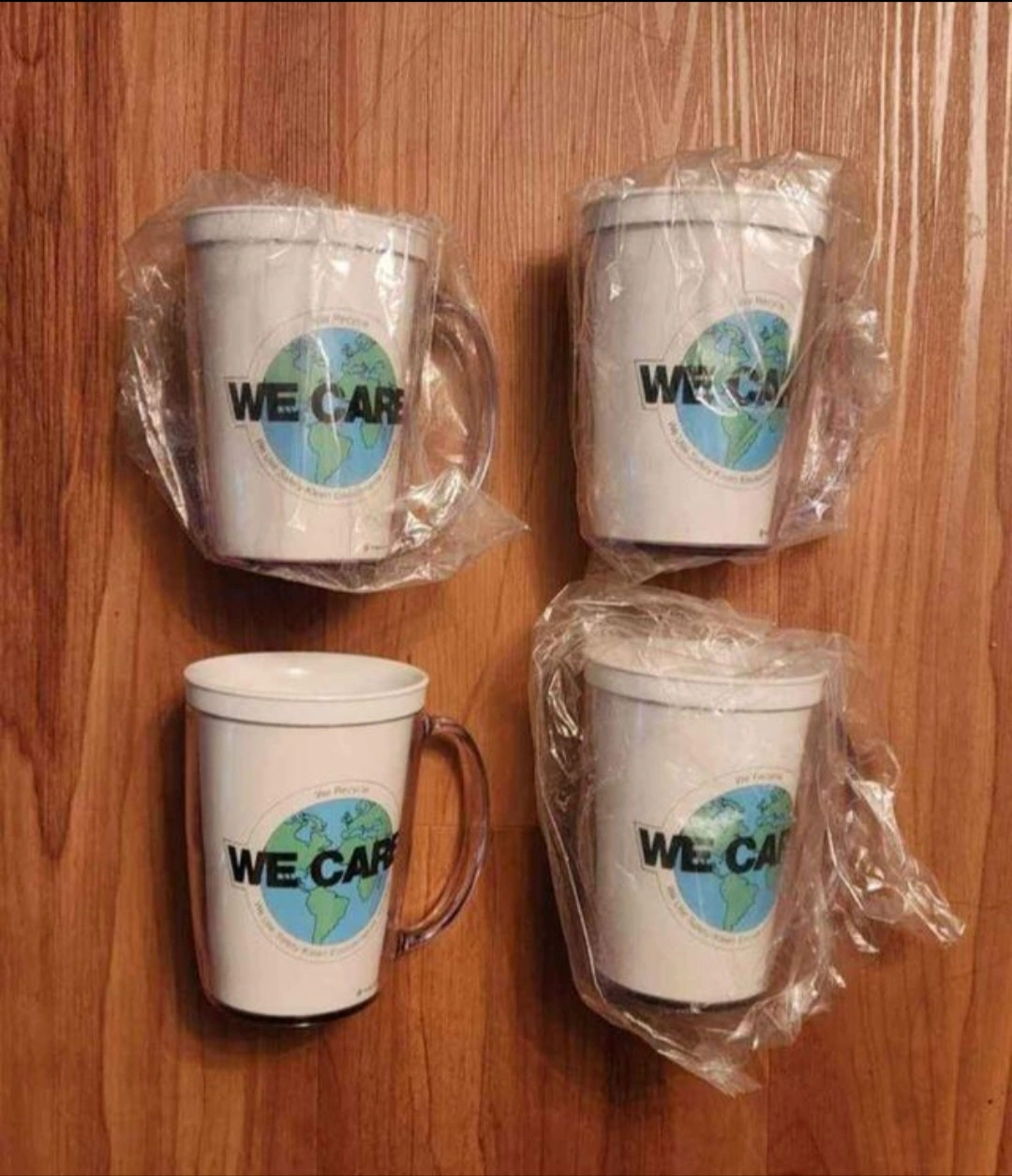 168I have a set of four brand new 'We Care' mugs still in their original packaging. These mugs are very good quality and double walled to keep drinks hot or cold and are shatter proof. They are perfect for everyday use indoor or outdoor use, camping, or as a unique gift!