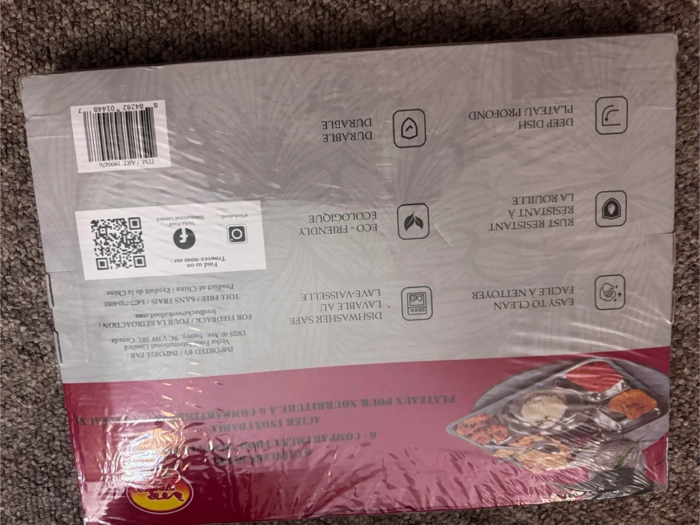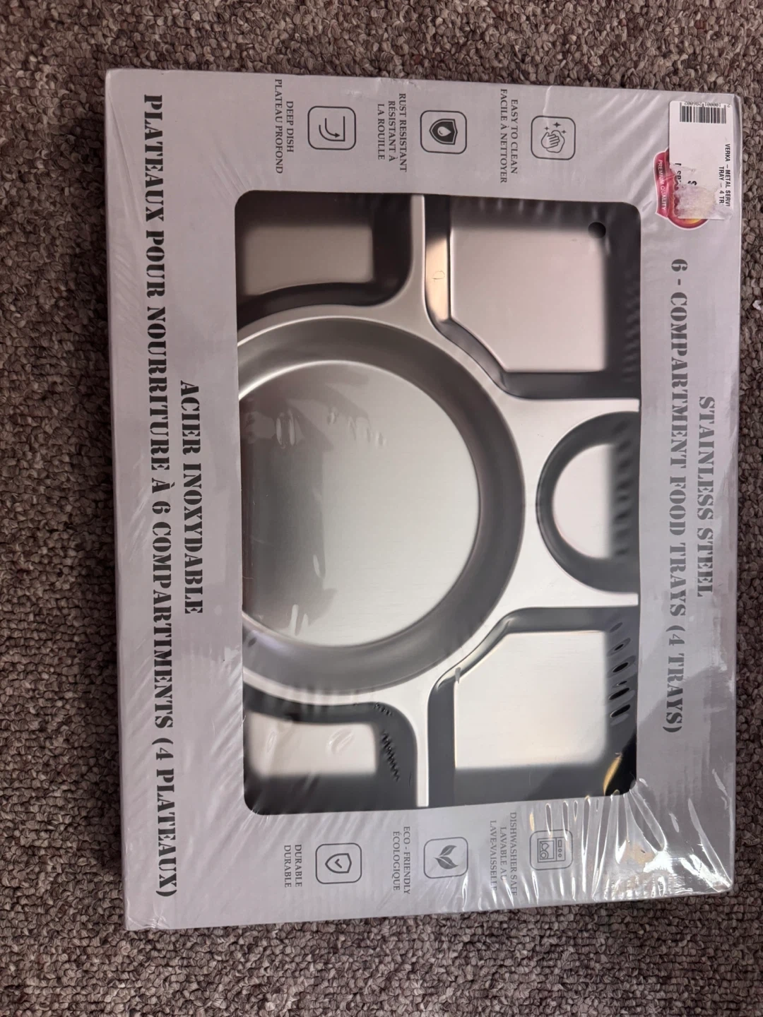 Selling a brand new set of 6-compartment stainless steel food trays! You get 4 trays in the pack. They're made of stainless steel, so they are durable and rust resistant. They are also dishwasher safe and easy to clean. Perfect for portioning meals or snacks!