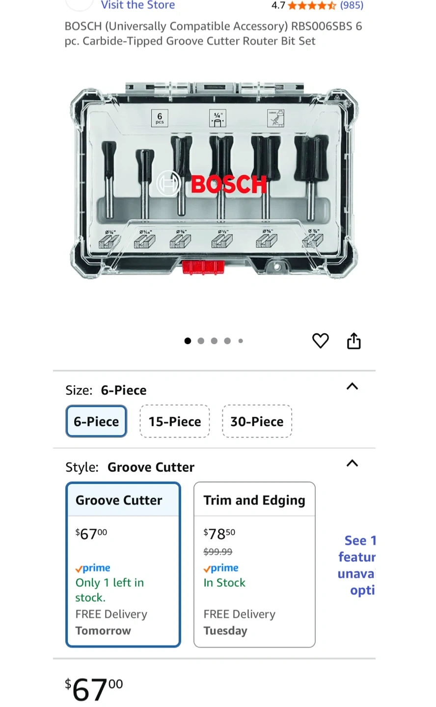 Selling a Bosch 6-piece carbide-tipped groove cutter router bit set. This set is universally compatible and comes in its original case. It's perfect for groove cutting and trim/edging. Cash only and pickup near Londonderry mall