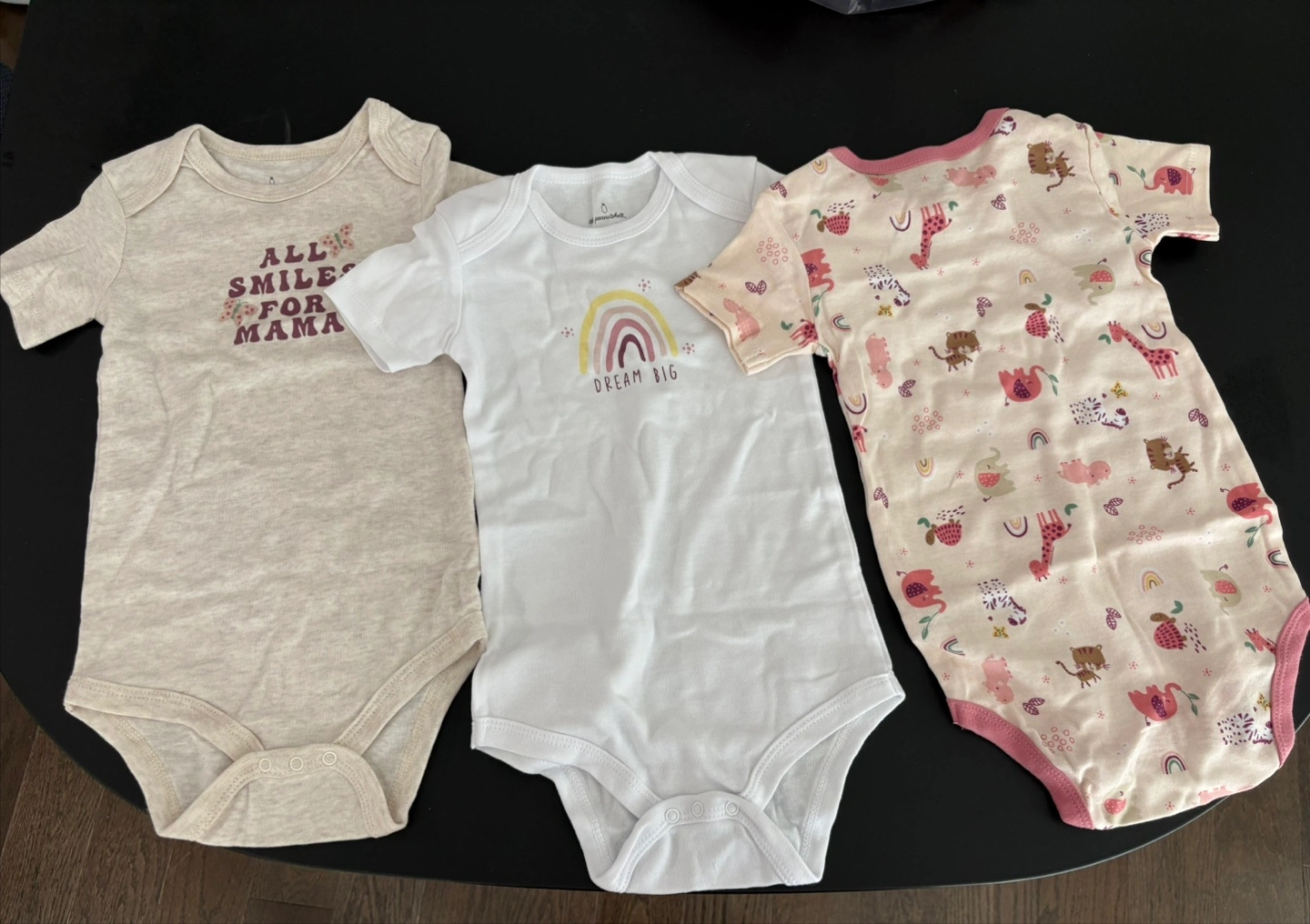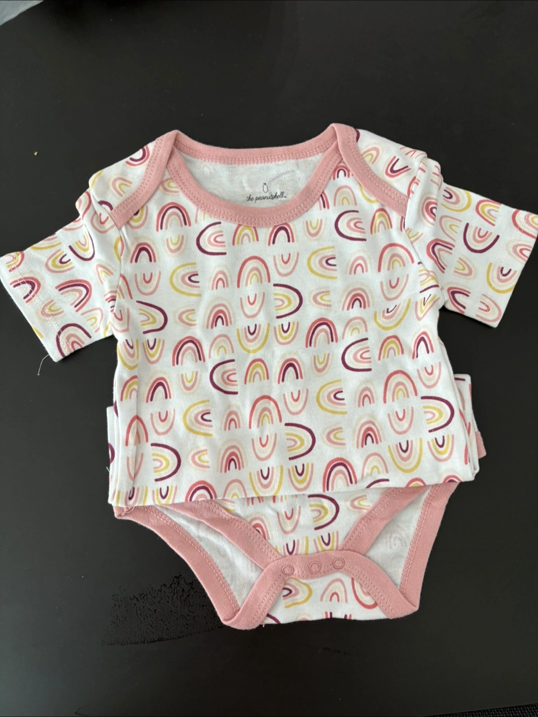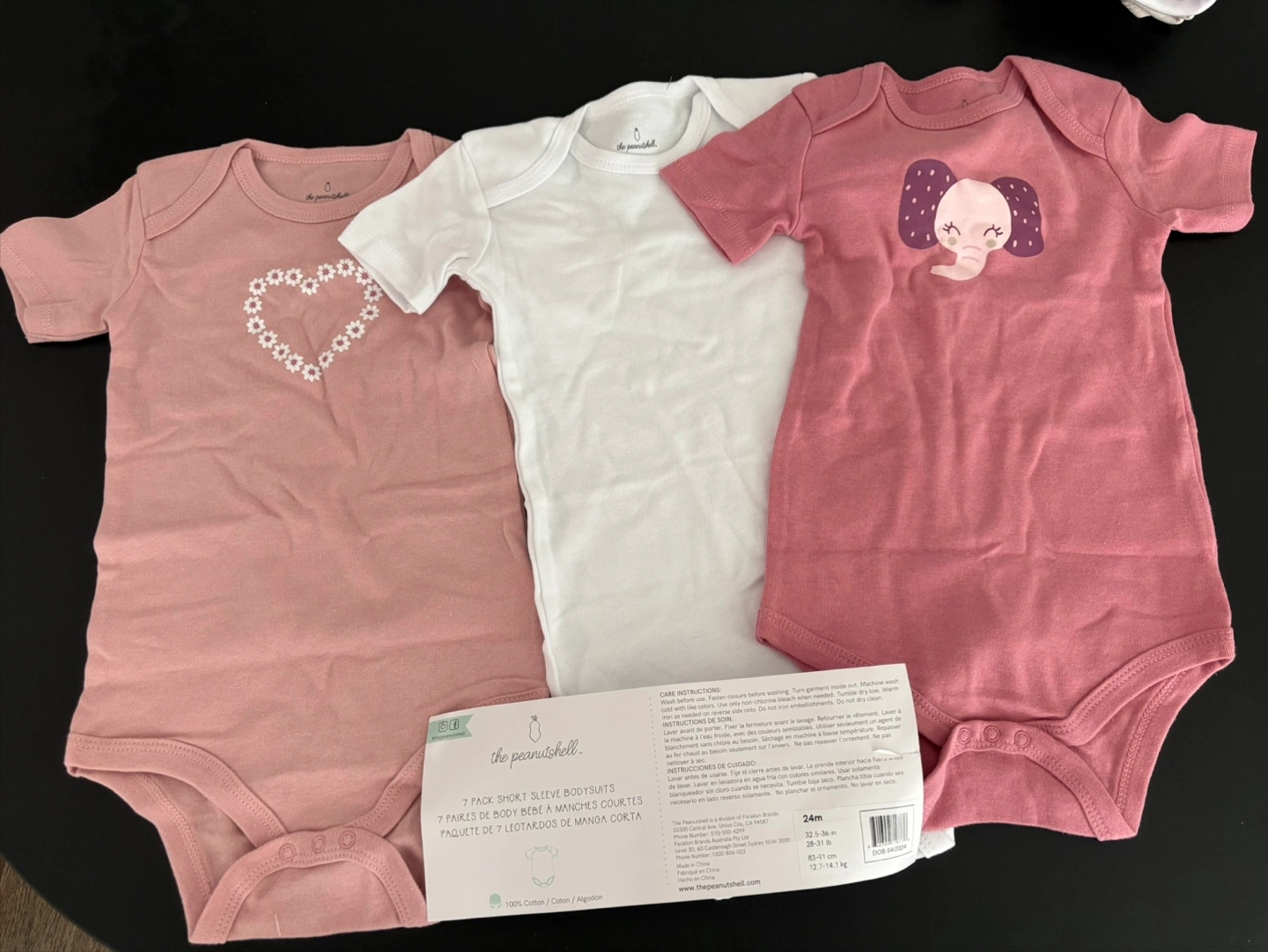 Selling a set of 6 adorable baby bodysuits from The PeanutShell! These are size 24M and new. For price comparison: https://www.amazon.ca/Peanutshell-Bodysuits-Sleeve-Newborn-Rainbow/dp/B0CN442WX5