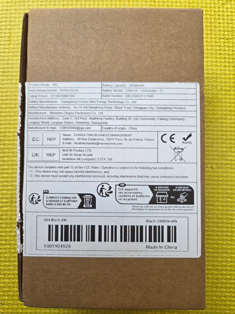 10Selling a brand new 983 black power bank with a 20000mAh battery capacity! It supports 22.5W fast charging and comes with its original box. It has multiple output options including USB and Type-C.
