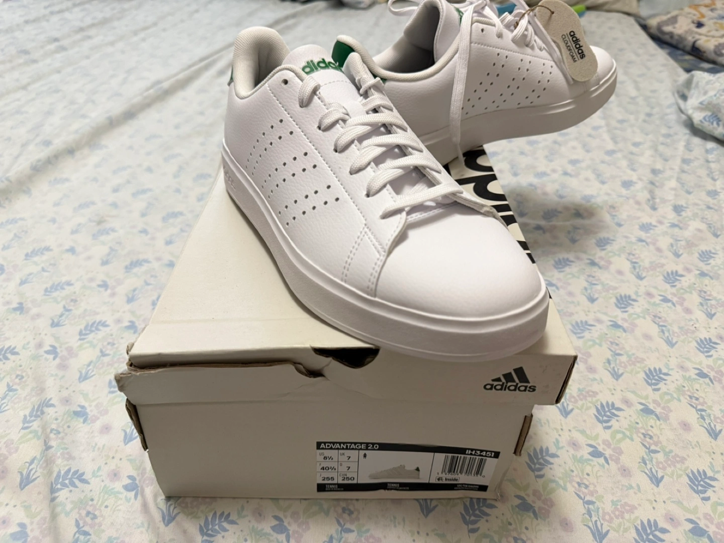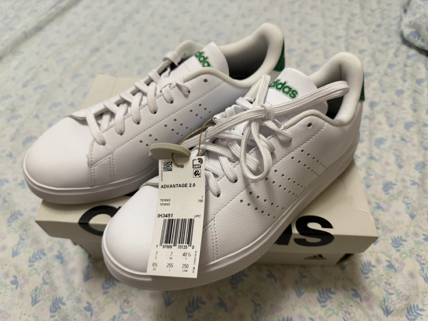 60White sneakers, with a green accent. Still new with tags, in a box. A perfect pair of shoes for a relaxing stroll outside.