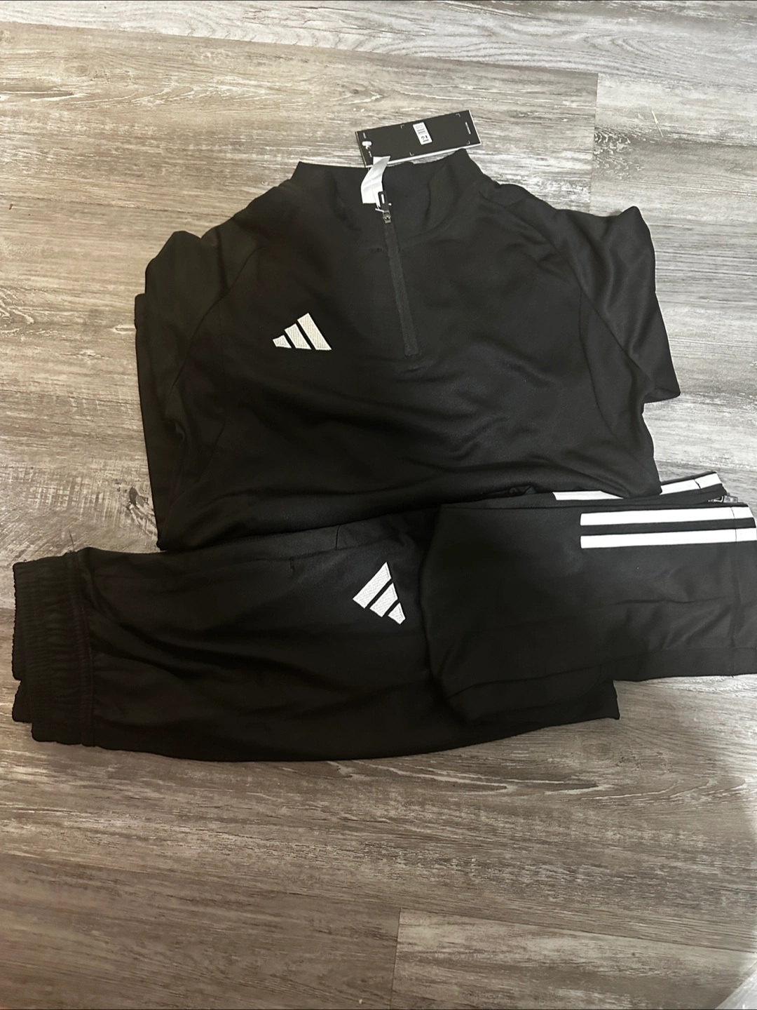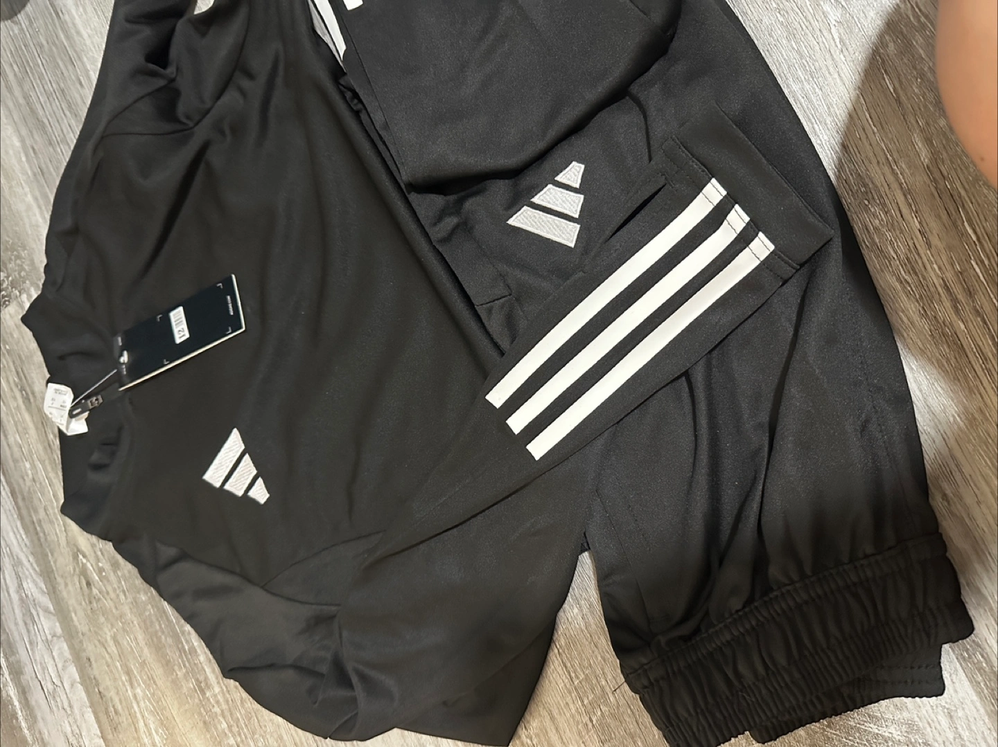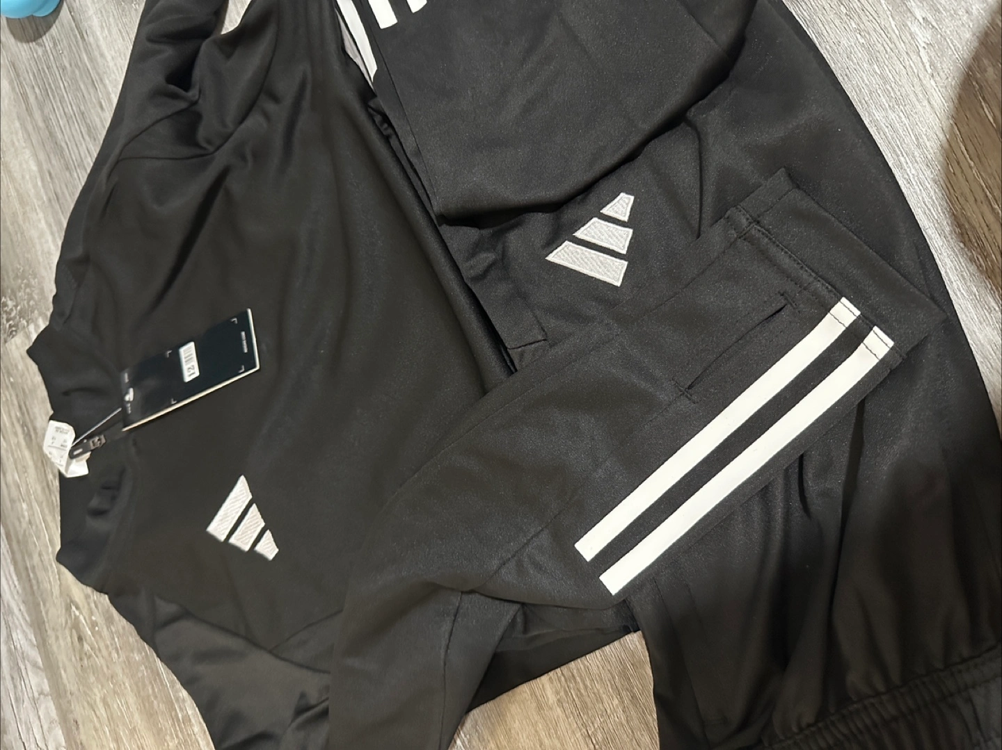 10I'm selling a brand new Adidas training tracksuit! It's black with the classic white stripes and logo. Perfect for workouts or just lounging around. It's never been worn and still has the tags on it.size 12