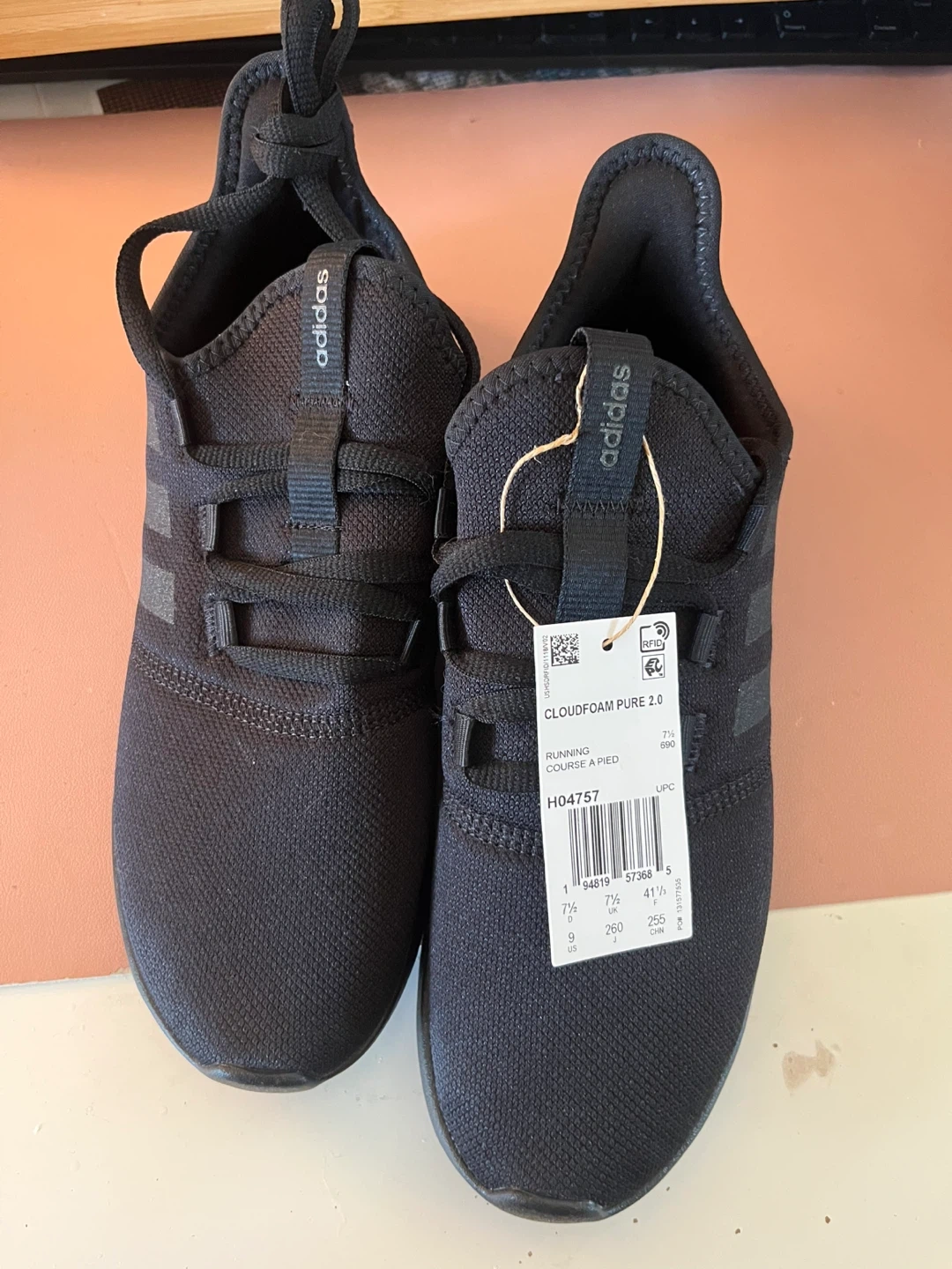Selling a pair of brand new Adidas Cloudfoam Pure 2.0 running shoes in size 9! They are a sleek black colour and ready for your next run or casual wear. The Cloudfoam technology provides excellent cushioning and comfort. The model number is H04757.