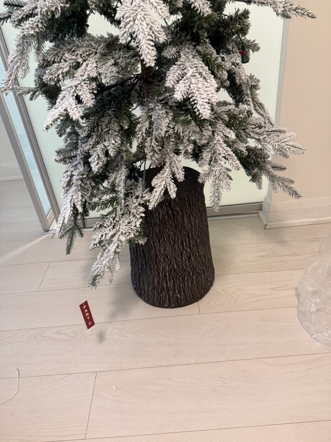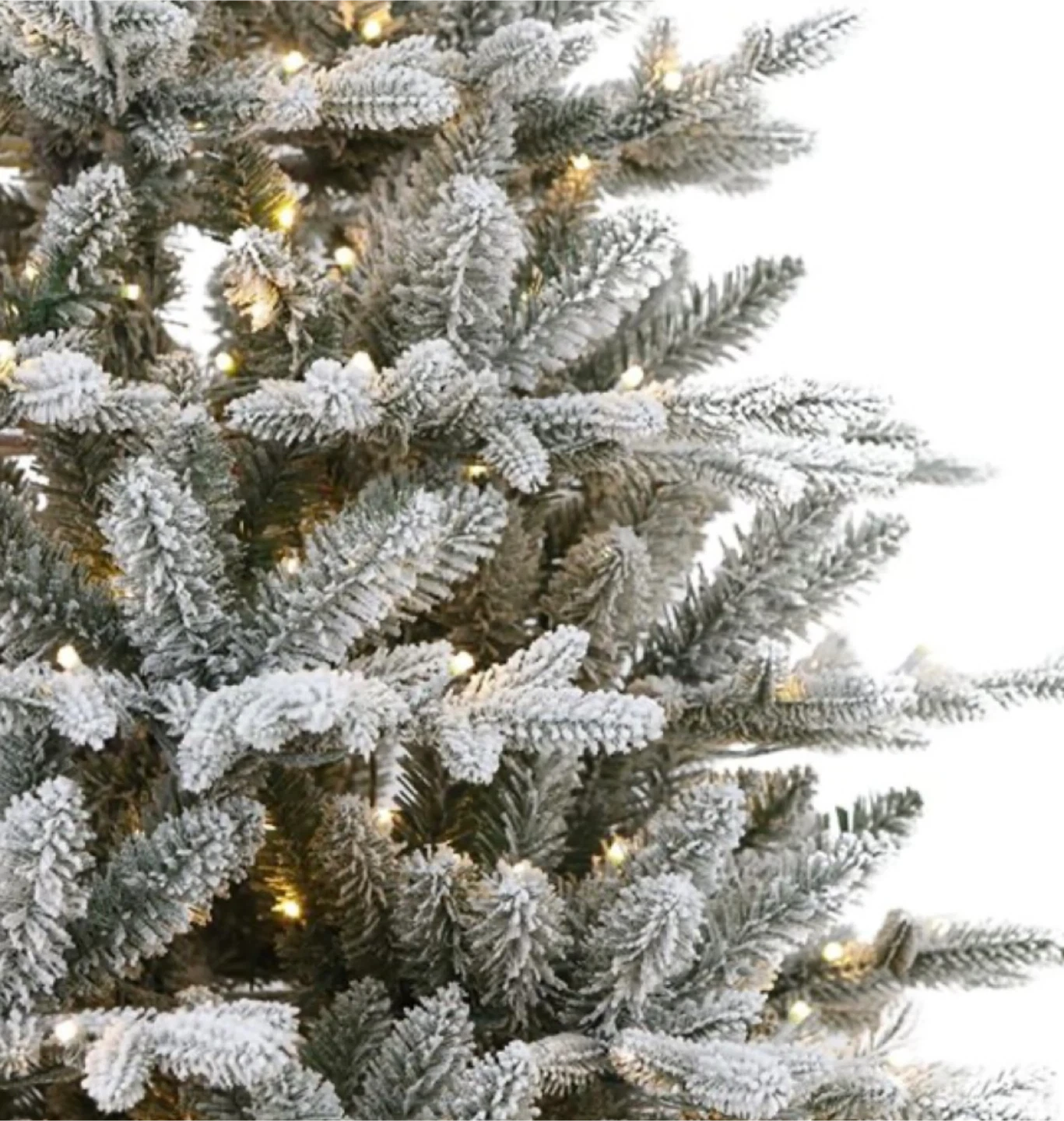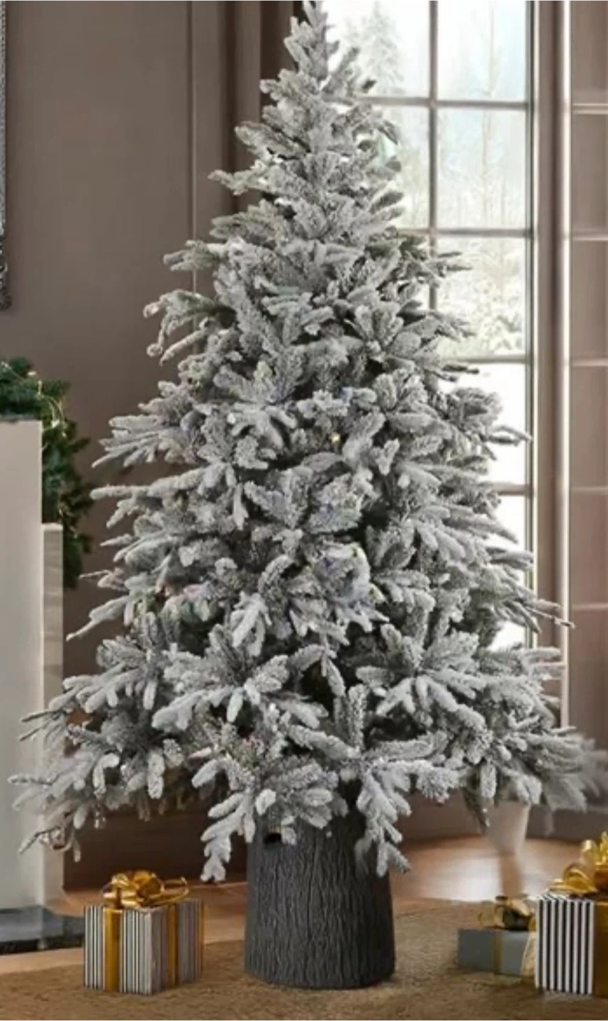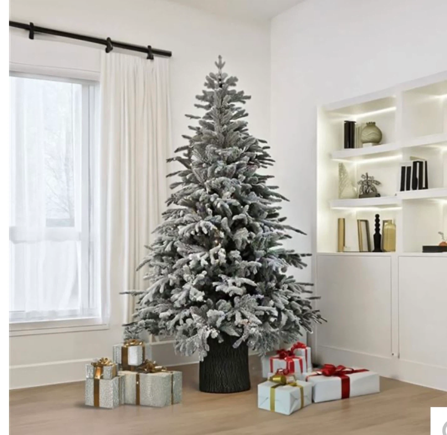 • 470 warm LED lights • 1982 Tip count • Snow flocked Frasier fir • 3-piece easy assembly • 52” wide with rotating stand Retail $539+tax