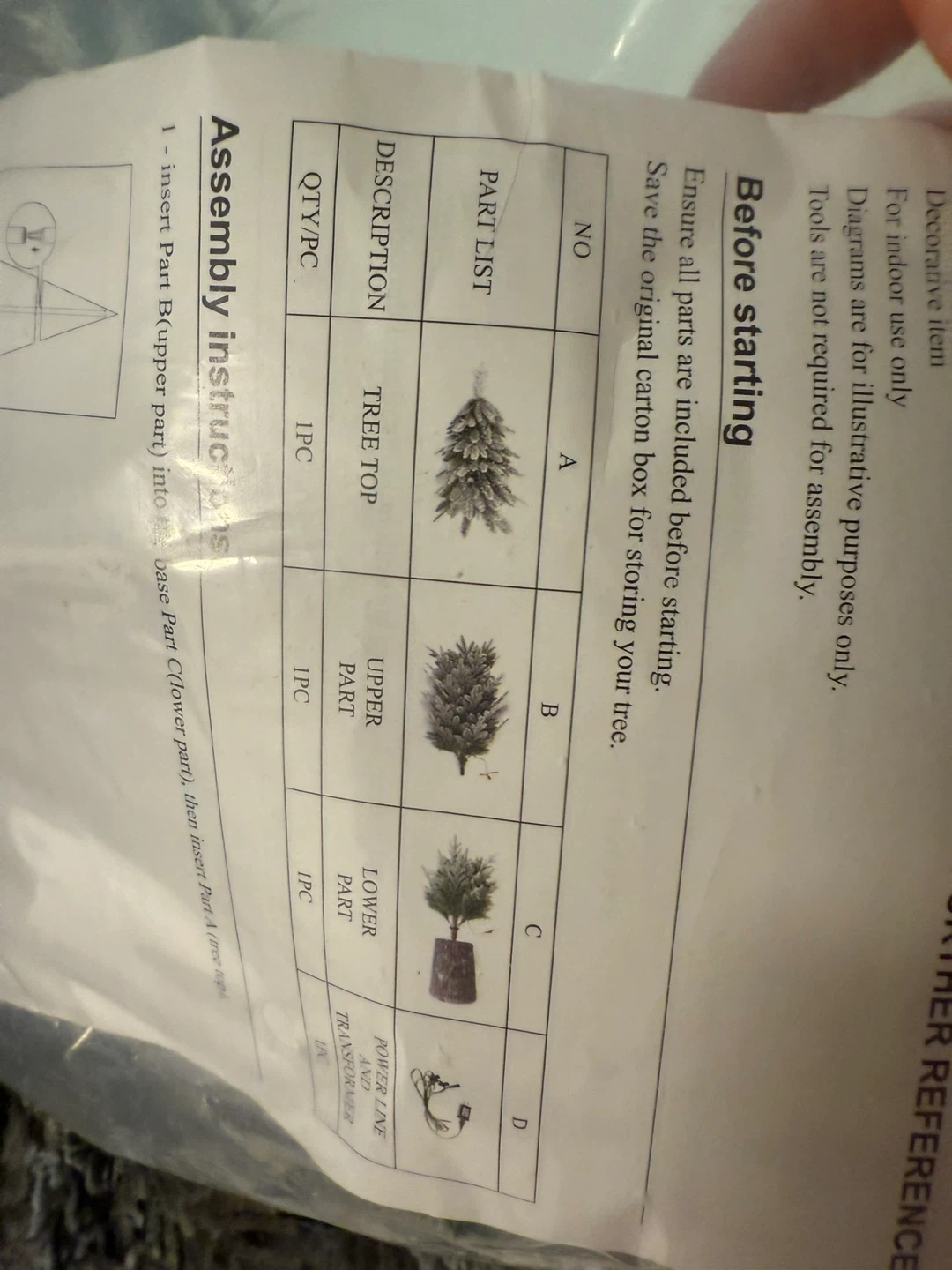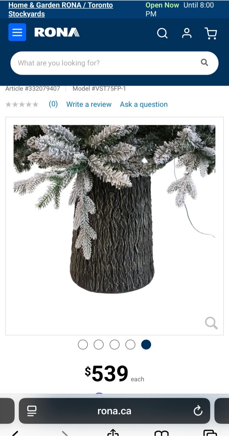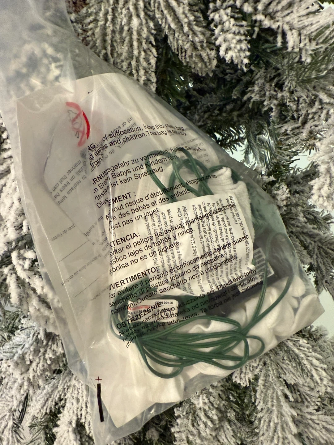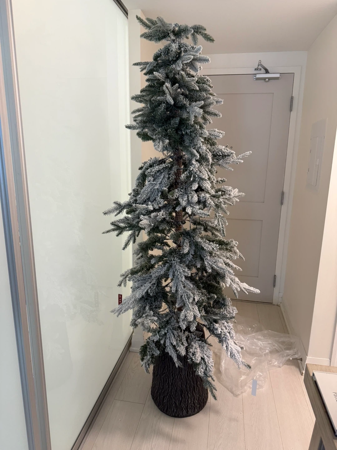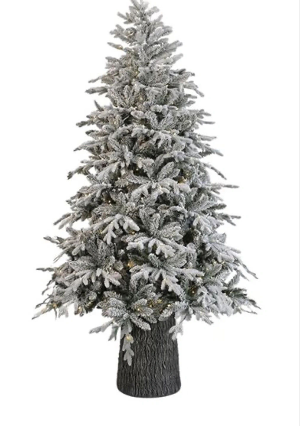 • 470 warm LED lights • 1982 Tip count • Snow flocked Frasier fir • 3-piece easy assembly • 52” wide with rotating stand Retail $539+tax