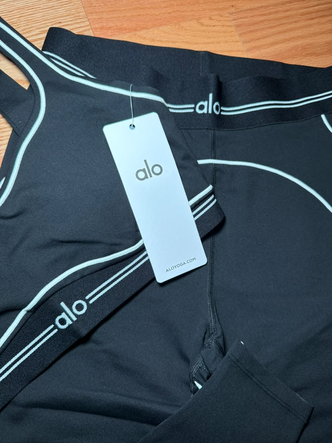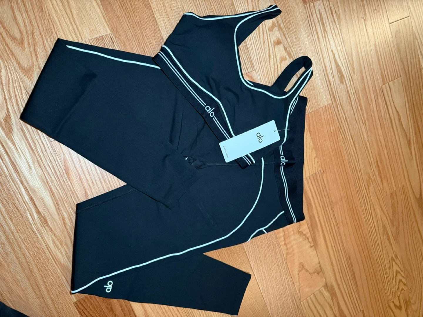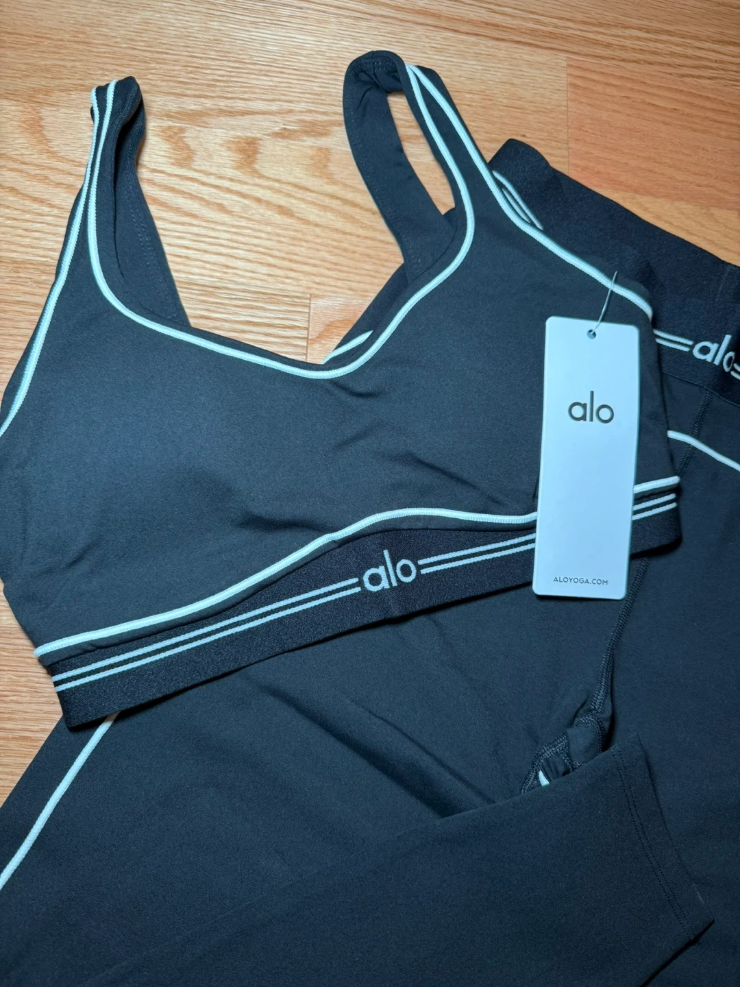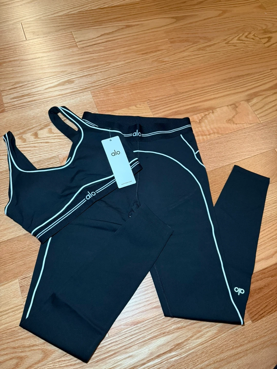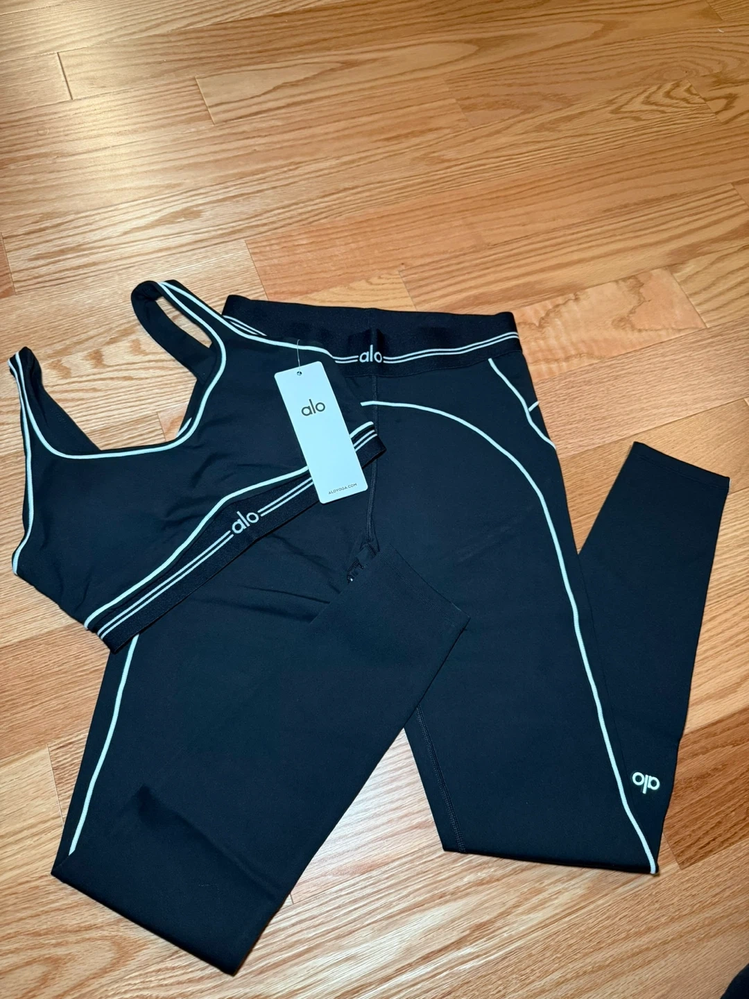5Selling a brand new Alo Yoga set! It includes a sports bra and matching leggings, perfect for your next workout or yoga session. The set features a sleek black design with the Alo logo. Never worn, with tags still attached