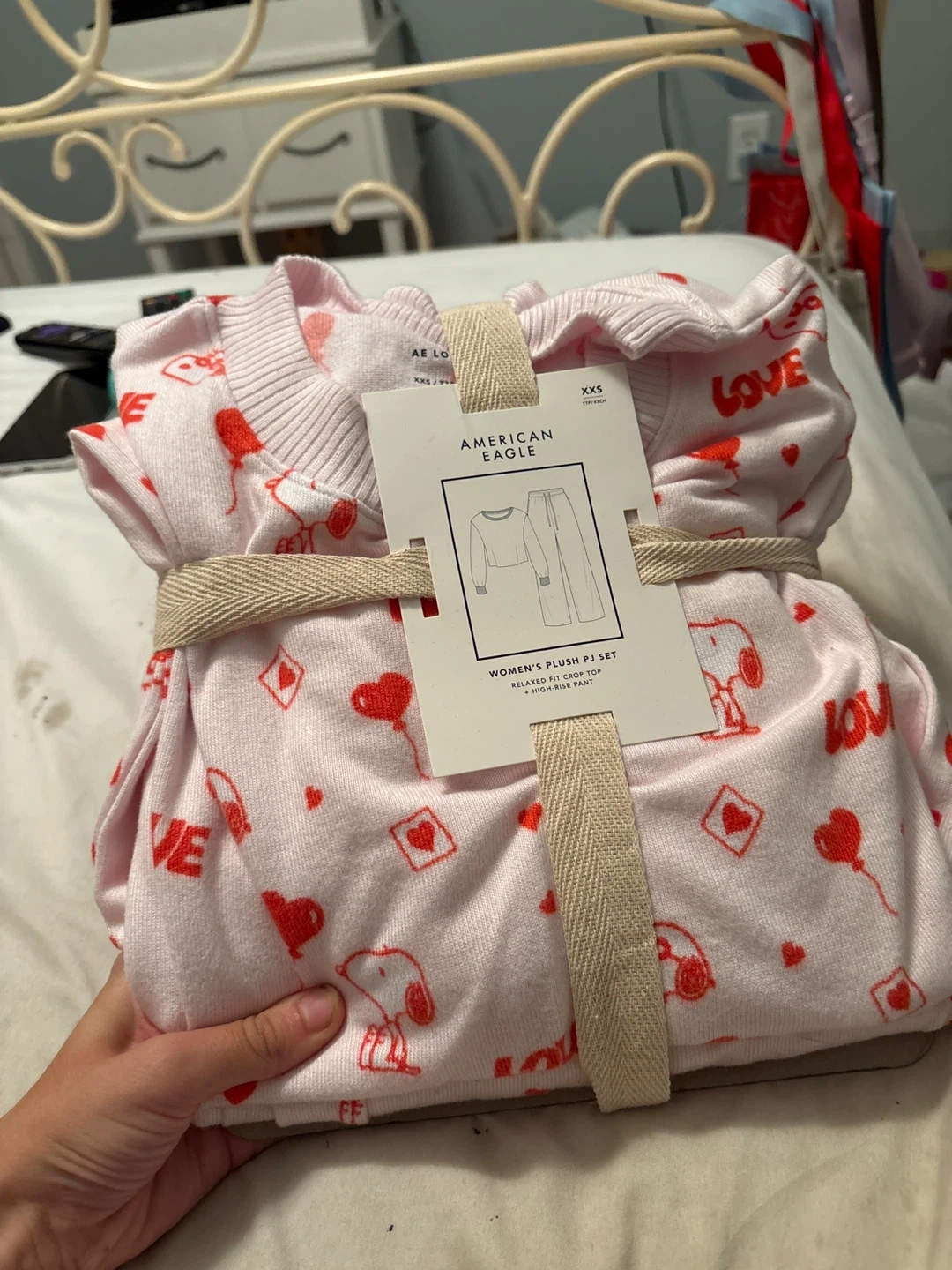 Selling a brand new American Eagle women's plush pajama set in size XXS! This adorable set features a relaxed fit crop top and high-rise pants, perfect for cozy nights in. It has a cute pattern with hearts, the word 'LOVE', and Snoopy!