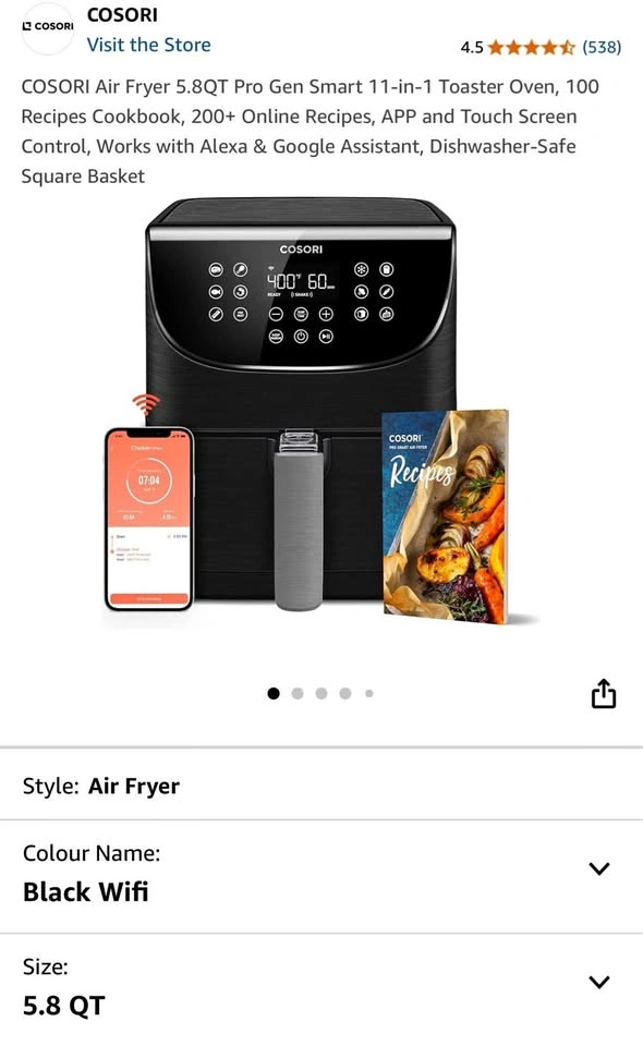 108Pair your smart air fryer with the free VeSync app to monitor cooking progress, find recipes, and set up voice control all from your smartphone. With the VeSync app, you can scan different kinds of food for easy- to-follow cooking instructions adjusted for your air fryer, plus nutrition facts. With smart control through the VeSync app, you can receive real-time cooking notifications so you can spend less time in the kitchen and more time with family and friends. Our chefs are constantly adding step-by-step original recipes to the VeSync app for endless ideas. Watch guided recipe videos or even save your own recipes for future use. Cook meals faster than a traditional oven while reducing oil content by up to 85% compared to traditional deep-fried meals for crispy textures without the health drawbacks. The removable, dishwasher-safe baskets and nonstick surfaces are free from BPA and made without PFOA, keeping cleanup simple. Enjoy hands-free control by connecting your smart air fryer to Amazon Alexa or Google Assistant and access remote control options through the free VeSync app. Prep enough food to feed the whole family with the 5.8-quart basket that fits a whole rotisserie chicken or food for up to 3–5 people. Our friendly California-based customer service team is here to help. NOTE: This smart air fryer requires a 2.4GHz Wi-Fi network to operate with the VeSync app. The air fryer is ETL Listed. Temperature Range: 170°–400°F / 77–204°C, Power Supply: AC 120V, 60Hz (US/CA only). Pick up - Courtice. Please check my other listings!
