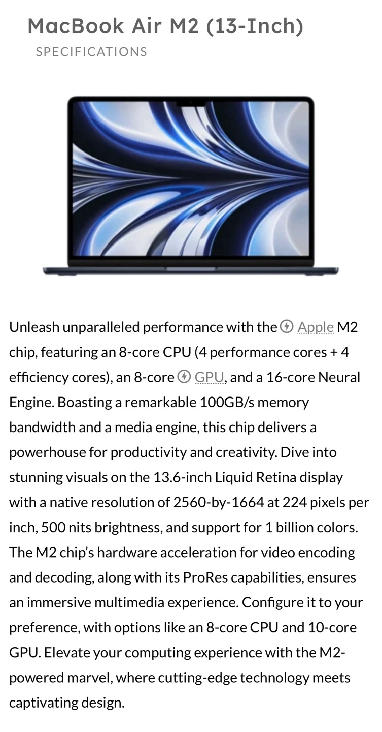 10For Sale: Brand New 13-inch MacBook Air with Apple M2 Chip – $1200 Perfect for work, study, and creative projects. Serious inquiries only. Contact to buy! Color: Midnight Blue Condition: Brand new, unopened box Processor: Apple M2 chip with 8-core CPU (4 performance cores + 4 efficiency cores) and 8-core GPU Memory: 16 GB unified memory for smooth multitasking Storage: 256 GB SSD for fast data access Display: 13.6-inch Liquid Retina LED-backlit display with True Tone technology, 2560 x 1664 resolution, 500 nits brightness Ports: MagSafe 3 charging port, two Thunderbolt / USB 4 ports, headphone jack Audio & Camera: Four-speaker sound system, 1080p FaceTime HD camera Keyboard: Full-size backlit Magic Keyboard with Touch ID Wireless: Wi-Fi 6 and Bluetooth 5.3 Operating System: Preinstalled macOS Battery: Up to 18 hours battery life Weight: Lightweight at 2.7 pounds (1.24 kg) Includes: MacBook Air, USB-C Power Adapter, USB-C to MagSafe 3 Cable Energy Efficient: Meets ENERGY STAR® requirements
