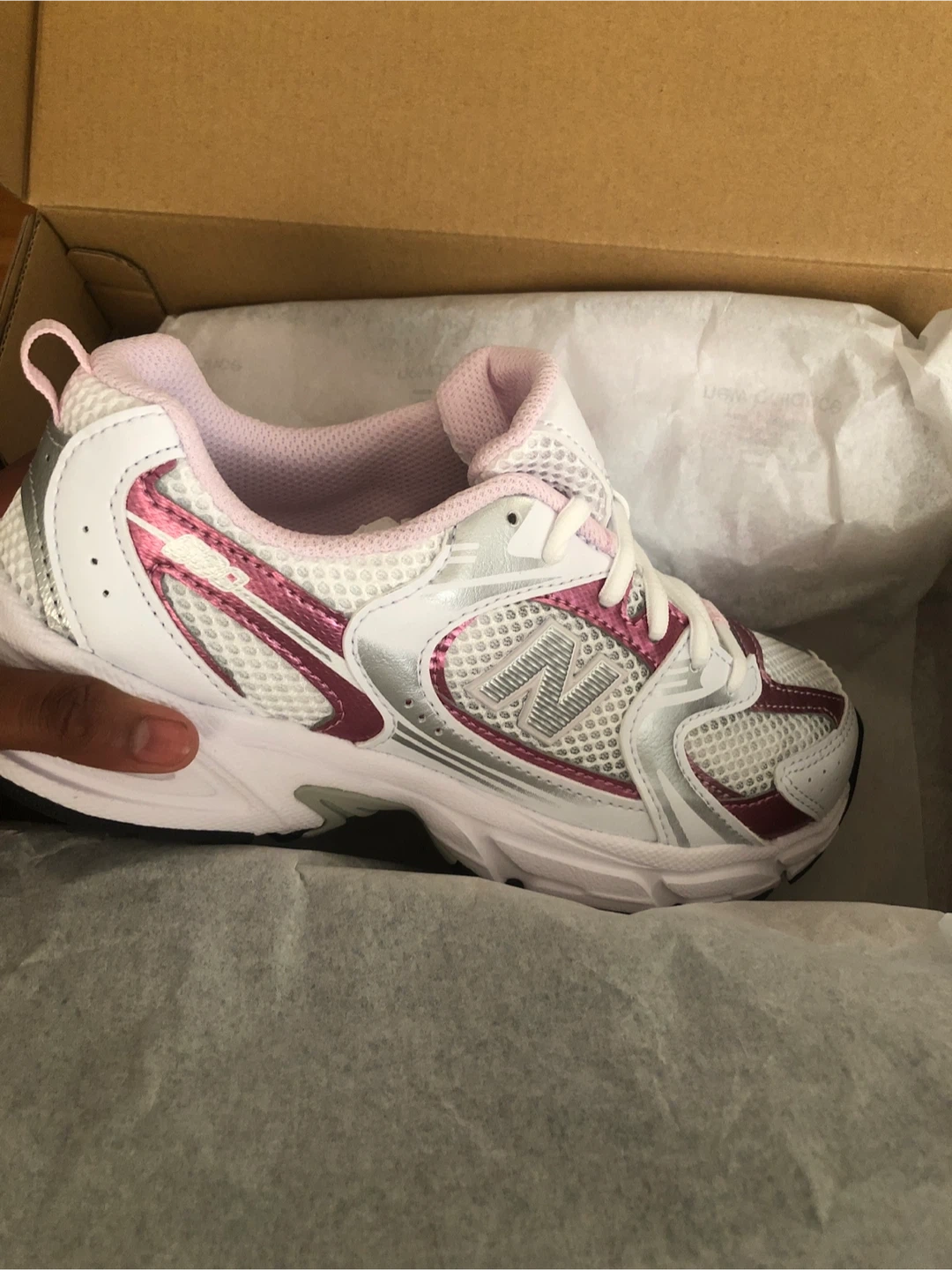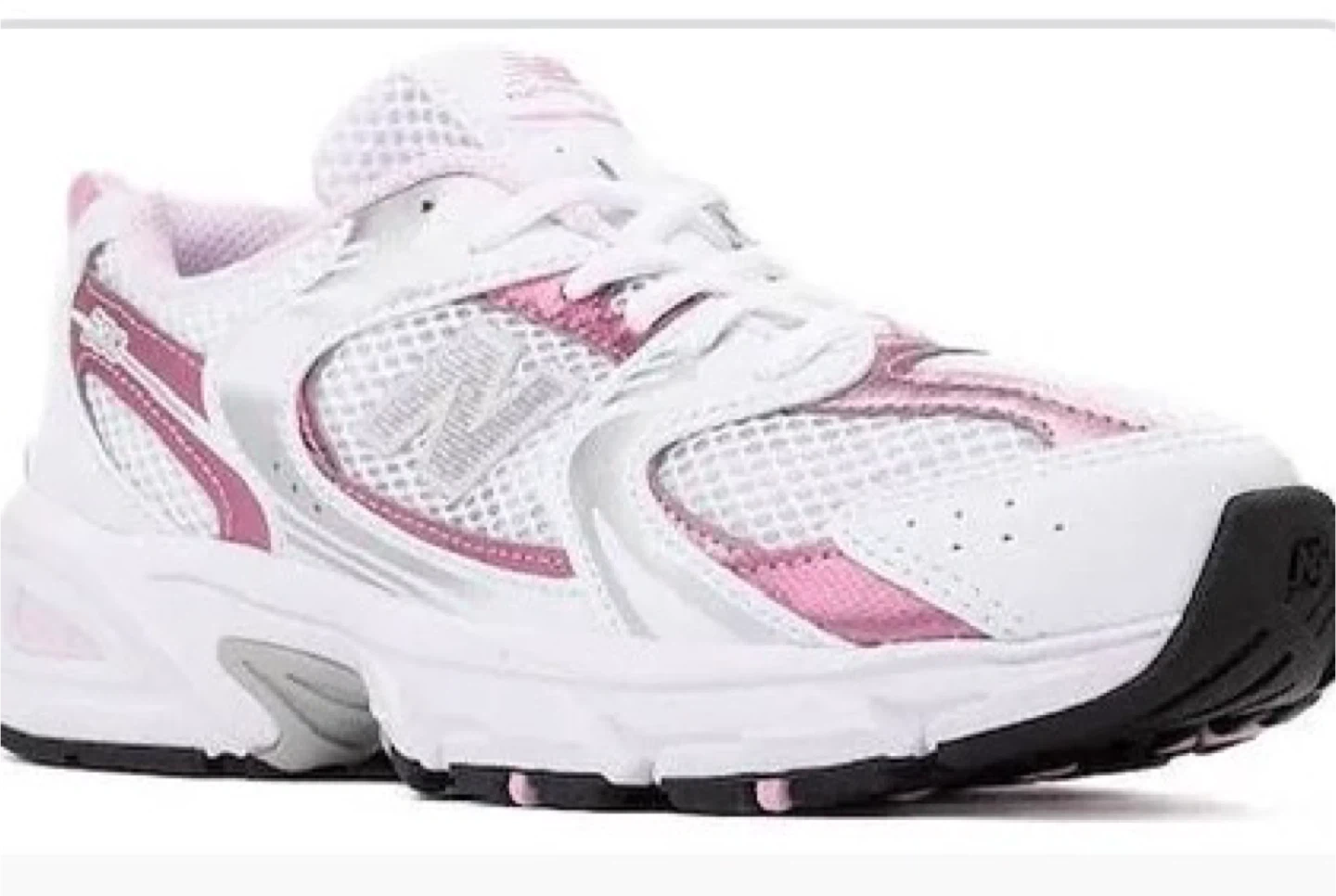 Selling a pair of New Balance 530 running shoes in white and pink. They are in great condition and perfect for running or everyday wear!