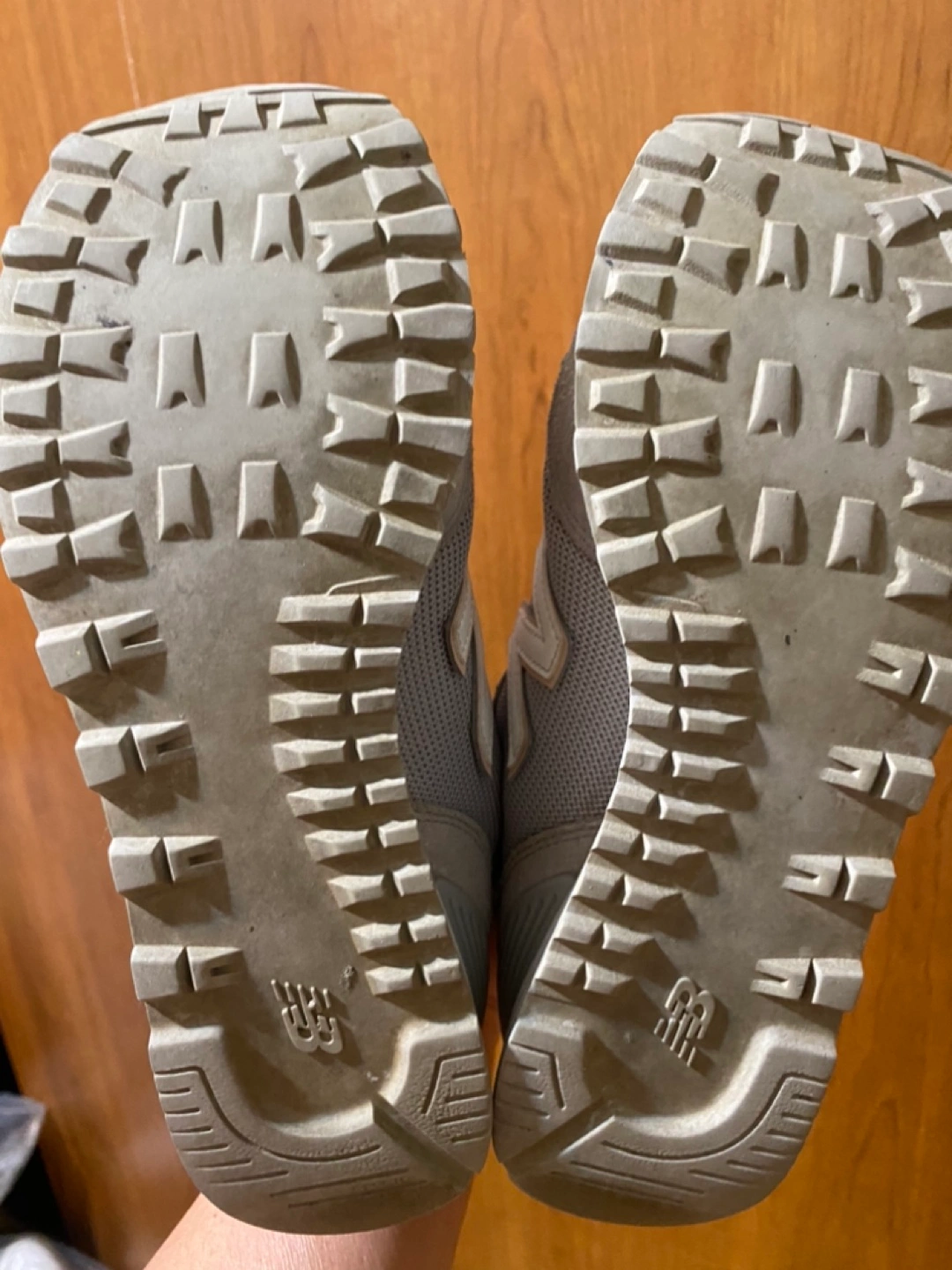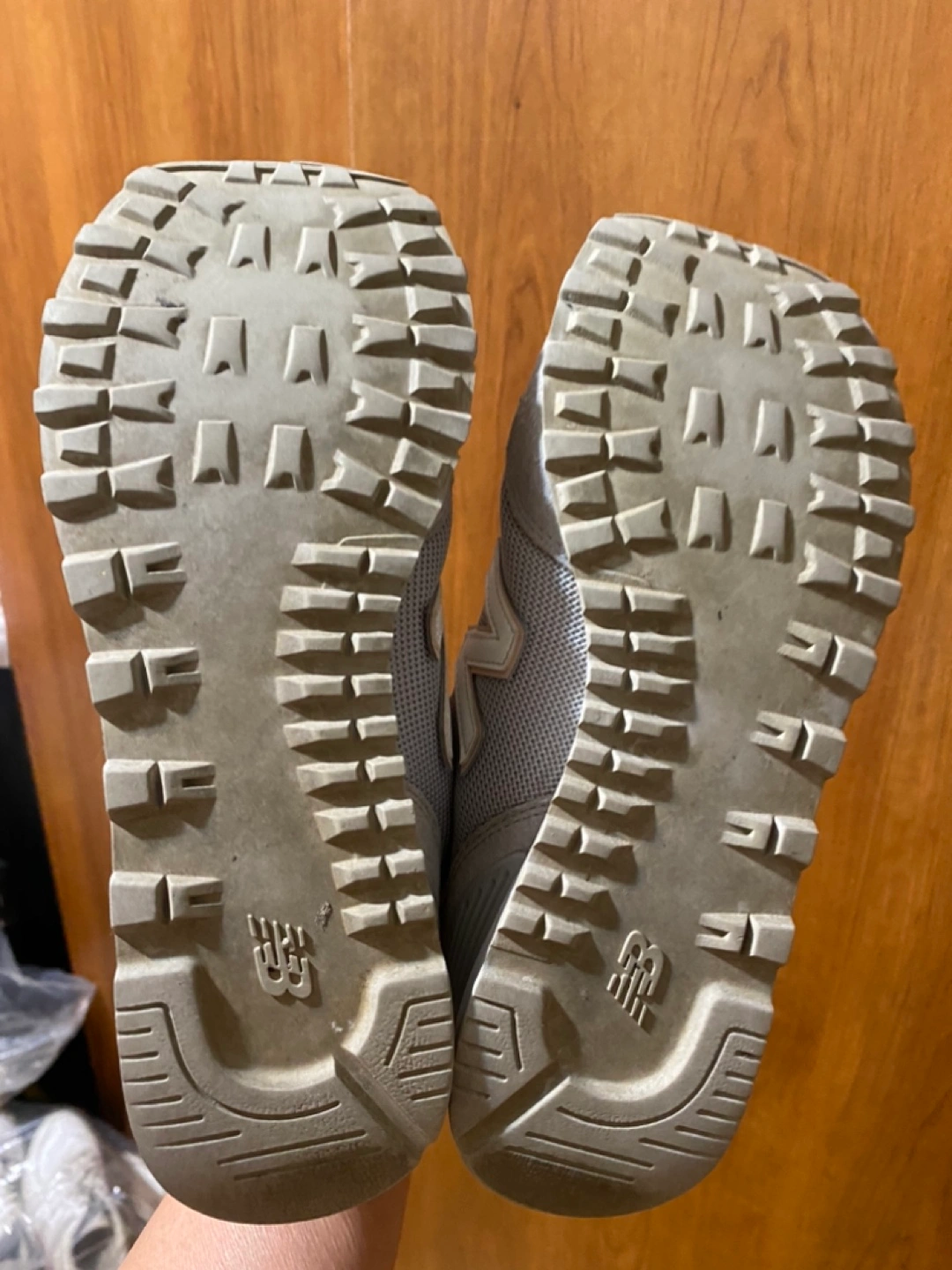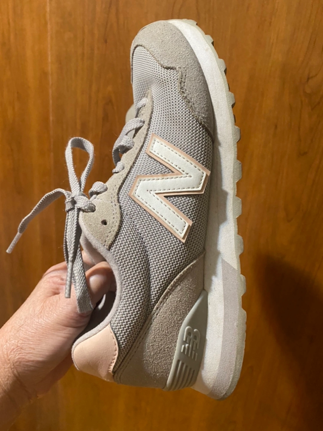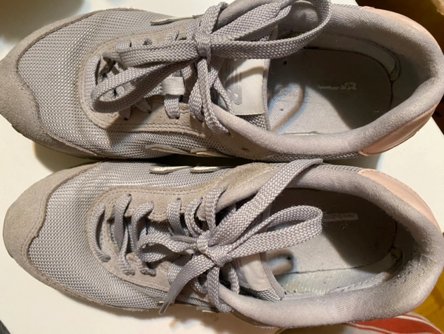 115Grey and white sneakers with pink accents. Lace-up closure.