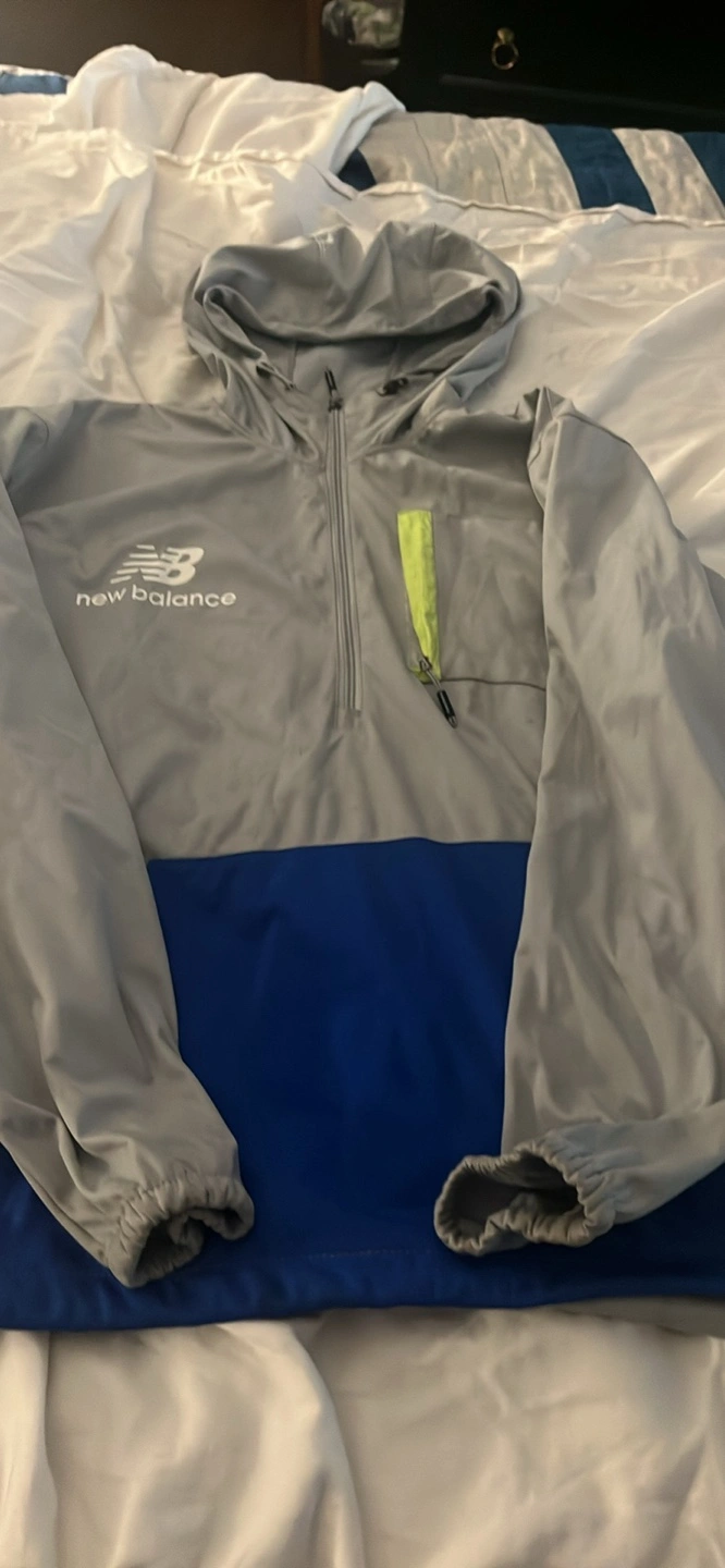 Keep the wind at bay with this stylish New Balance pullover windbreaker! It features a grey and blue colour block design, perfect for those breezy days. The jacket has a convenient quarter-zip and a hood for extra protection. Stay comfortable and look good while doing it!